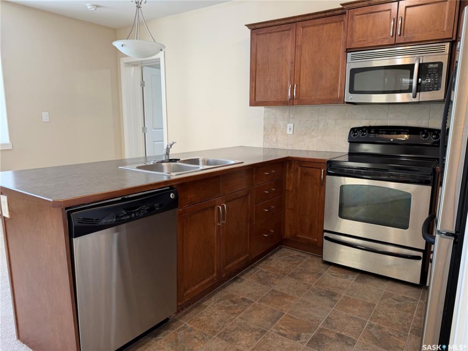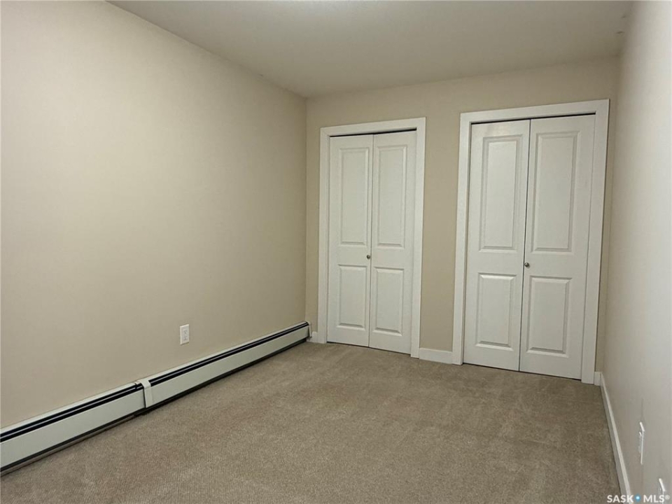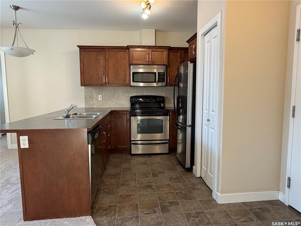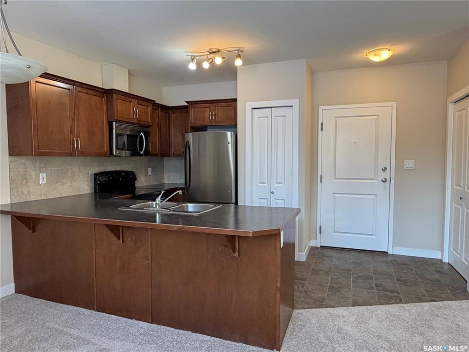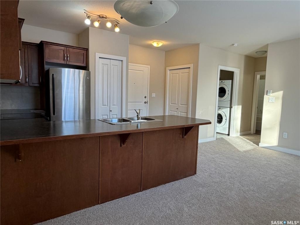 Two bedroom condo unit located in Bemister Place Condos on the East side of Melfort, located close to schools, parks & Parkland Place! This unit faces East, viewing the greenspace that has a covered patio with benches and tables for socials. Shaker style, maple, cabinets provides an abundance of counter space with overhang for stools, if desired. Includes fridge, stove, dishwasher & microwave. Laundry room includes washer & dryer. Main bedroom of the two, offers double closets. Full bath. This unit is located closest to the South West exterior access. The condo building is two levels, with an elevator. Parking stall #101.