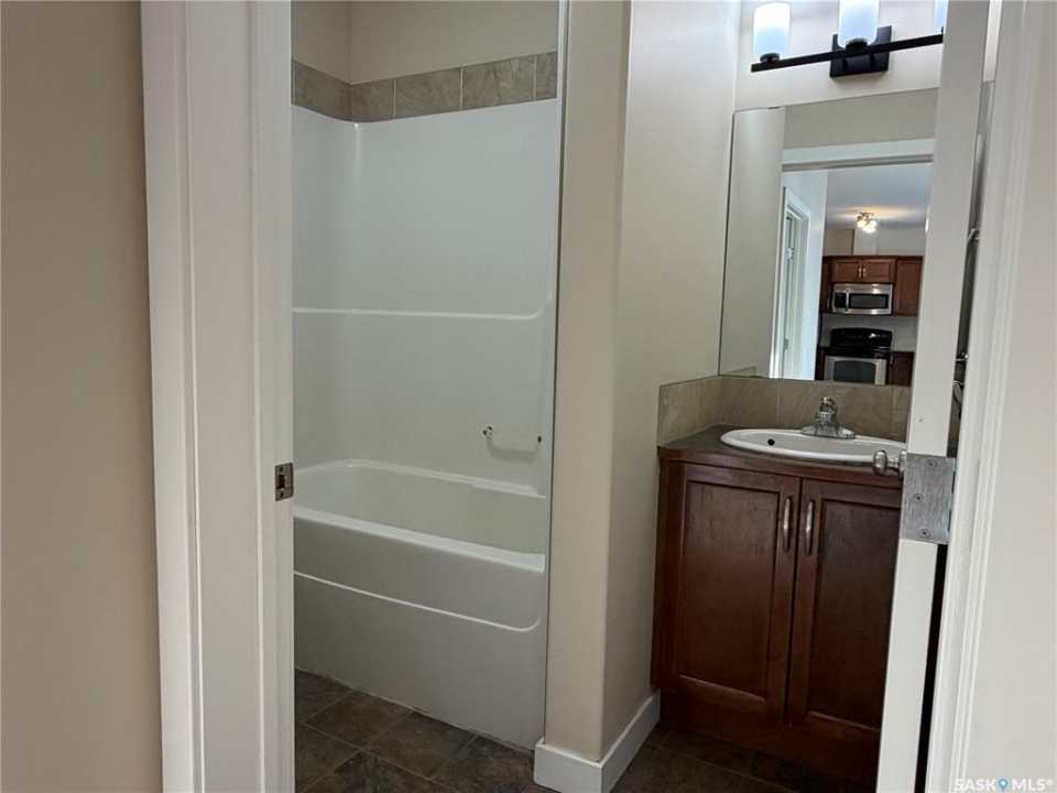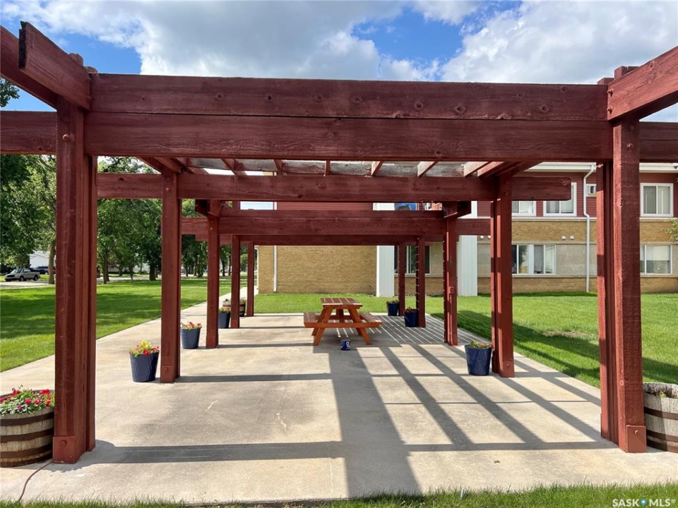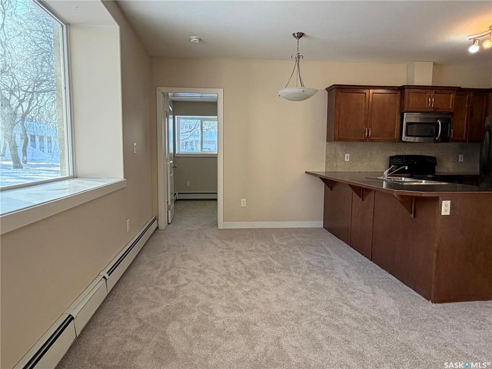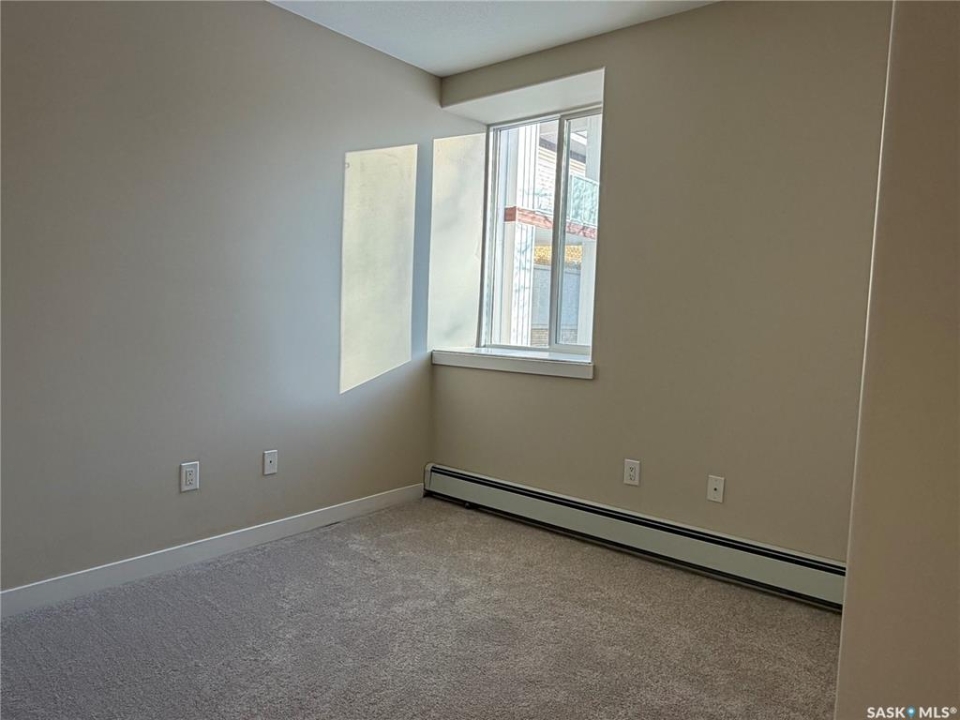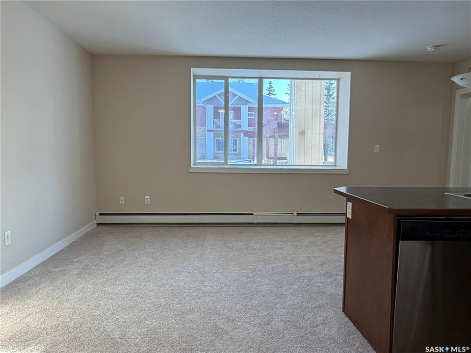 Two bedroom condo unit located in Bemister Place Condos on the East side of Melfort, located close to schools, parks & Parkland Place! This unit faces East, viewing the greenspace that has a covered patio with benches and tables for socials. Shaker style, maple, cabinets provides an abundance of counter space with overhang for stools, if desired. Includes fridge, stove, dishwasher & microwave. Laundry room includes washer & dryer. Main bedroom of the two, offers double closets. Full bath. This unit is located closest to the South West exterior access. The condo building is two levels, with an elevator. Parking stall #101.