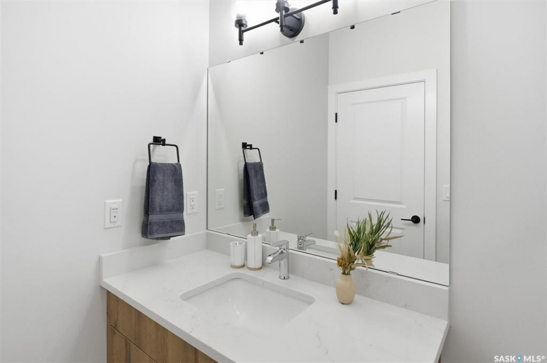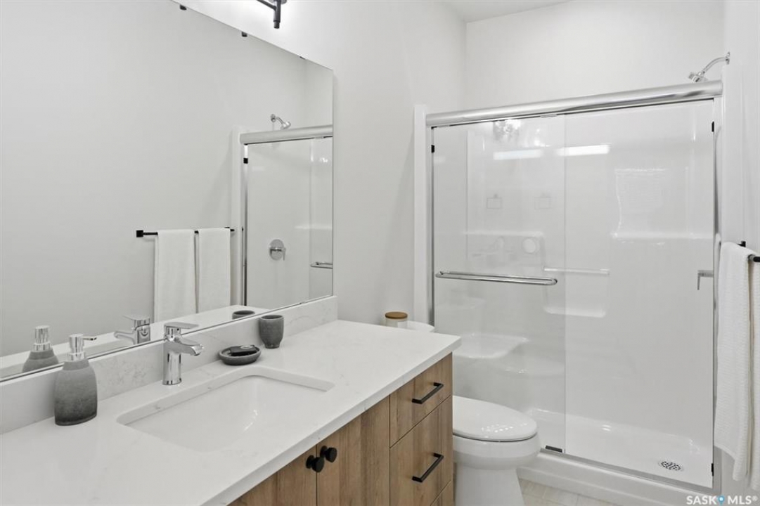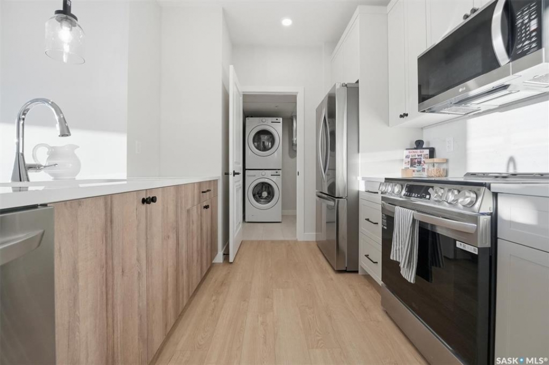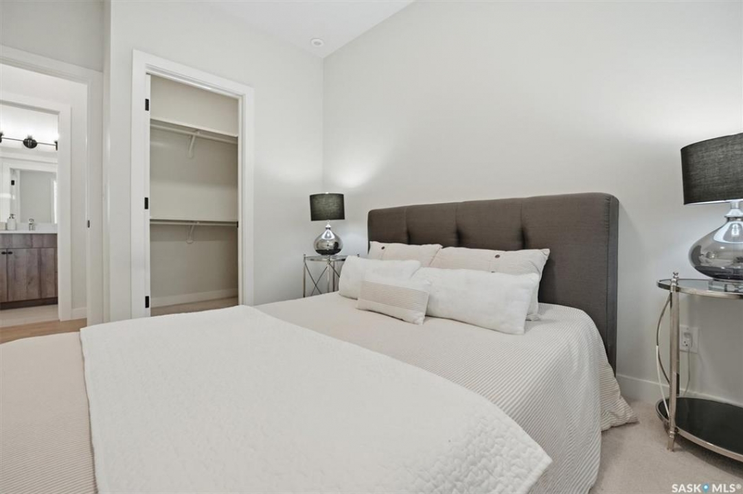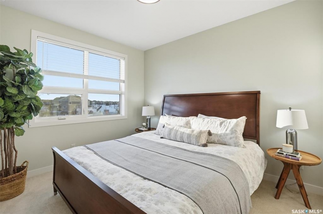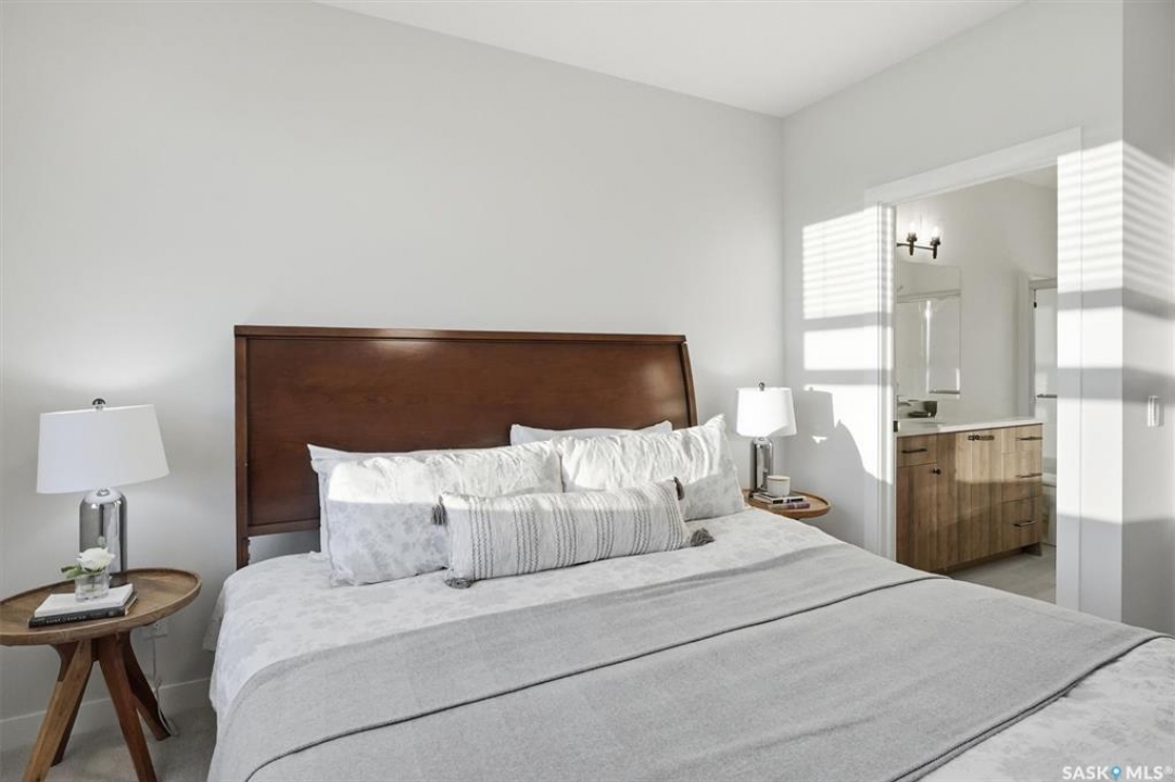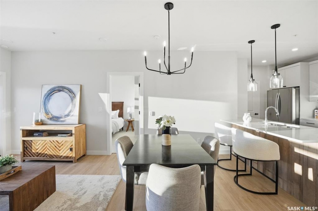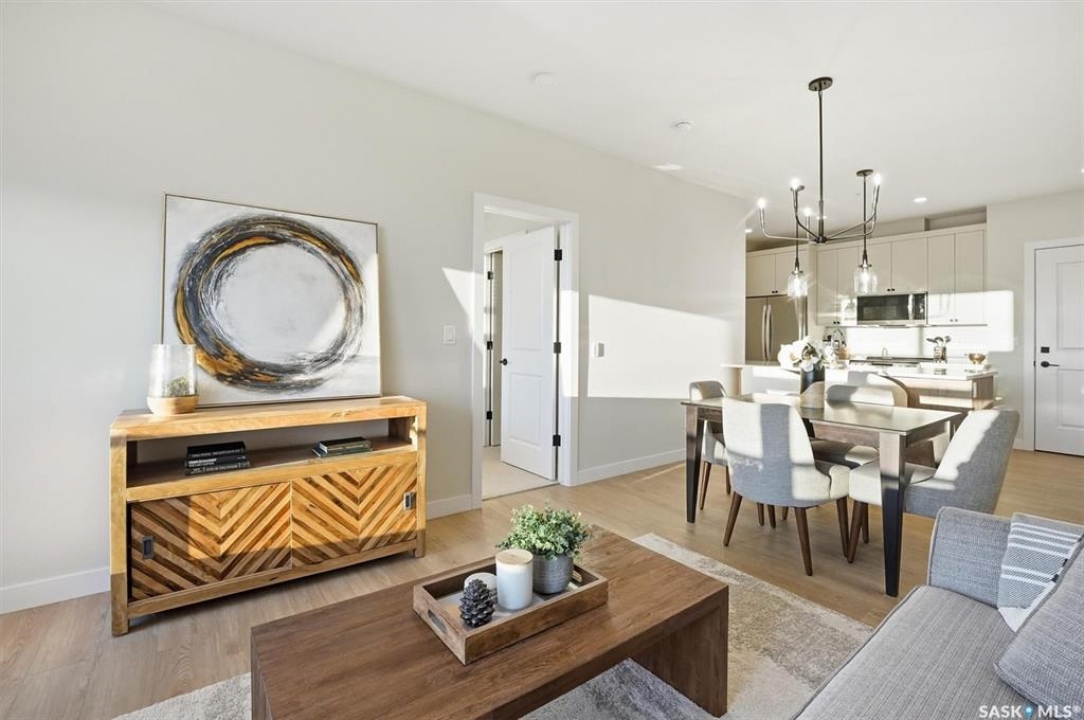 Welcome to ‘RYSE by North Ridge' located in Saskatoon's growing community of Brighton! RYSE is a modernized apartment style condominium complex offering 1 bedroom, 2 bedroom, and 2 bedroom + den options. You will immediately notice the welcoming nature of RYSE the moment you step into the warm and inviting front entrance. Unit 1203 (Skyline layout) is a south east facing 964 sq ft condo with 2 bedrooms, 2 bathrooms, a den, separate laundry room, galley style kitchen, and dining/living areas. The interior features high end designer finishes, fixtures, countertops, and flooring, all with quality built craftsmanship. A private partially covered balcony awaits complete with duradeck, glass railing, natural gas bbq outlet, and electrical outlet. Each condo unit comes with a parking stall located in the heated parkade as well as a convenient storage room. Exterior parking stalls may be available to purchase. Each unit also includes a kitchen and laundry appliance package and air conditioning. RYSE has an amenity room for you to visit and relax featuring a bar area, comfortable seating, pool table, bathroom, and an outdoor patio lounge. GST and PST included in purchase price with any rebates to builder. Sask Home Warranty Premium Coverage Plan. This prime location is within a few minute walk to grocery/shopping/restaurants/bus and several other amenities. Show home hours are Mon thru Thurs 5-8PM and Weekends 12-5PM. Call to view!