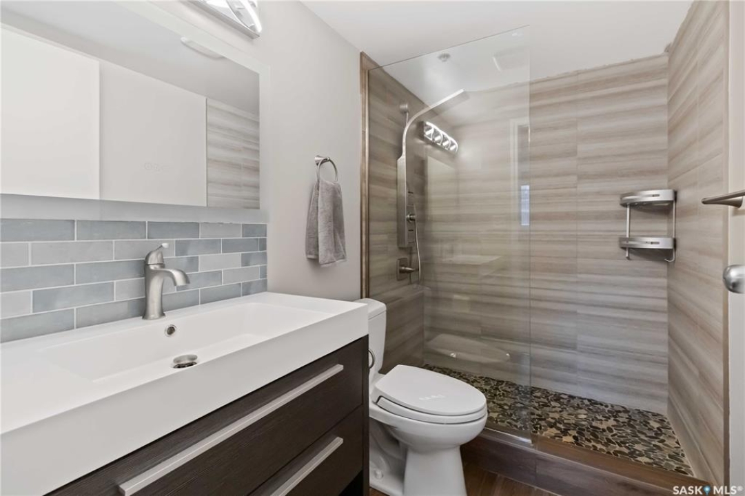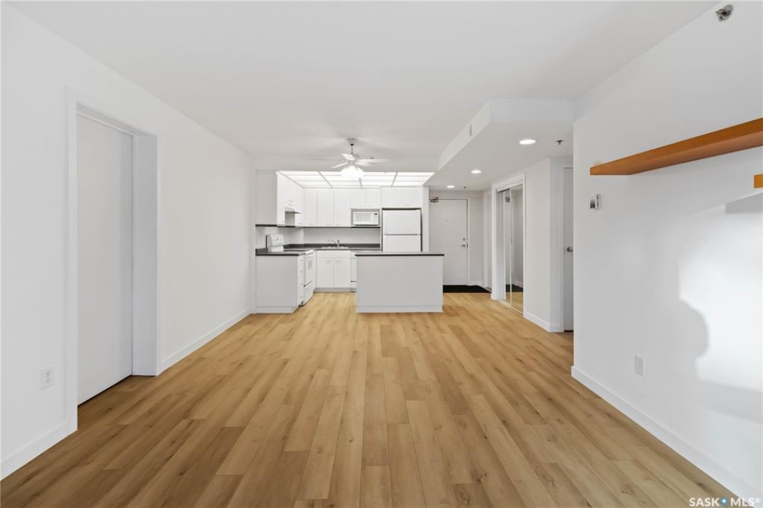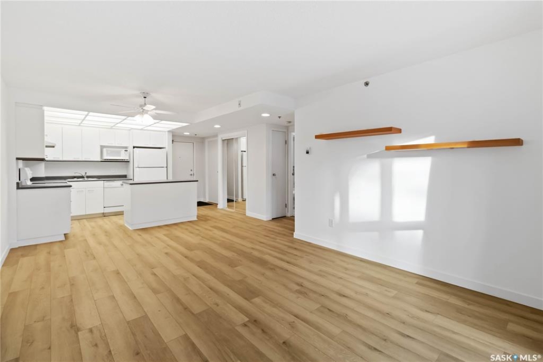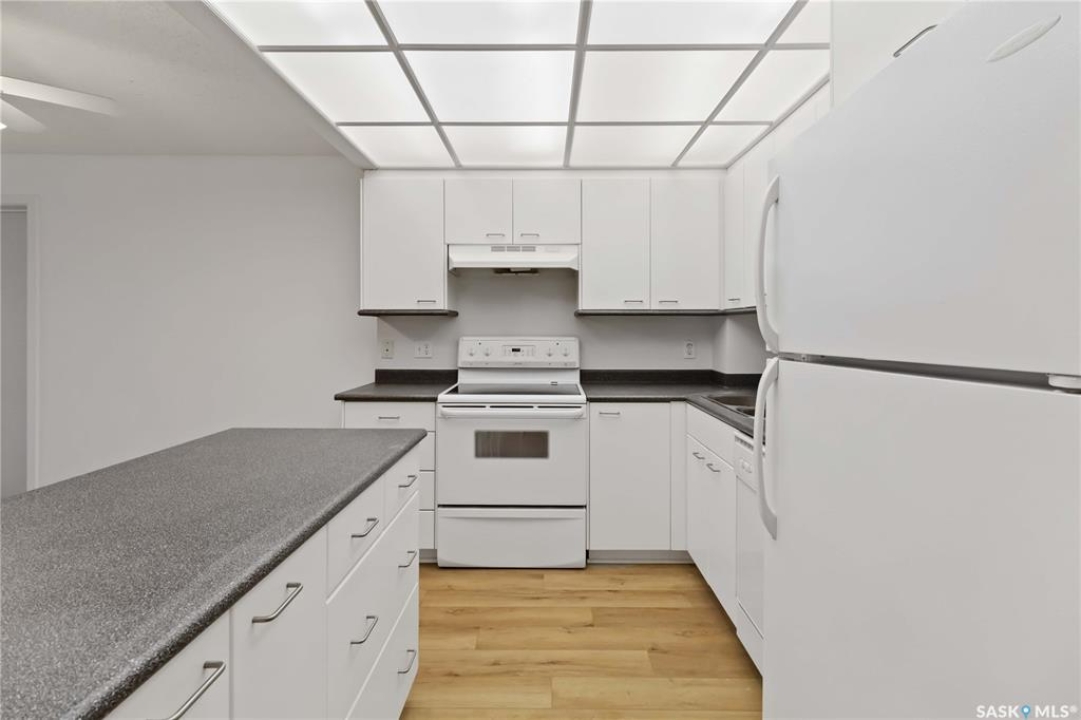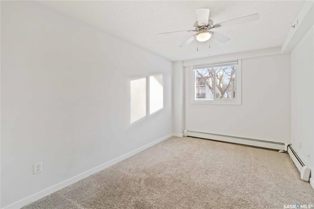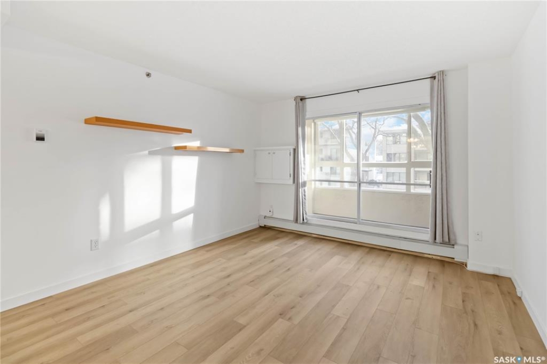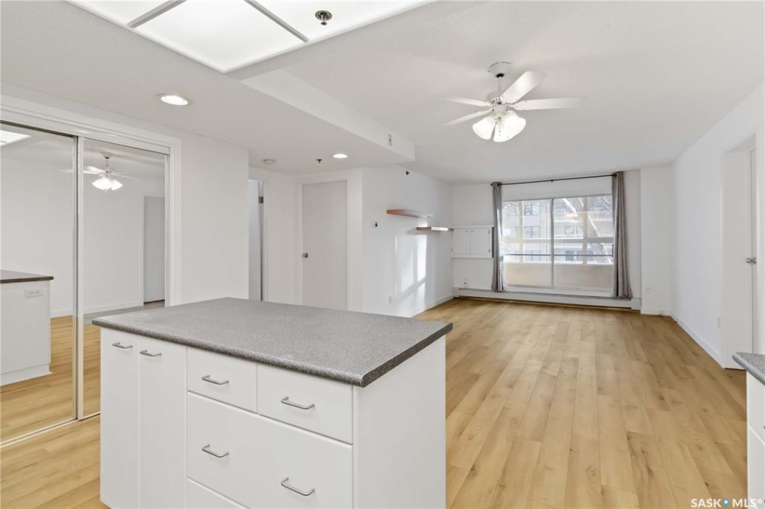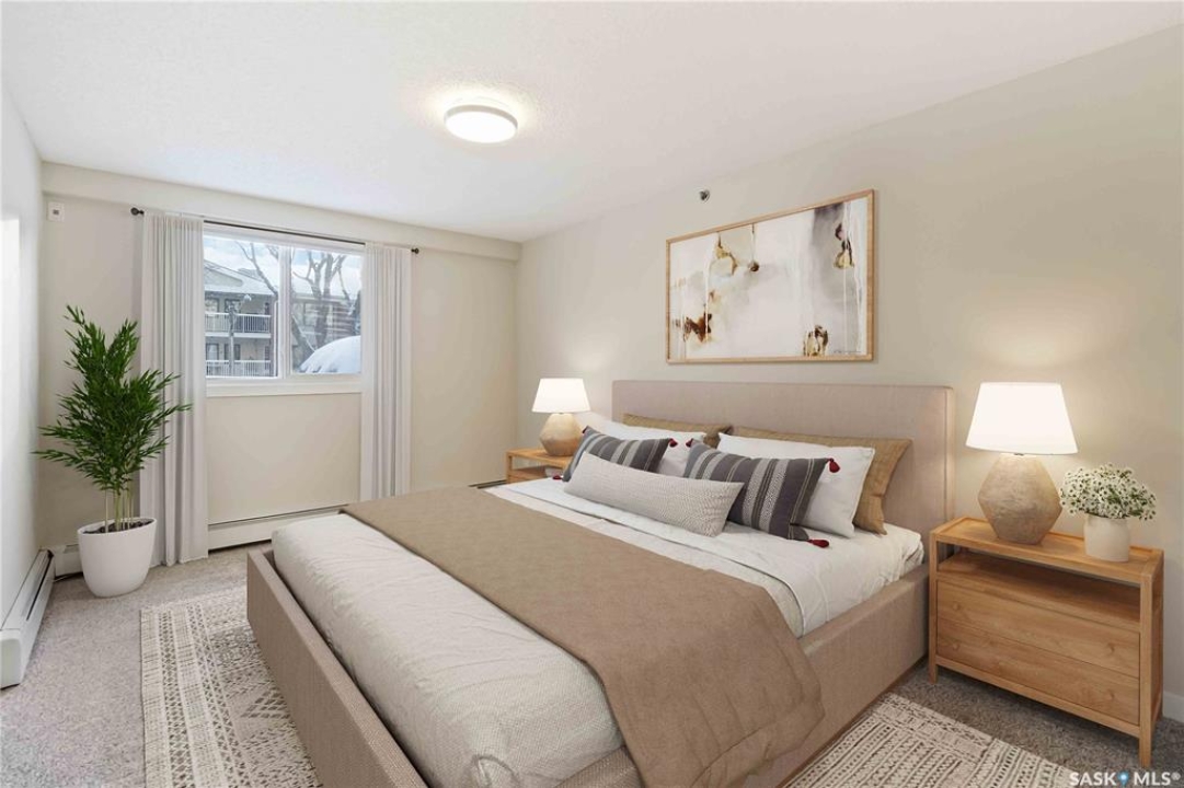 Spacious 990 sq. ft. two bedroom, two bathroom condominium apartment in the desirable City Park area. Generous primary bedroom with a renovated 3 piece ensuite and a second bedroom for a roommate or family member with a renovated 4 piece bathroom just down the hall. The kitchen boasts an island with a dining room/area. Laundry room with washer and dryer (2021) with storage area. All three exterior windows replaced new in (2024). Air Conditioner (2025) New vinyl plank flooring in (2026). Sun Room just off the living room for those bright summer days. One electrified parking spot included in behind the garage door for your security. Amenities room is on the same floor down the hallway for your use to have large groups over. There is also a roof top patio for entertaining friends or to have some downtime taking a view of the city. The City Park area is perfect for accessing downtown amenities, mere foot steps from City Hospital, Kinsmen Park, walking distance to the University of Saskatchewan, or some beautiful walks down by the South Saskatchewan River. Unique to the Building is the 1st floor elevated approximately 10 feet above ground level. NOTE: Bedrooms and Living Room are virtually staged. Give your REALTOR � a call today to view this beautiful property.