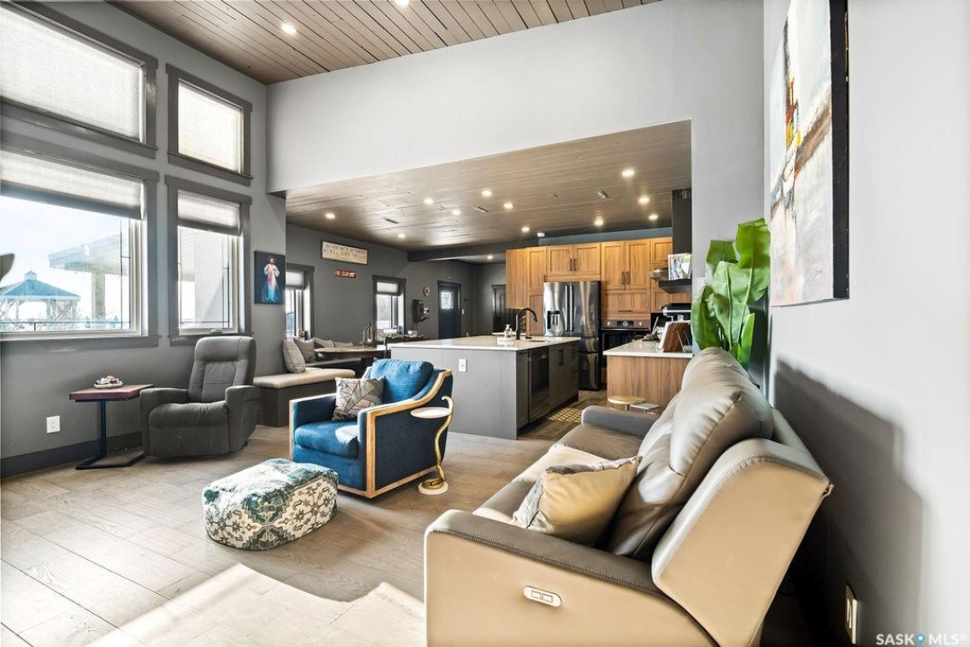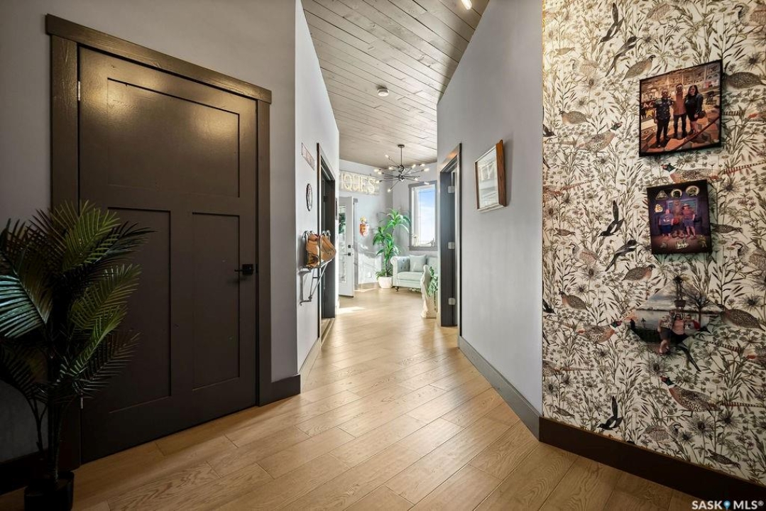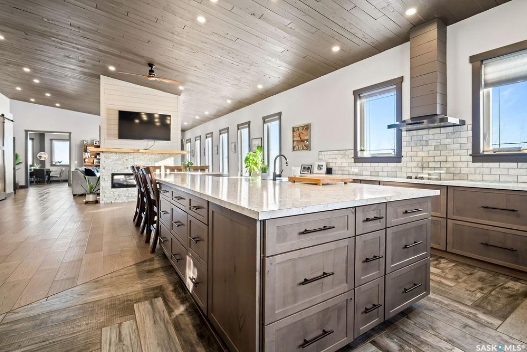One-of-a-kind acreage located just 15 minutes from Estevan and 10 minutes from Lampman, offering exceptional space, versatility, and lifestyle potential on a beautifully maintained 5.10-acre parcel in the RM of Benson No. 35. This impressive 2016-built bungalow offers approximately 5,400 sq. ft. of thoughtfully designed living space and features two separate living quarters, ideal for multi-generational families or guest accommodation. The home includes 6 bedrooms, 4 bathrooms (an addtional bathroom in the shop), multiple living areas, and dedicated office space, with both primary bedrooms showcasing full en suite bathrooms finished with tiled flooring and tiled tub and shower surrounds. Quality interior finishes include engineered hardwood throughout the main living areas, tile in kitchens and bathrooms, custom wood moldings, and stylish lighting, while high vaulted ceilings and large windows flood the home with natural light. Each living room features a fireplace, including a striking double-sided fireplace shared with a massive chef's kitchen designed for everyday living and entertaining. Additional spaces include a bright bar and games room surrounded by windows and a closed-in hot tub room overlooking the landscaped yard. Comfort features include in-floor heat, central air conditioning, and air exchange. The attached heated 5,500 sq. ft. shop is divided into three bays with overhead door access, offering excellent flexibility for personal or commercial use. The bay connected to the home includes an additional bathroom, laundry hookups, and a commercial-grade exhaust fan. The yard is fully manicured with multiple sprinkler zones supplied by the well and programmable from your phone. A detached outbuilding with concrete floor and tin siding, currently used as a chicken coop, adds further versatility. Zoned AG/RES/COMM, this rare acreage offers outstanding residential comfort with exceptional shop space close to both communities.