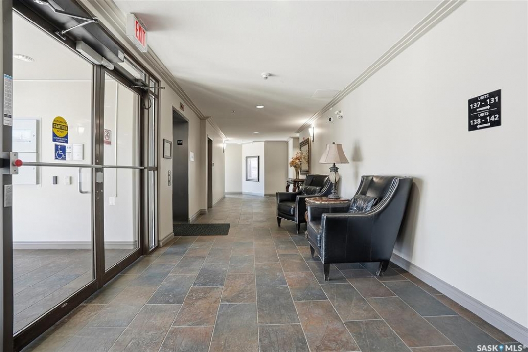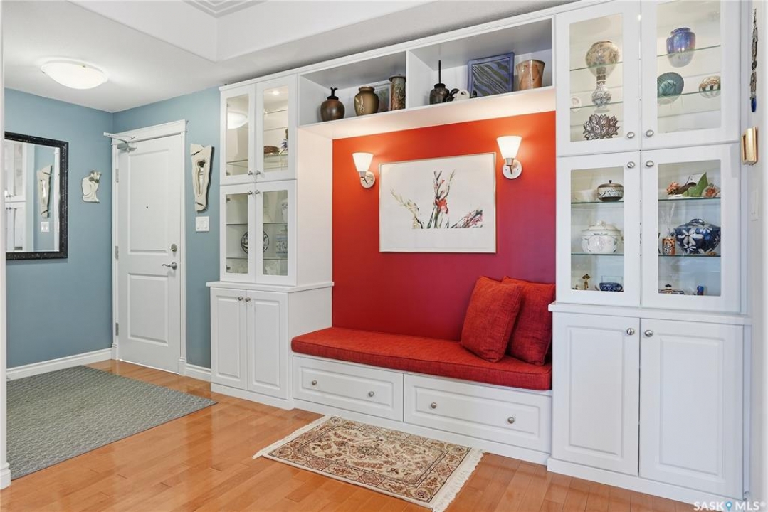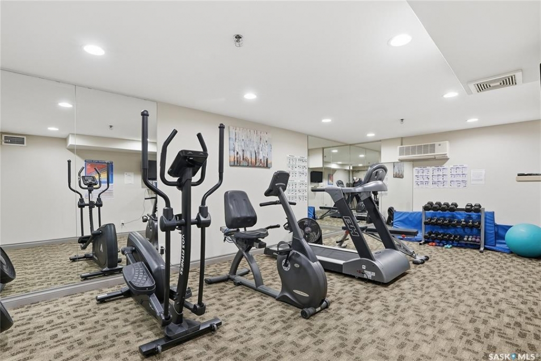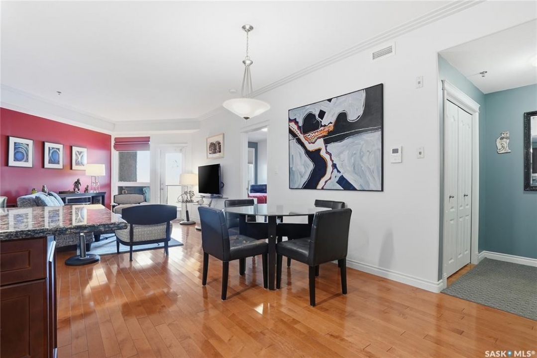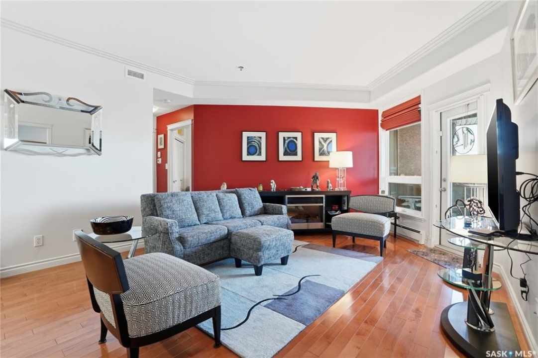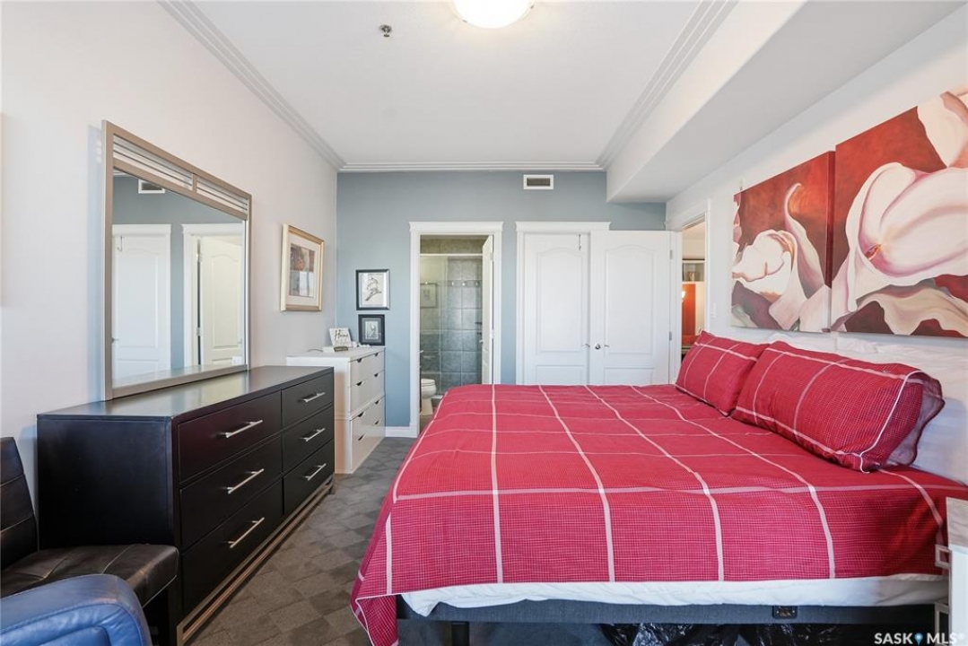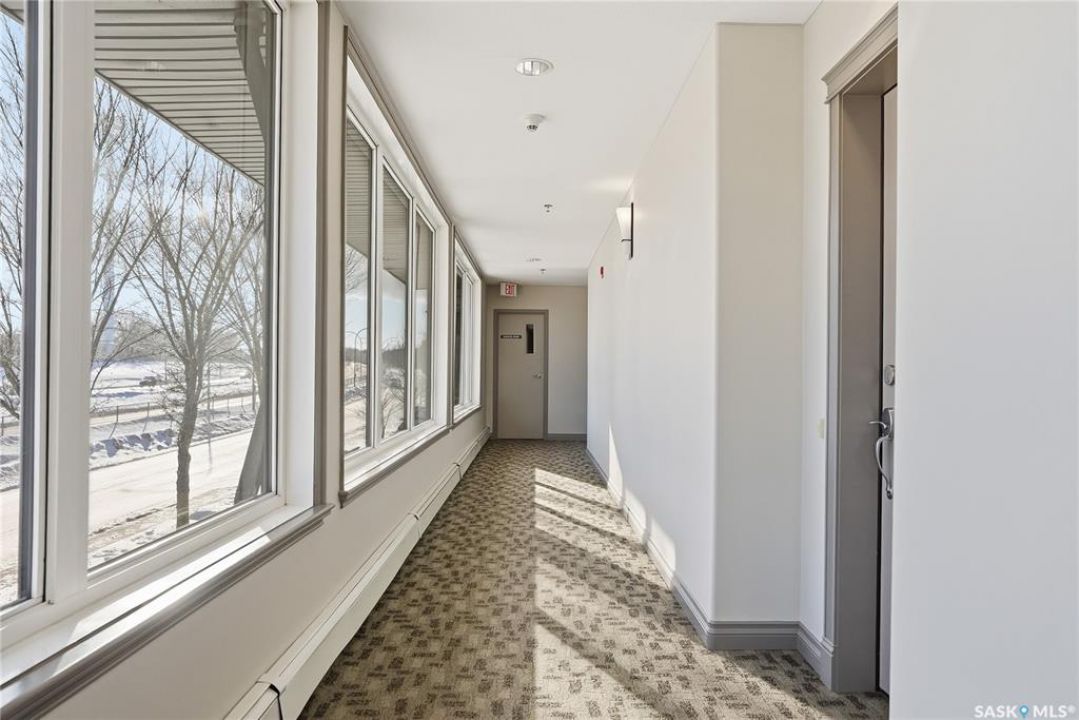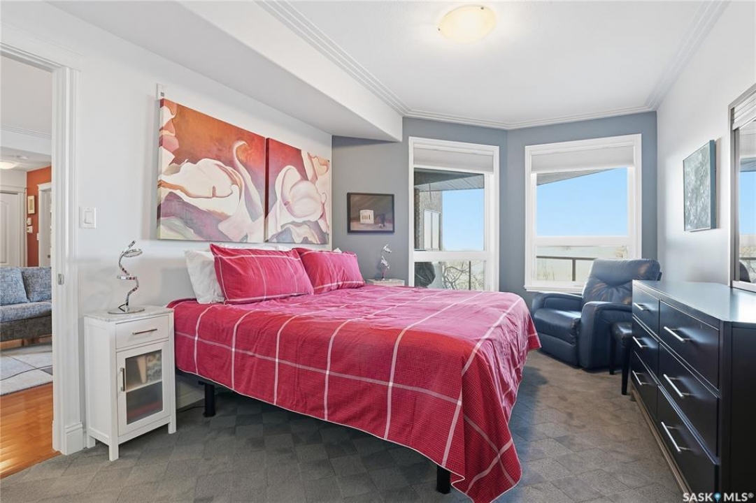 Perched along one of Saskatoon's most prestigious riverfront addresses on Saskatchewan Crescent West, this 1,079 sq ft executive condo offers a refined blend of calm, privacy, and uninterrupted views across the Meewasin Valley and South Saskatchewan River. Lovingly maintained by the original owner and lightly lived in (approximately four months per year), this home presents in mint condition, with timeless finishes that feel both elevated and enduring. Hardwood flooring and cabinetry, classic tile and grout, and custom built-in seating create a living space designed to be enjoyed fully and relaxed. The kitchen features stainless steel appliances and a thoughtful, functional layout with a large eat-up island that blends seamlessly into the open living and dining areas, ideal for quiet mornings or relaxed evenings at home. Two bedrooms and two bathrooms offer flexibility and comfort, including a river-facing primary suite with a walk-in closet and glass-enclosed walk-in shower. The second bedroom includes a beautiful custom Majestic-built Murphy bed and sits adjacent to a full 4-piece bathroom, making it equally suited to hosting guests or working from home. Central air conditioning, central vacuum, a retractable porch screen door, and underground parking add everyday ease, while the quiet, well-managed building offers premium amenities including a guest suite, amenities room, and exercise room. A refined riverfront lifestyle on where walkability, views, and understated luxury come together, this unit is sure to leave you feeling impressed. Located near nature, bus routes, downtown amenities, and the services on 8th St, you will love the accessibility and flexibility this home offers. Call your Realtor for your own exclusive tour now!