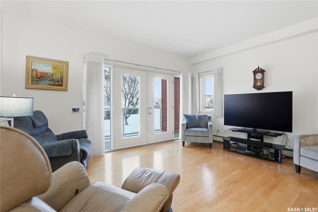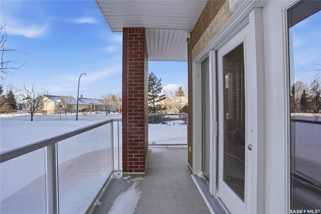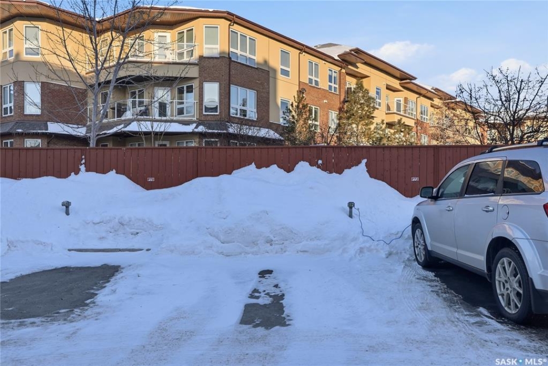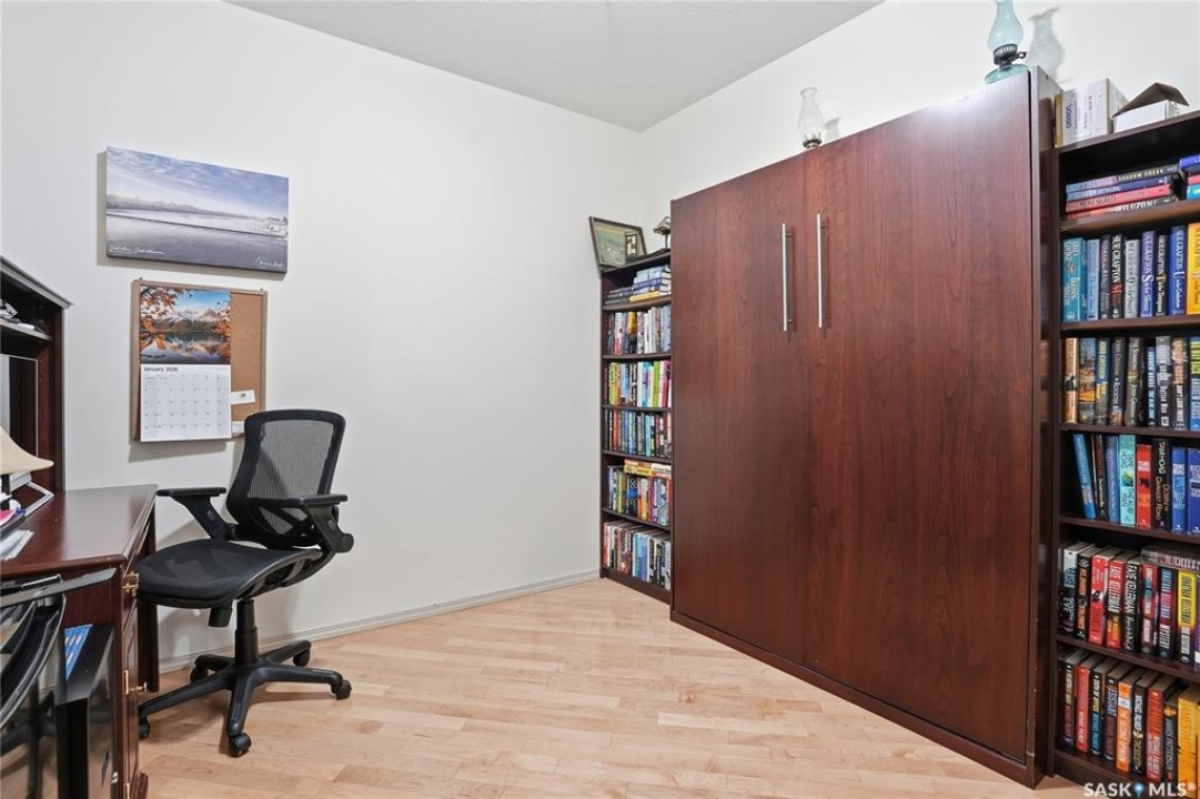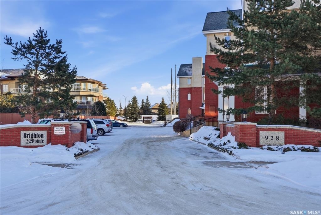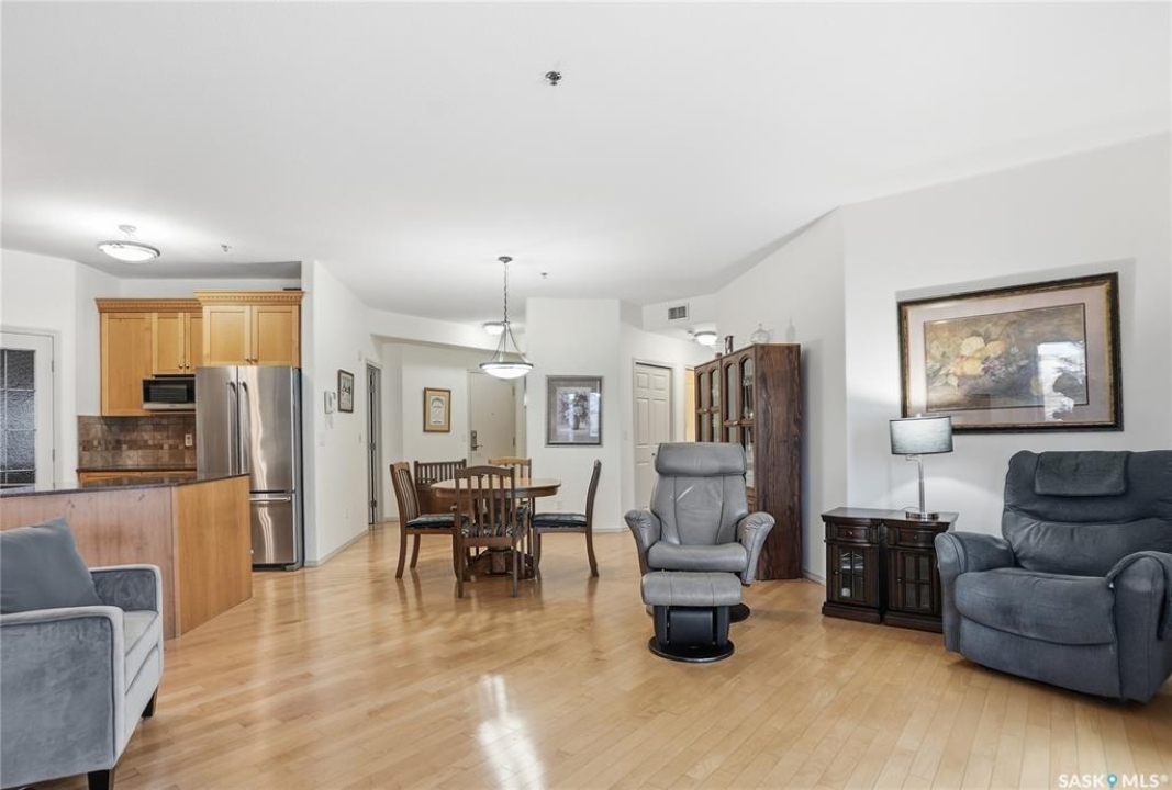Welcome to Unit #112 at 928 Heritage View, ideally situated in the highly sought-after Wildwood neighborhood. This prime location offers easy access to scenic walking paths, nearby parks, and convenient routes to 8th Street and Circle Drive. This former show home is a main-floor unit that showcases quality finishes throughout, including beautiful newer maple hardwood flooring, 9-foot ceilings, and a bright open-concept layout. Upon entry, you're greeted by a front closet and a dedicated laundry room complete with an LG washer and dryer. The versatile office/den is perfect for additional guests or a work-from-home setup. The kitchen is thoughtfully designed with ample maple cabinetry accented by crown molding, stainless steel KitchenAid appliances, a pantry, tile backsplash, and a peninsula island offering additional seating. The kitchen flows seamlessly into the living room, which provides direct access to a southwest-facing wraparound Duradek balcony featuring two storage rooms—ideal for enjoying outdoor space and extra storage. The spacious primary bedroom offers abundant natural light and a walk-through double closet leading to a private 3-piece ensuite. The ensuite has been tastefully updated with a glass shower, luxury vinyl flooring, newer quartz countertop, newer toilet, and linen closet. An additional generously sized bedroom, a 4-piece bathroom with newer quartz vanity, newer luxury vinyl flooring, and tub/shower complete the interior. This unit includes one surface parking stall and one underground stall with additional caged storage. Residents enjoy access to an amenities room, exercise room, lounge, and ample visitor parking. Meticulously maintained by the original owner, this beautiful home is truly move-in ready and a must-see.