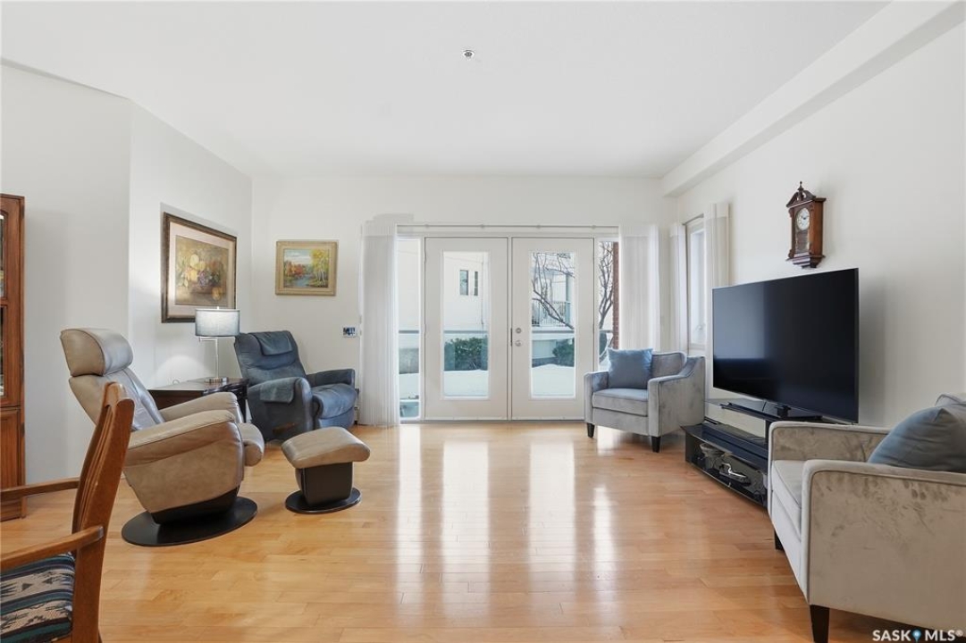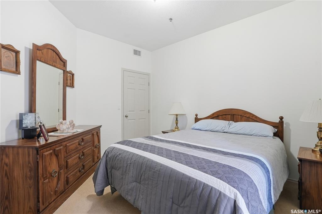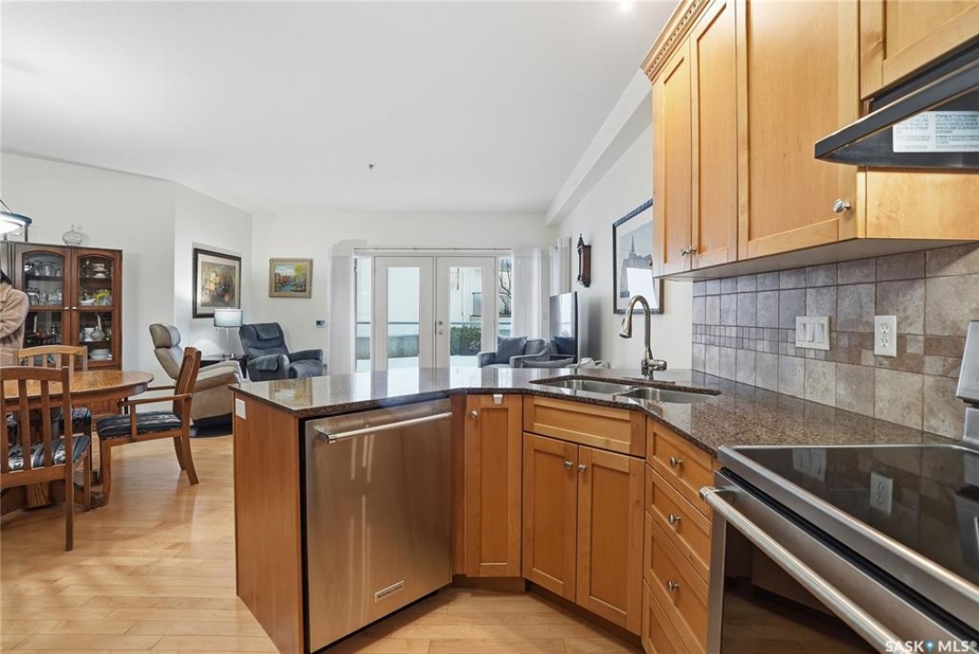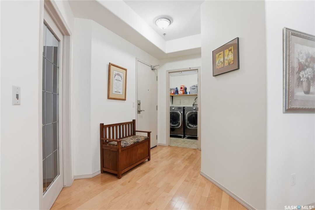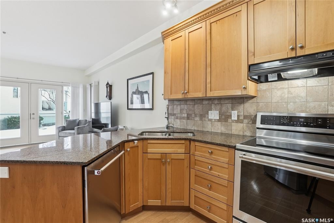 Welcome to Unit #112 at 928 Heritage View, ideally situated in the highly sought-after Wildwood neighborhood. This prime location offers easy access to scenic walking paths, nearby parks, and convenient routes to 8th Street and Circle Drive. This former show home is a main-floor unit that showcases quality finishes throughout, including beautiful newer maple hardwood flooring, 9-foot ceilings, and a bright open-concept layout. Upon entry, you're greeted by a front closet and a dedicated laundry room complete with an LG washer and dryer. The versatile office/den is perfect for additional guests or a work-from-home setup. The kitchen is thoughtfully designed with ample maple cabinetry accented by crown molding, stainless steel KitchenAid appliances, a pantry, tile backsplash, and a peninsula island offering additional seating. The kitchen flows seamlessly into the living room, which provides direct access to a southwest-facing wraparound Duradek balcony featuring two storage rooms—ideal for enjoying outdoor space and extra storage. The spacious primary bedroom offers abundant natural light and a walk-through double closet leading to a private 3-piece ensuite. The ensuite has been tastefully updated with a glass shower, luxury vinyl flooring, newer quartz countertop, newer toilet, and linen closet. An additional generously sized bedroom, a 4-piece bathroom with newer quartz vanity, newer luxury vinyl flooring, and tub/shower complete the interior. This unit includes one surface parking stall and one underground stall with additional caged storage. Residents enjoy access to an amenities room, exercise room, lounge, and ample visitor parking. Meticulously maintained by the original owner, this beautiful home is truly move-in ready and a must-see.