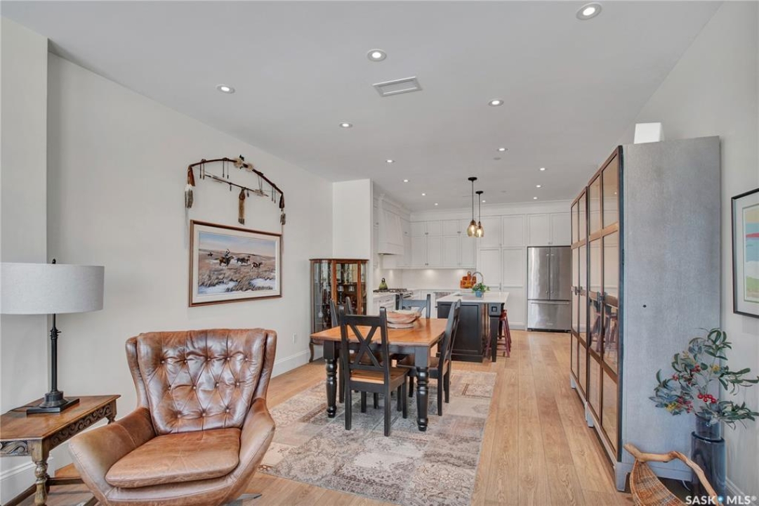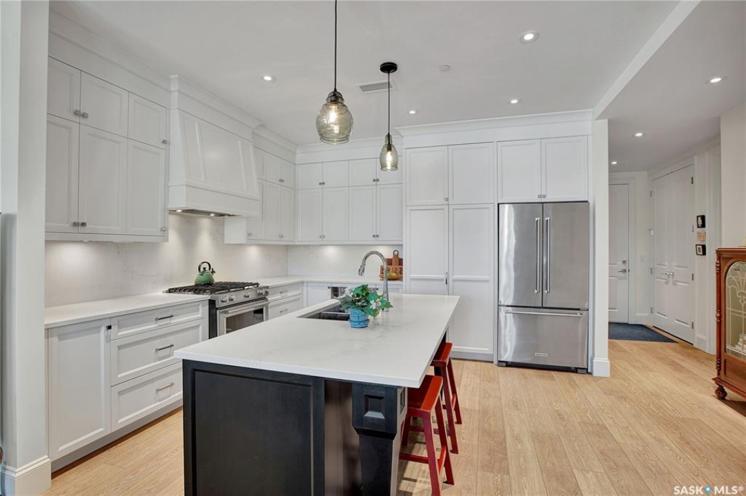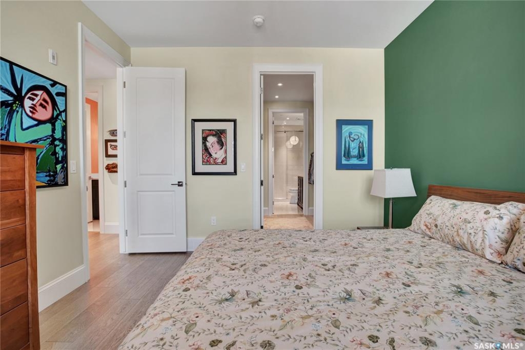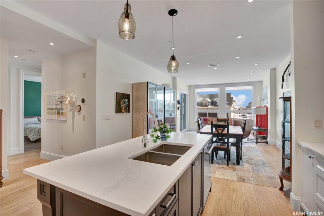 Welcome to The 408 Private Residence Building in The Willows, where luxury meets lifestyle. This immaculate, east-facing suite offers a private balcony with greenspace views, perfect for enjoying peaceful morning sunrise coffee. Designed for both comfort and sophistication, this residence features 2 spacious bedrooms plus a den, ideal for a home office or quiet retreat. The open-concept living space is complemented by designer decor, custom cabinetry, stone countertops, and high-end appliances, creating an elegant yet welcoming atmosphere for everyday living and entertaining. The primary suite is a true retreat, complete with a walk-in closet and a beautifully finished ensuite. Additional highlights include a large laundry room, concrete construction for exceptional privacy, underground storage, and two parking stalls—one underground and one surface. Located in the heart of The Willows, this condo offers a coveted lifestyle with easy access to golf, walking paths, and amenities—perfect for those seeking quiet elegance, convenience, and an elevated standard of living.