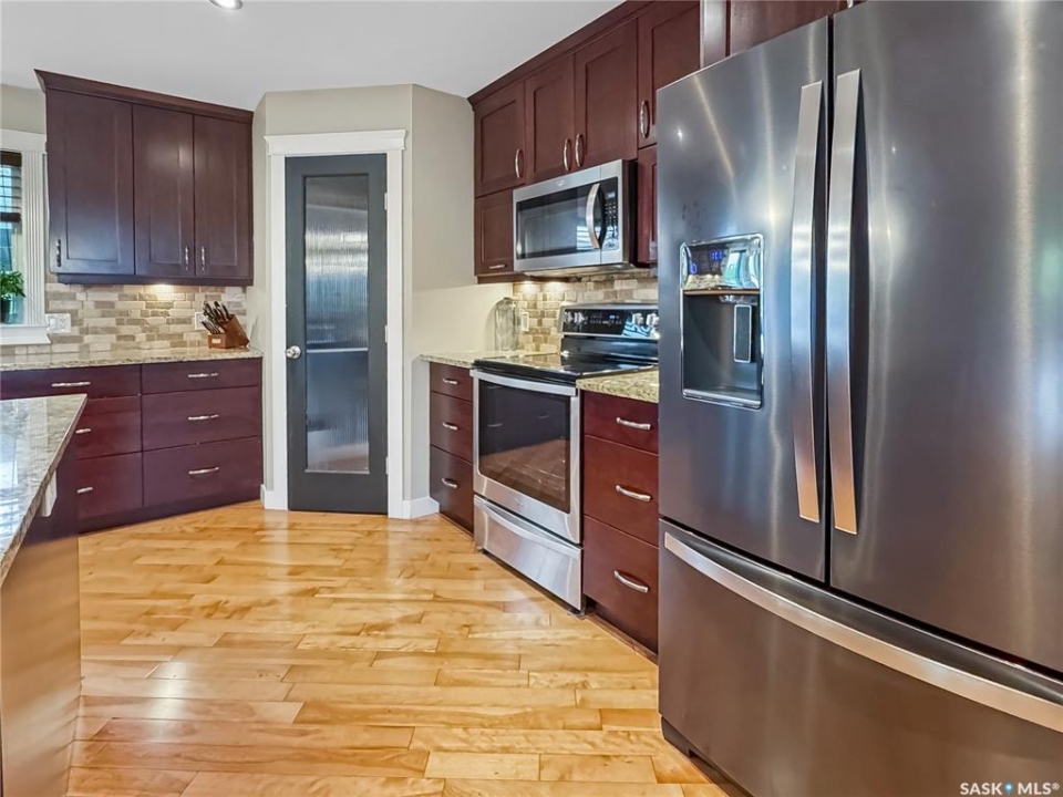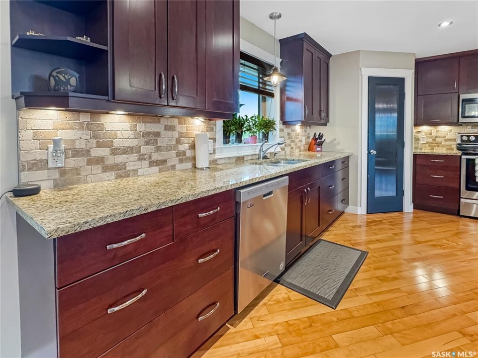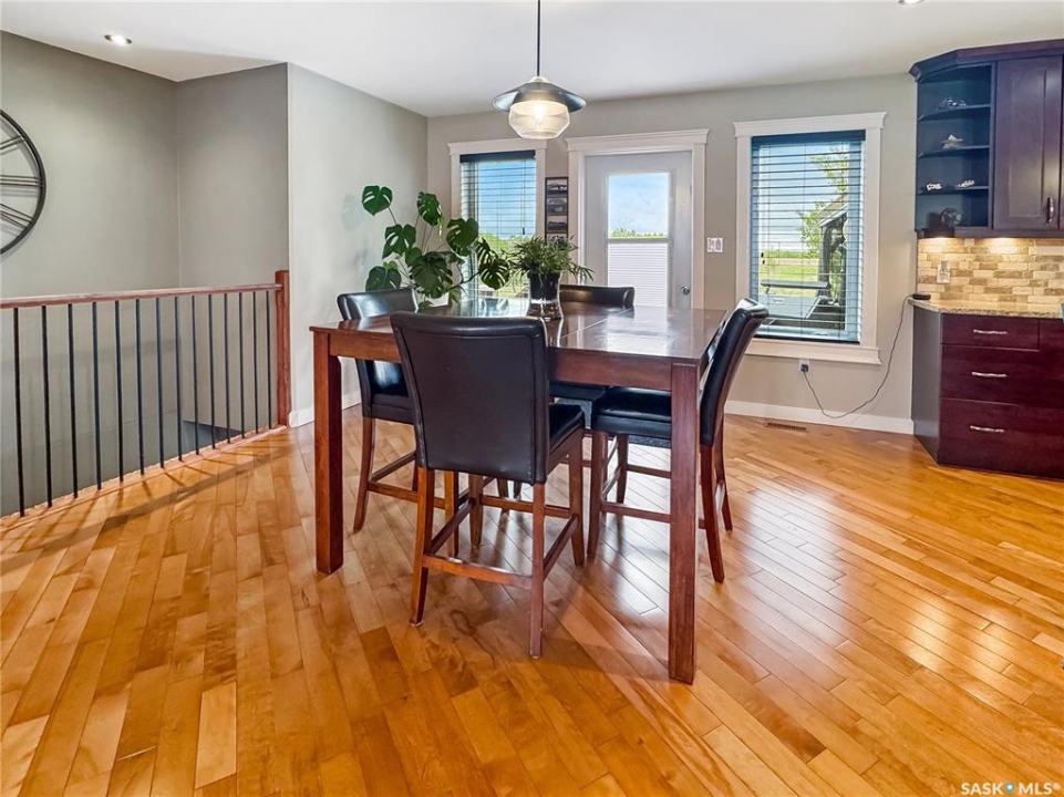 Tucked into the sought-after Battle Ridge Estates, this gorgeous 12.45-acre property offers the perfect mix of modern comfort and peaceful prairie living. From the moment you arrive, this home stands out. A paved driveway leads to a metal security gate, welcoming you into a beautifully landscaped yard equipped with over 100 underground sprinklers to keep everything lush and green. Inside, this spacious 5-bedroom bungalow is built to impress. The main level is constructed with 2x8 walls wrapped in 1.5 inches of Styrofoam insulation, delivering both efficiency and durability. Enjoy elegant finishes throughout including granite countertops, tile and hardwood flooring, and in-floor heat in the basement and garage as well as forced air natural gas furnace to accompany central air conditioning in the summer for the main floor. The heart of the home is the stunning kitchen featuring a massive granite island that flows seamlessly into the dining and living areas. Patio doors lead from the dining space to a large deck overlooking your private view of the natural Saskatchewan plains. The main floor includes three spacious bedrooms, and a luxurious primary suite with walk in closet, a Jacuzzi tub, tiled shower, and dual sinks. Downstairs, the fully finished basement features 9-foot ceilings, an expansive recreation area open to a cozy family room with a natural gas fireplace, two oversized bedrooms, a full bath, and another office or hobby space. The basement is built with 8-inch ICF walls, ensuring long-term strength and insulation. The triple attached garage adds even more value, boasting acid-stained in-floor heated concrete, plus a convenient bathroom—a rare find. There is a massive 40 x 40 pole shed for even more extras storage. Whether you're seeking space, peace, or a high-end acreage lifestyle, this property offers it all. Move-in ready and built for comfort—come experience the acreage life without giving up convenience. Call today to book your private showing.