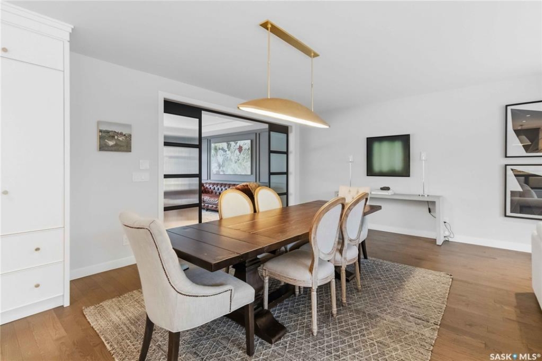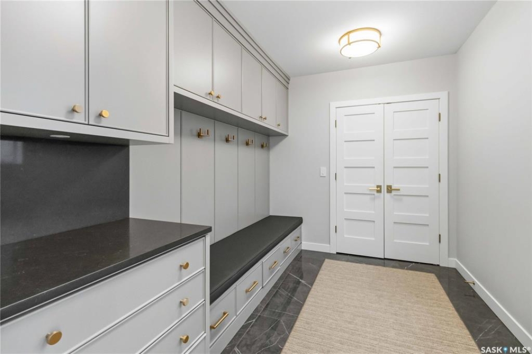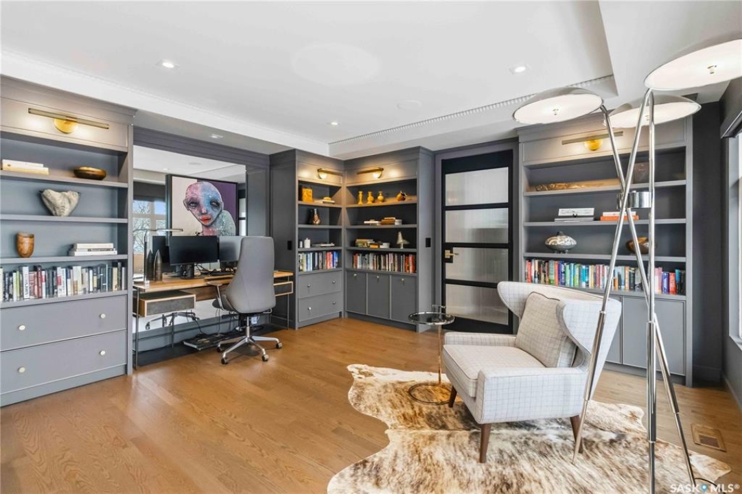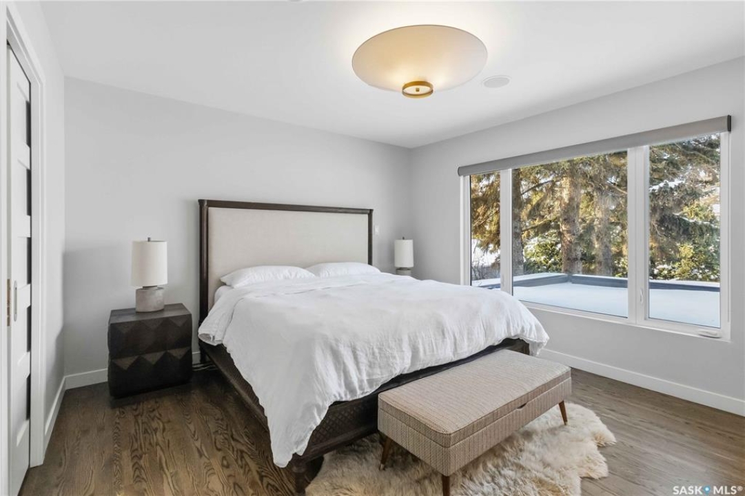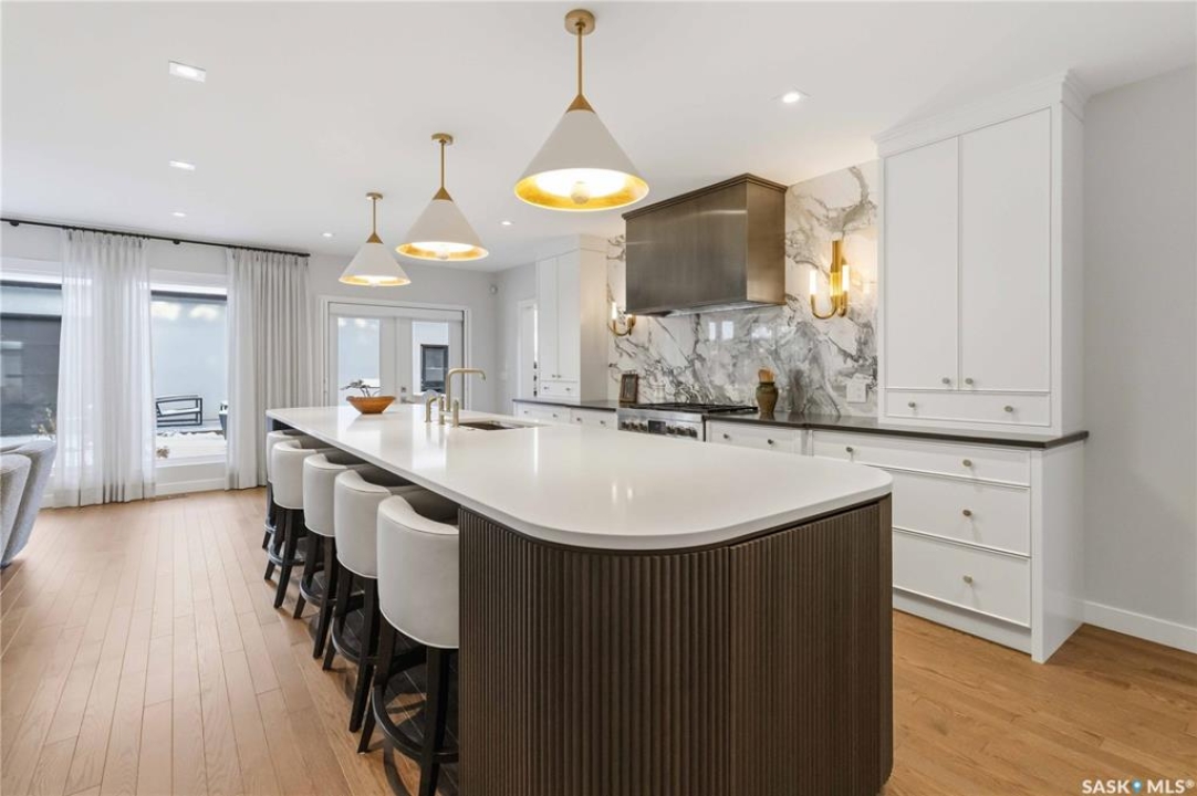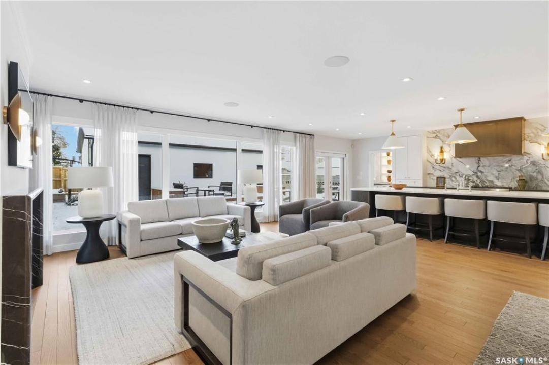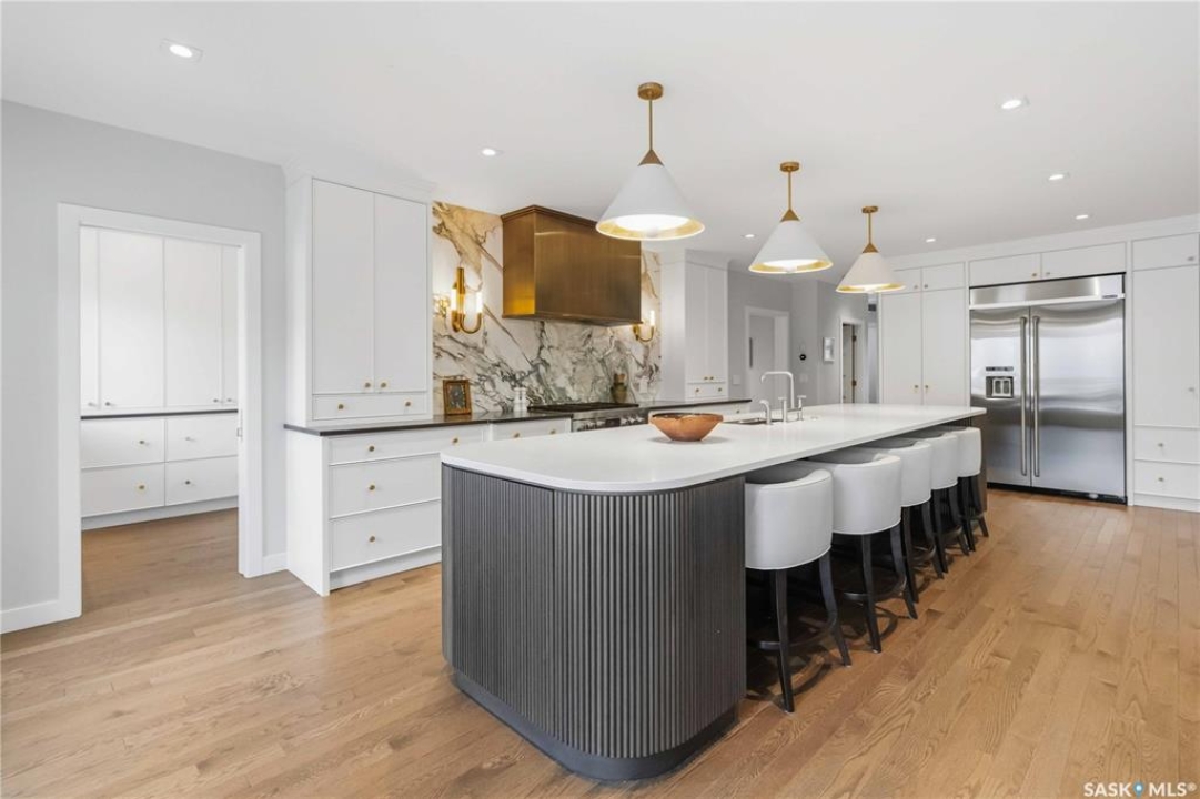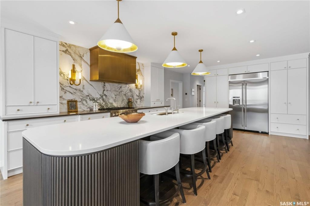 Welcome to 1134 Spadina Crescent E, an impeccably reimagined luxury residence where refined design meets exceptional craftsmanship. This two storey home offers 4 bedrooms and 4 bathrooms and was transformed through a professional, year long renovation by Atmosphere Interior Design from 2021 to 2022, showcasing uncompromising attention to detail throughout. The main floor features engineered oak flooring, custom ceiling and wall moulding, and a front executive office framed by steel doors and scenic river views. The showpiece kitchen is anchored by custom cabinetry with Restoration Hardware handles, a full slab marble backsplash, custom brass hood, sculptural brass lighting, and premium JennAir appliances. A statement oak island with fluted detailing, two garburators, artisan tile pantry backsplash, and refined finishes complete the space. The living area is warmed by a marble clad Town and Country gas fireplace and enhanced with motorized blinds, smart lighting, and built in speakers. Designer lighting by Kelly Wearstler, Restoration Hardware, and Arteriors creates a timeless, layered aesthetic throughout. New interior doors with Emtek hardware elevate both function and form. The primary suite is a spa inspired retreat featuring two walk in closets, heated tile floors, steam shower, Restoration Hardware mirrors, and Kelly Wearstler lighting. Secondary bedrooms are thoughtfully curated with designer wallpapers along with custom drapery. Additional highlights include a spacious mudroom, updated staircase with new spindles, and a timeless exterior finished in metal siding and stucco. Outdoor living is enhanced by a new composite deck completed last summer. The heated triple garage offers a drive through bay, slat wall storage, sub panel, and 240 volt plug. Other upgrades include new weeping tile with a sump pit. A rare and refined offering, blending elevated design, modern technology, and timeless elegance for an exceptional lifestyle opportunity.