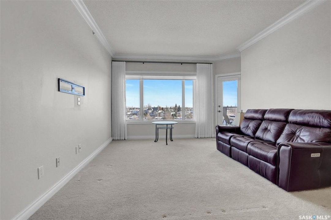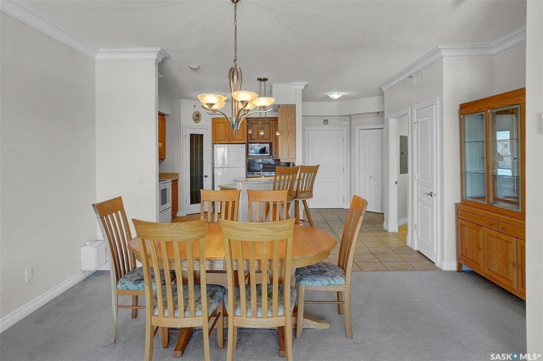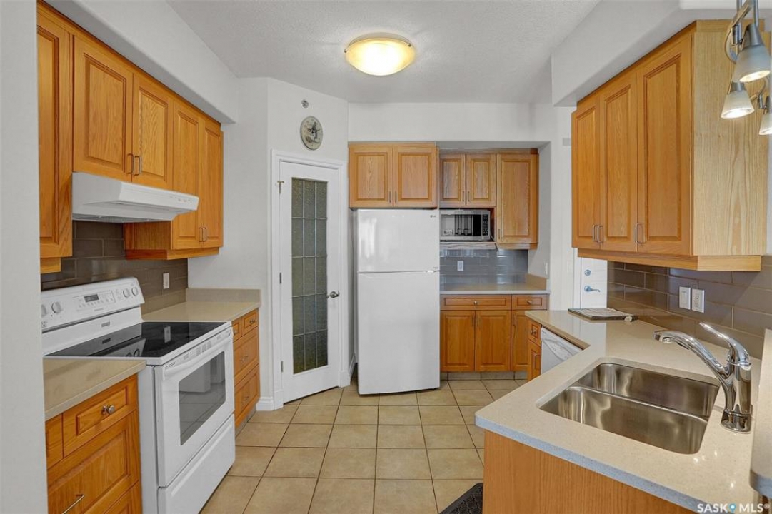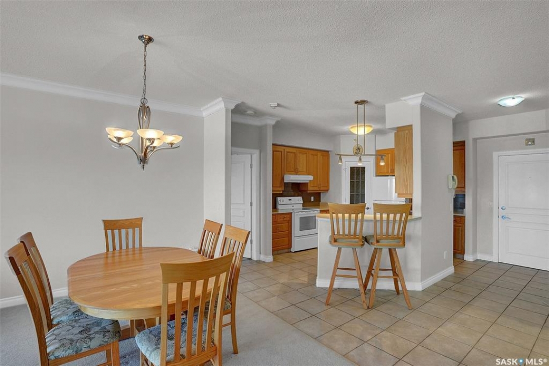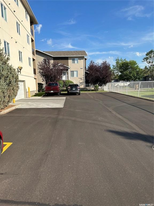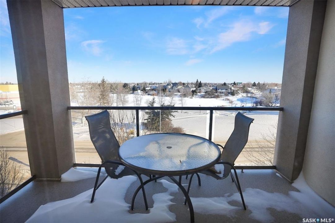Welcome to this lovely top floor condo that offers 2 spacious bedrooms, 2 bathrooms, and 2 designated parking spots. This condo offers beautiful views of the lake, Sandra Schmirler Leisure Centre, all while being steps away to a coffee shop, library, walking paths, and more. A bright airy condo in an unbeatable location. This spacious and well- designed unit features a fantastic floorplan that is both functional and comfortable. The kitchen is a standout with solid wood cabinets, upgraded granite countertops, ample storage, and a sit up peninsula island – that is perfect for casual dining, and entertaining. The living room and dining area are perfect to relax and enjoy family gatherings. The primary bedroom offers a large walk- in closet and a 4pc ensuite. The 2nd bedroom is spacious and there is a 2nd main 4pc bathroom. You will enjoy the convenience of in suite laundry with storage room. Just off the living area, is access to your private balcony where you can take in the beautiful scenic views, extending your living space outdoors. The condo has been freshly painted and is truly move in ready. There is an additional storage room located on the same floor. The parkade is located on the main floor and includes a wash bay for all residents to use. The building offers a games room, and amenities room. Extremely well maintained, and ready for a new owner, this condo offers an undeniable presence rarely found in the market. Condo fees include: Heat, Water, Sewer, Building Insurance, Common Exterior and Interior maintenance, Lawn Care, Snow Removal and Reserve Fund.