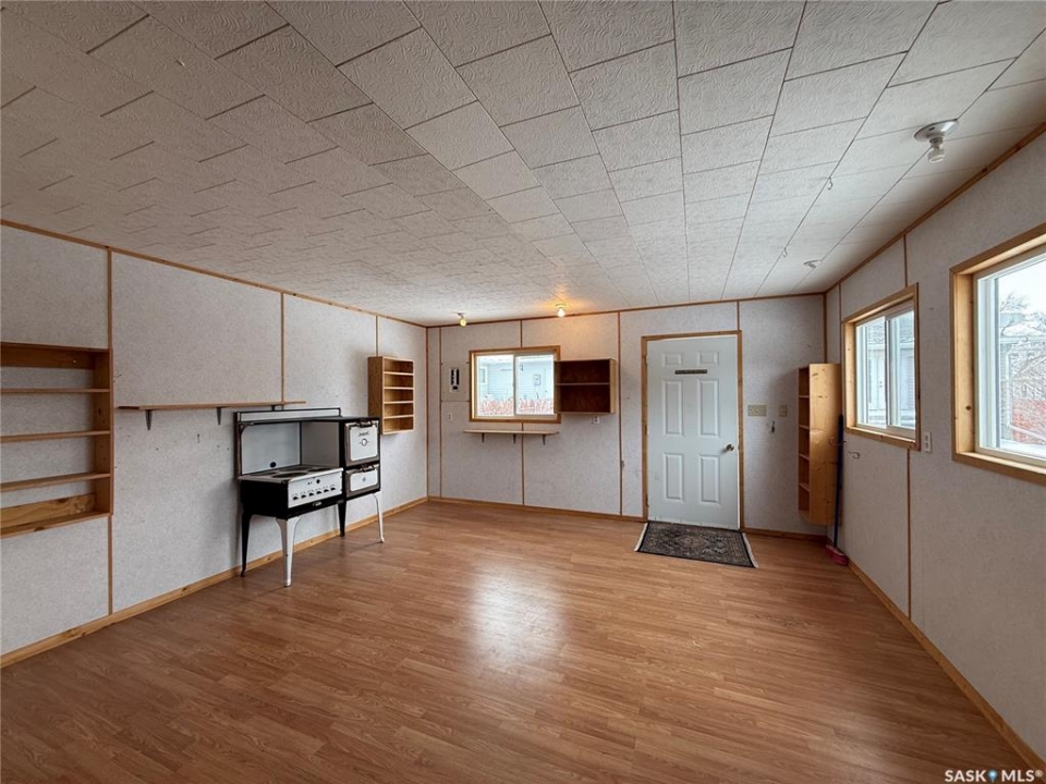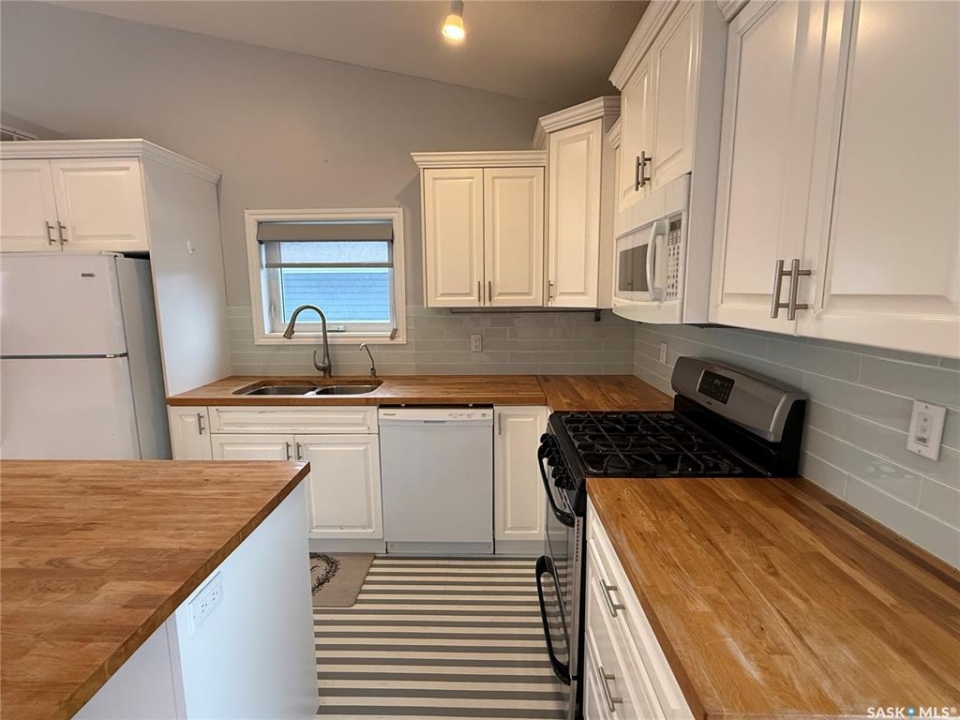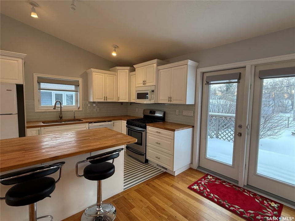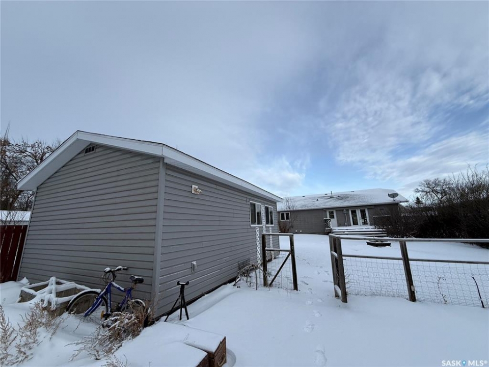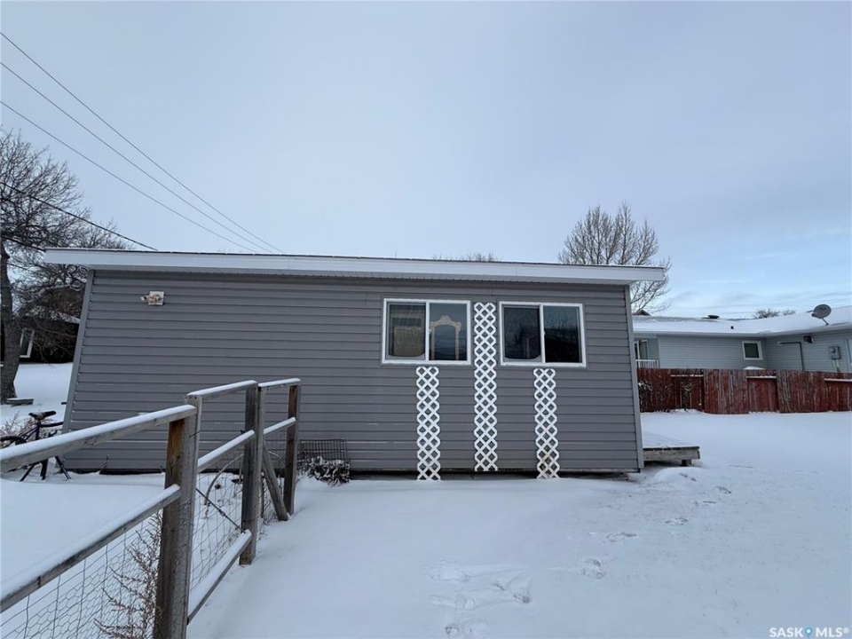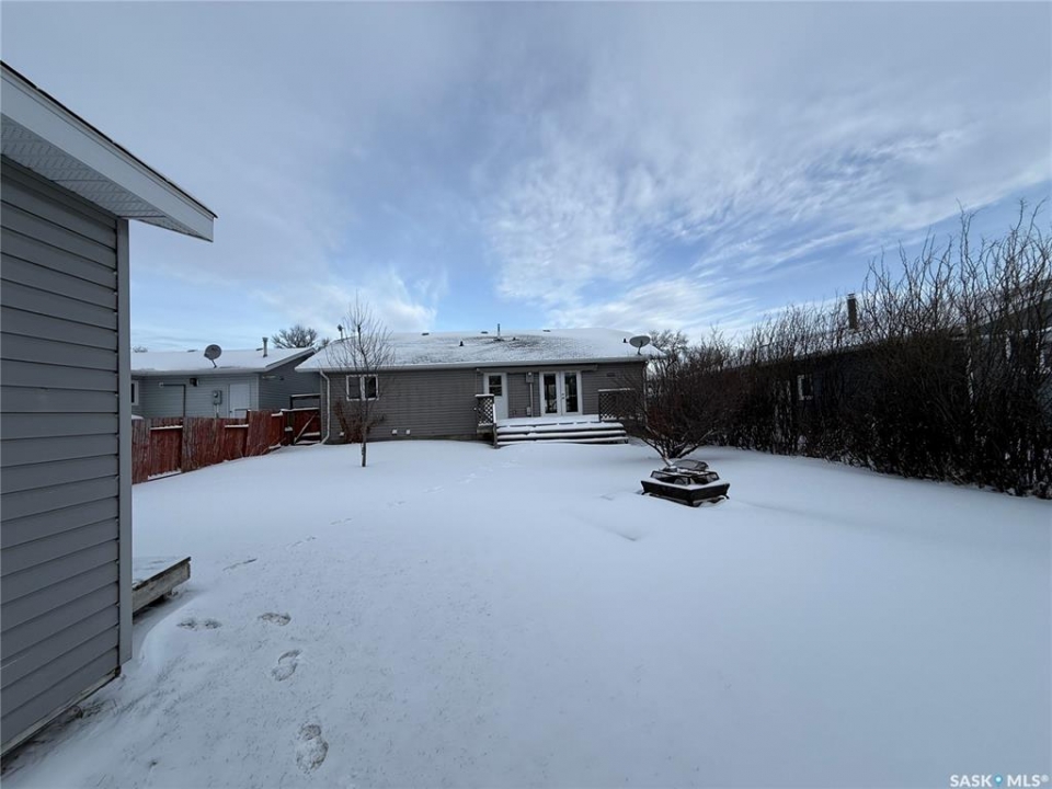 130 2nd Ave SE, Eston. Welcome to this well-maintained 2008 bungalow offering 1,208 sq. ft. on the main level. Step onto the inviting front porch and into a spacious living room with vaulted ceilings, creating an open and airy feel. The open-concept layout flows seamlessly into the kitchen and dining area, perfect for everyday living and entertaining. The kitchen features white cabinetry, butcher block countertops, a pantry, and a large island with drawers and seating. Hardwood floors run throughout the main living spaces, and the dining area includes patio doors leading to a generous 20' x 15' back deck. The fully fenced yard provides great outdoor space for kids, pets, or relaxing. At the back of the home, you'll find a functional porch area with laundry and utilities, complete with a sink and built-in cupboards. Down the hall is a versatile office or den, a storage room with access to the crawl space, and two bedrooms. The primary bedroom is a comfortable space with a large closet and a 4-piece ensuite featuring a white tile shower and tile flooring. A 3-piece main bathroom and second bedroom complete the layout. Additional features include in-floor heating, a large 24' x 16' shed, and a thoughtfully designed floor plan that maximizes space and functionality. Call today for more information and to schedule your tour of this property!