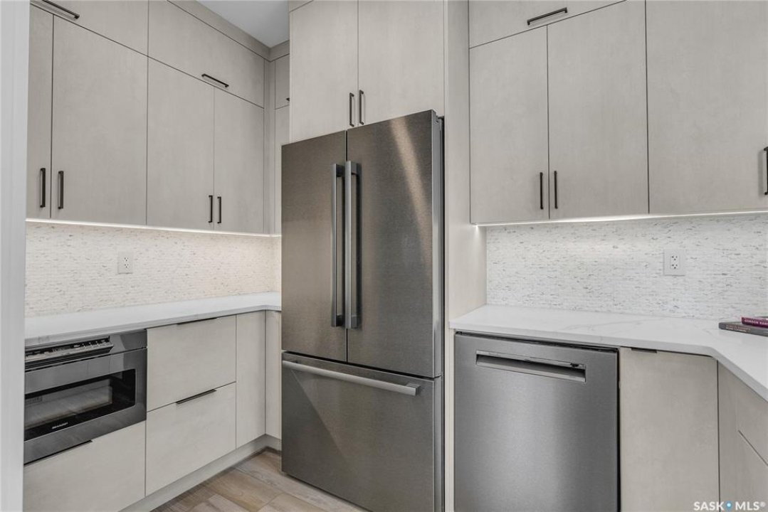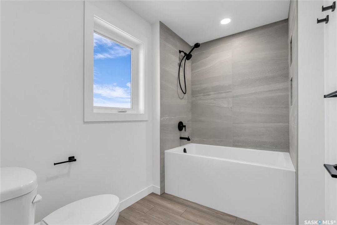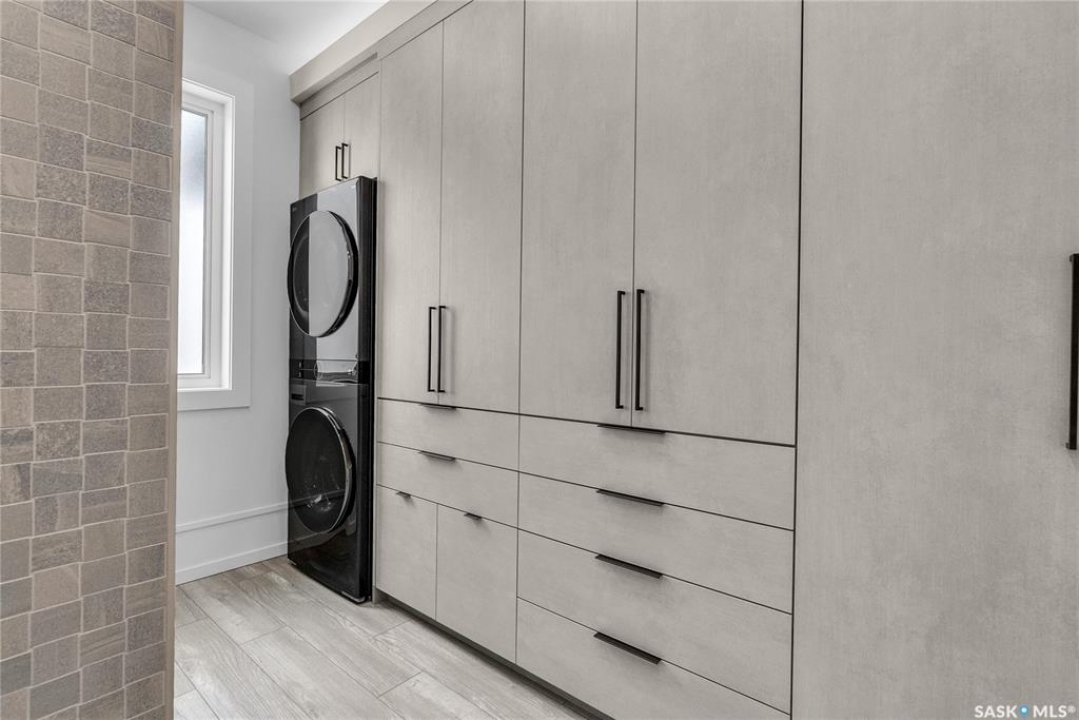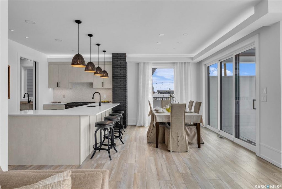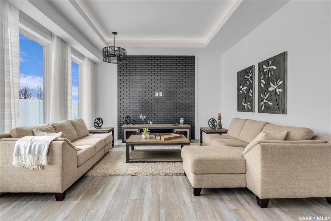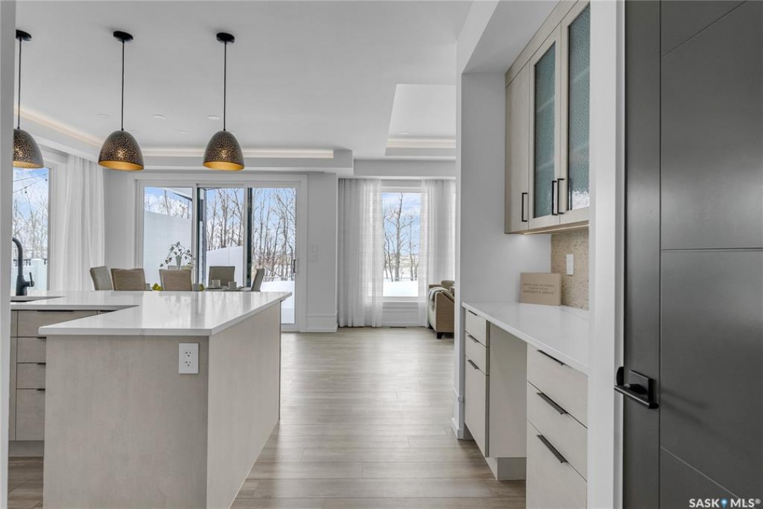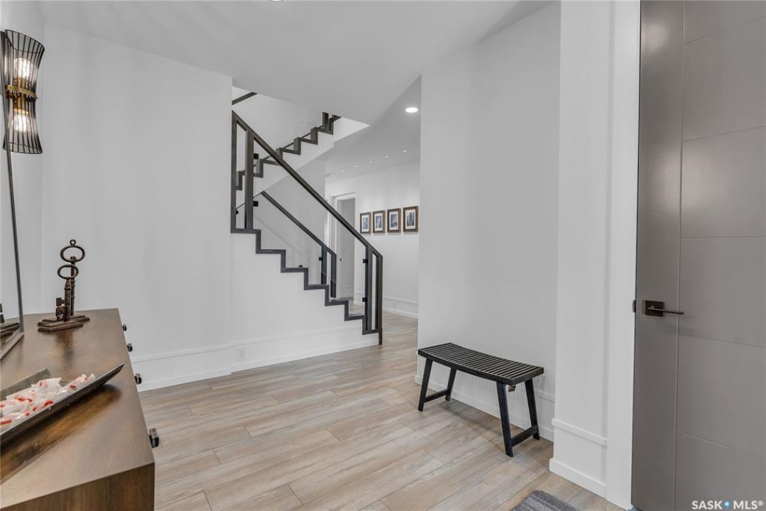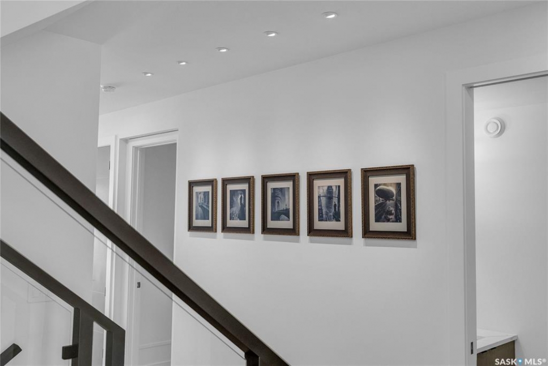 Homes by Norwood located at 428 Woolf Bend in Saskatoon's Aspen Ridge, featuring luxury finishes and expert craftsmanship. The spacious foyer welcomes you, stained wood railings and glass staircase inserts lead to 2nd floor. Engineered Vinyl Plank flooring throughout home. The main floor boasts 8' interior doors, 9' ceilings with LED-lit tray designs, a great room with a brick feature wall, large south-facing windows, and a dining area with sliding doors to a 12'x12' covered deck. The gourmet kitchen includes modern cabinetry, a 6-burner gas convection range, warming tray, range hood, LED strip lighting, tile backsplash, quartz countertops, and a peninsula bar, with an adjoining butler's pantry offering a fridge/freezer, dishwasher, microwave, prep sink, spice rack, and ample storage. The primary bedroom features a custom feature wall and insulated walls for sound comfort, while the ensuite offers dual vanities, a custom walk-in shower, abundant storage, a stacking washer/dryer, and a private commode. Additional main-floor spaces include a 2-piece powder room and mudroom with extensive storage. The second floor has three large bedrooms with interior insulated walls, a second laundry room with a sink, and a split main bathroom with dual vanities, a soaker tub/shower with tile, and separate lavatory. The basement's exterior walls are framed, insulated, and wired, with interior walls framed and wired as well. Mechanical features include a high-efficiency furnace with zoned heating and thermostats on each floor, a power vent hot water heater with a circulating pump, an HRV system, central air, and 200-amp electrical service. The 27'W x 26'D double attached garage is insulated, wired, drywalled, has LED lighting, and is nearly 14' high for future car lifts. The exterior features Hardie board siding, composite finishes, and a maintenance-free covered deck with a privacy wall and natural gas outlet. Enjoy breathtaking south views of Kernen Prairie—schedule a viewing today