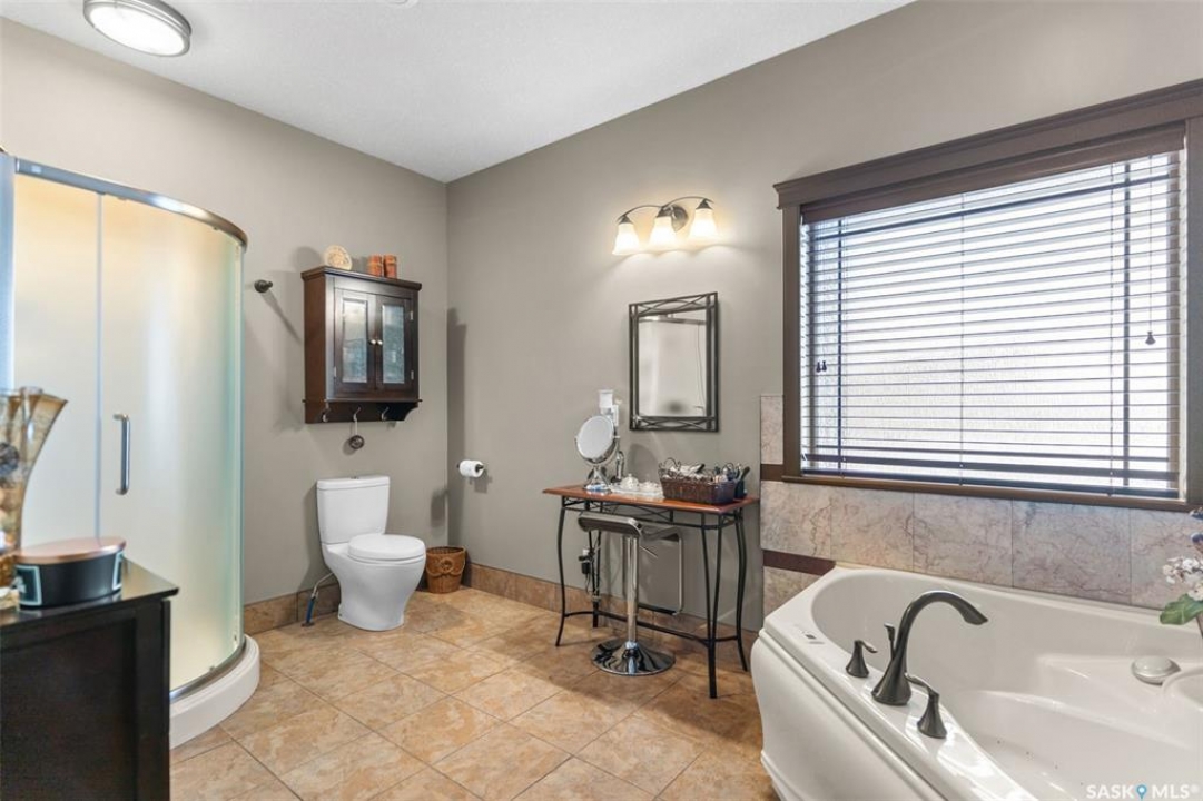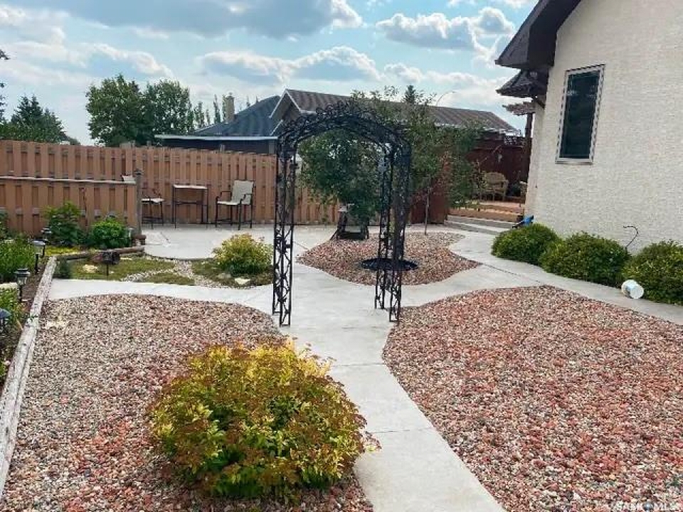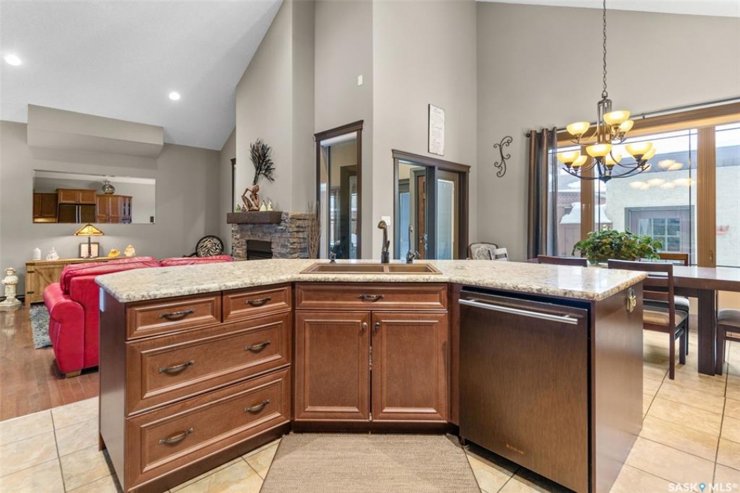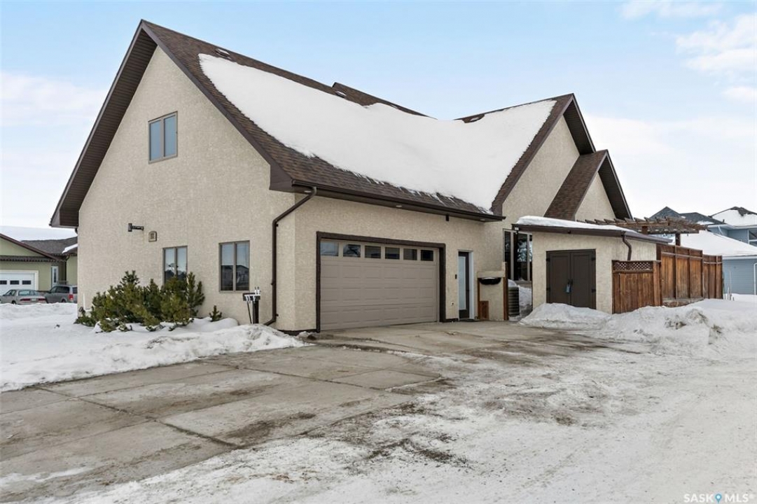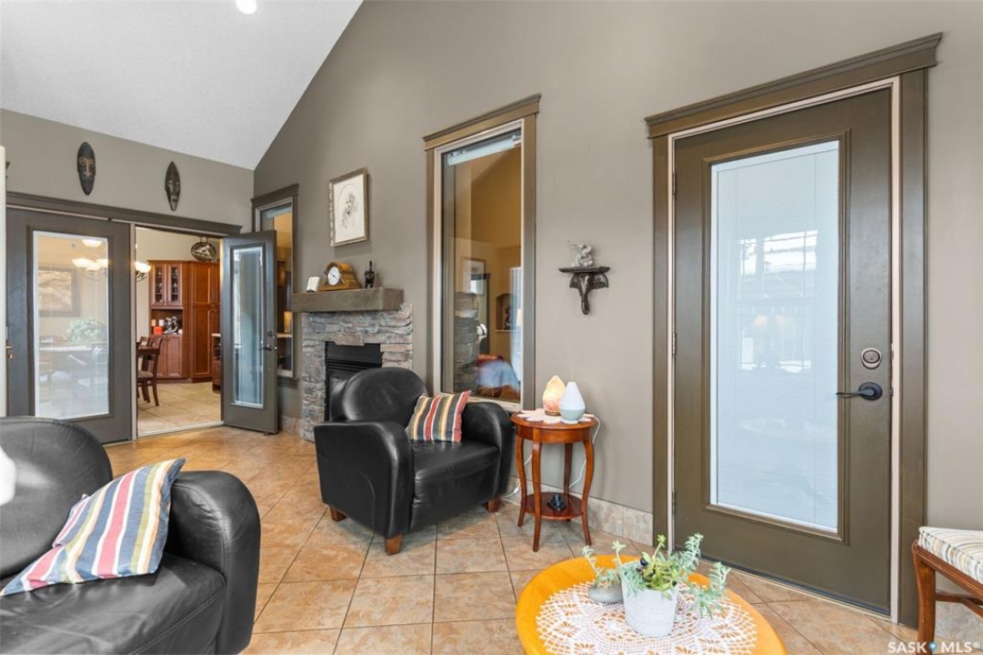 Step into this sophisticated luxury home where exceptional craftsmanship and high-end finishes create an atmosphere of refined elegance. This impressive 4-bedroom, 4-bathroom residence welcomes you with a grand foyer and stylish French doors that open into the main living area. At the heart of the home is a stunning living space featuring soaring vaulted ceilings and a striking double-sided fireplace, offering both warmth and architectural impact. The open-concept design flows seamlessly into a chef-inspired kitchen outfitted with top-of-the-line Jenn-Air appliances, rich maple cabinetry, a large central island, and luxurious granite countertops with a matching granite sink. The bright and inviting dining area easily accommodates a full-sized table and is enhanced by thoughtfully placed skylights that flood the home with natural light. A gorgeous sunroom, complete with its own fireplace and direct access to the backyard, provides a cozy year-round retreat. The main floor hosts three generously sized bedrooms, including a luxurious primary suite featuring a spacious walk-in closet and a spa-like 5-piece ensuite with a jetted tub, separate shower, and elegant vanity. A second 3-piece bathroom offers added convenience, along with a well-appointed laundry room that includes a 2-piece bath and tiled flooring. Upstairs, a versatile bonus room with hardwood floors and an electric fireplace offers endless possibilities—ideal for a relaxing lounge, home office, or games room with picturesque views. The partially finished basement includes a fourth bedroom, a 3-piece bathroom, a utility room, and a large heated crawl space with concrete flooring, providing excellent storage options. Outside, enjoy the beautifully landscaped yard featuring a garden shed, fenced areas for added privacy, and a spacious deck with pergola. Additional highlights include a heated double attached garage with direct entry, ample parking, and only 20 mins. from BHP Mine and 30 mins. to Humboldt.