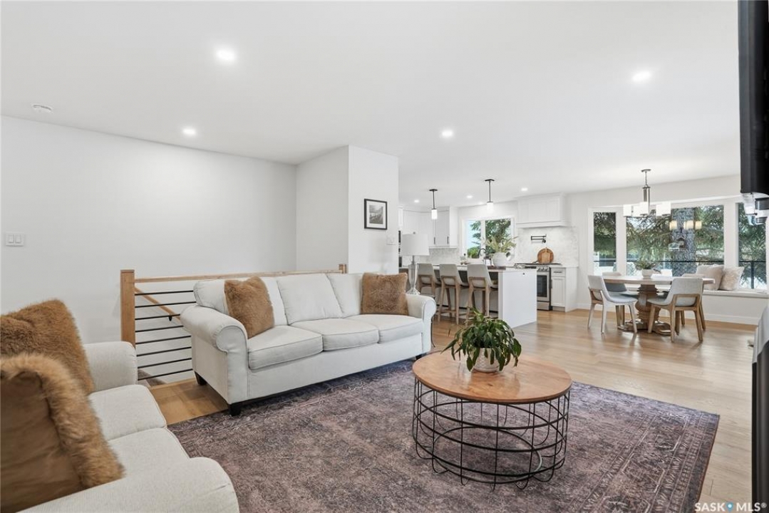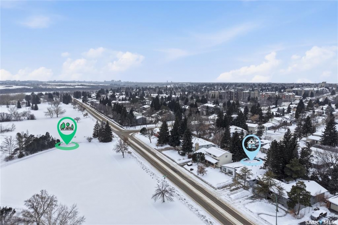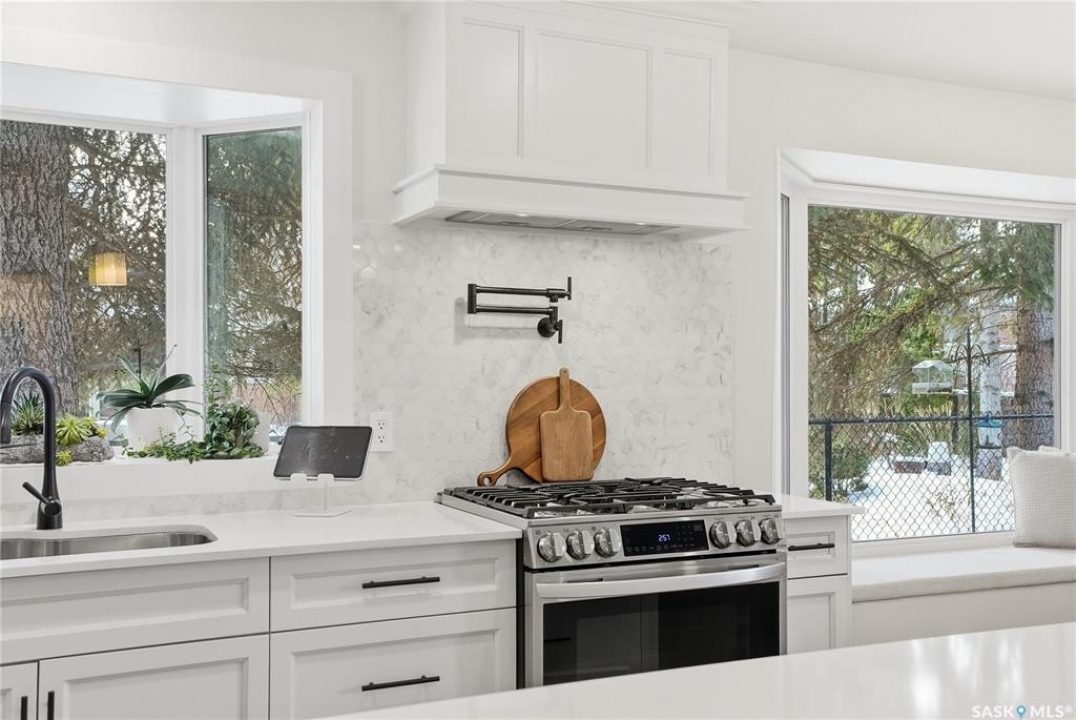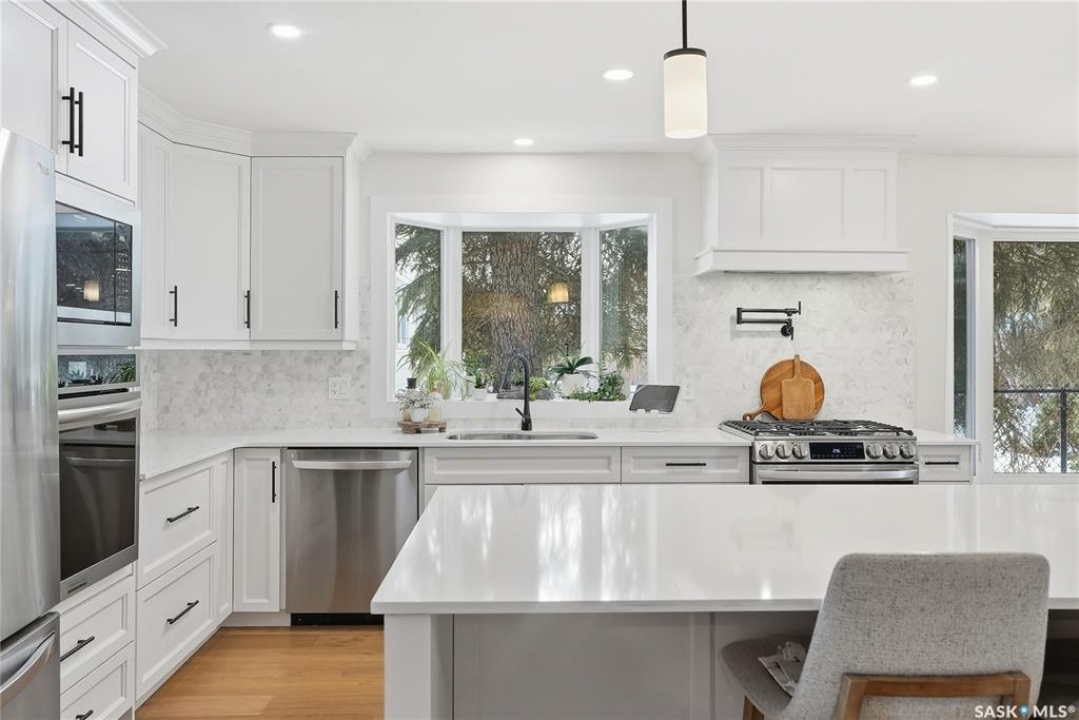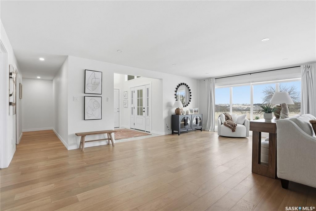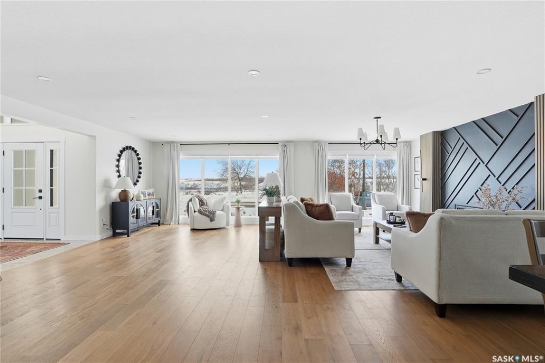 CHECK ON THE VIDEO ABOVE! Timeless style and exceptional craftsmanship define this stunning 2,691 sq. ft. bungalow in prestigious Lawson Heights, offering river views and overlooking Meewasin Trail. Welcome to 115 Whiteswan Drive, where a grand foyer with soaring ceilings creates an inviting first impression. Sun-filled living and dining areas showcase breathtaking views and feature a striking custom warm-toned wood feature wall with a sleek linear gas fireplace, ideal for both everyday living and entertaining. Beautiful new warm-coloured hardwood flooring flows throughout the main floor, enhancing the home's elegant, cohesive design. A private main-floor office with glass doors is perfect for working from home. The executive kitchen impresses with white cabinetry, an expansive island, quartz countertops, and a fully equipped butler's pantry with all new stainless steel appliances, including double refrigerators, double ovens, gas stove, beverage fridges, tall wine cooler, and warming oven—designed for hosting and convenience. The breakfast nook features a south-facing window seat, while the adjoining family room opens to outdoor living. The spacious primary bedroom (19' x 13') offers a large walk-in closet and a spa-like 5-piece ensuite. Two additional well-proportioned bedrooms share a 5-piece bath, along with rare main-floor storage and extra cabinetry. The newly fully developed lower level provides a wet bar, extra bedroom, bright 3-piece bathroom, gym/exercise space, and generous storage. Mechanical upgrades include a high-efficiency furnace and on-demand water heater. Enjoy breathtaking sunrise views from the front of the home, then unwind in a sun-filled, private backyard retreat featuring a privacy wall, stamped concrete patio, stunning brick fireplace, tranquil water fountain, lush landscaping, brand new fencing, and a shed—a truly secluded oasis.