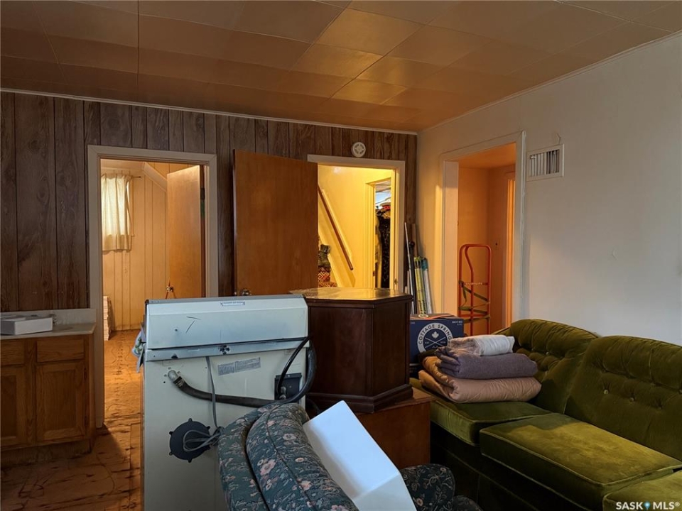 Welcome to this well-located home in a quiet and desirable South Hill neighbourhood. Situated on a large corner lot with mature landscaping, this property offers space, privacy, and excellent proximity to family-friendly amenities. A playground is located right beside the home, a convenience store and the Cornerstone School is just a couple of blocks away. The main floor features a decent size living room with large picture window, two bedrooms, a full bathroom, a spacious eat in kitchen with a built-in cabinet and lots of cupboards, and an abundance of original woodwork that adds character and charm throughout the whole main floor. An attached porch/sunroom overlooks the fully fenced backyard, providing a comfortable space to relax and enjoy the outdoors. The basement offers a wide stairwell for easy furniture access and includes two dens, a family room, and plumbing in place for a future bathroom. The basement does require some renovating, presenting a great opportunity for buyers to add value and customize the space to their needs. Outside, the property includes a single detached garage with heater -sold “as is” -off-street parking, a patio area, and a brick firepit—ideal for outdoor entertaining. Most furniture, appliances, and household items are included in the sale with no warranties or representations. Property is being sold “as is.”