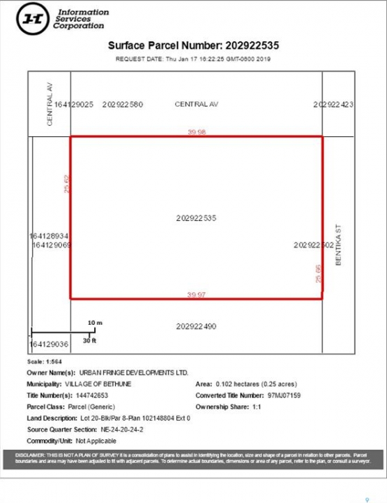85 x 131 SERVICED LOT IN THE “URBAN FRINGE” DEVELOPMENT IN BETHUNE. Subdivision Services: Sanitary sewer system (at the front property line), Overland land drainage system, Water Line (at the curb stop located at the front property line), Street lighting, underground power, natural gas and telephone. Other lots available within the development and other locations in Bethune. Bethune is a � hour form Regina on divided Hwy 11, the village includes a k-8 school, local daycare (high school students are bused to Lumsden) Credit Union, Co-Op grocery and gas, restaurant, bar, community hall, rink and museum. The community is close to the K+S Potash Mine and is only 10 minutes to Last Mountain Lake. Village offsite fee and GST not included in price. There are a number of other lots available in the development at the same price point. Please call your Realtor for more information.