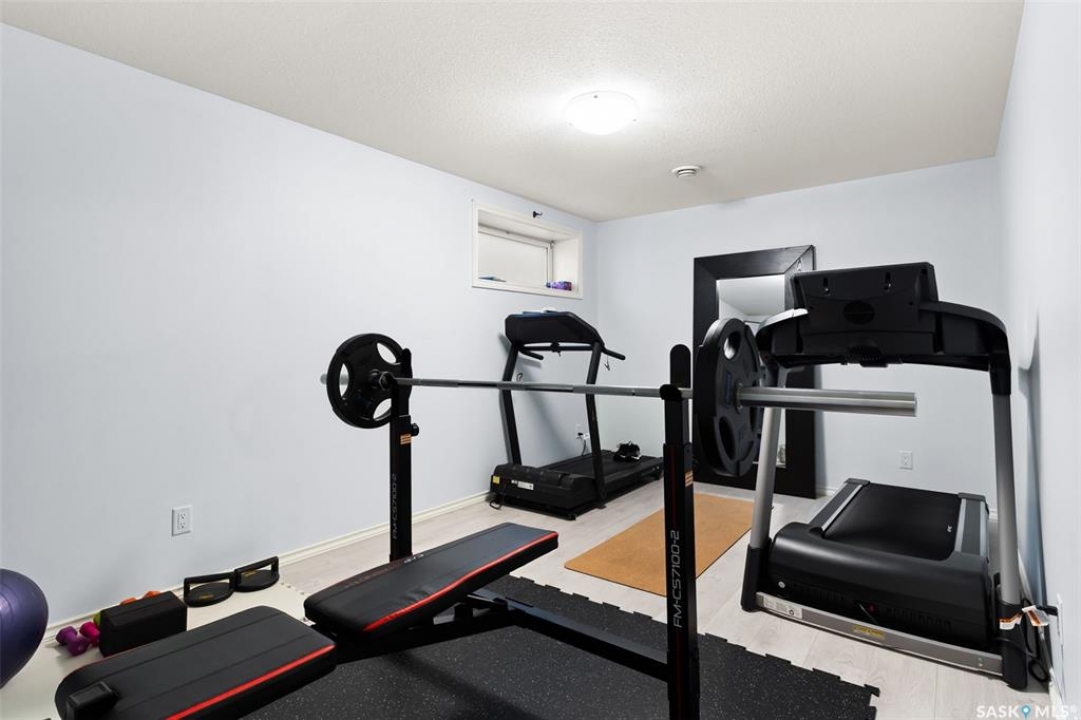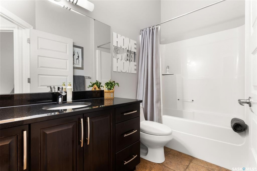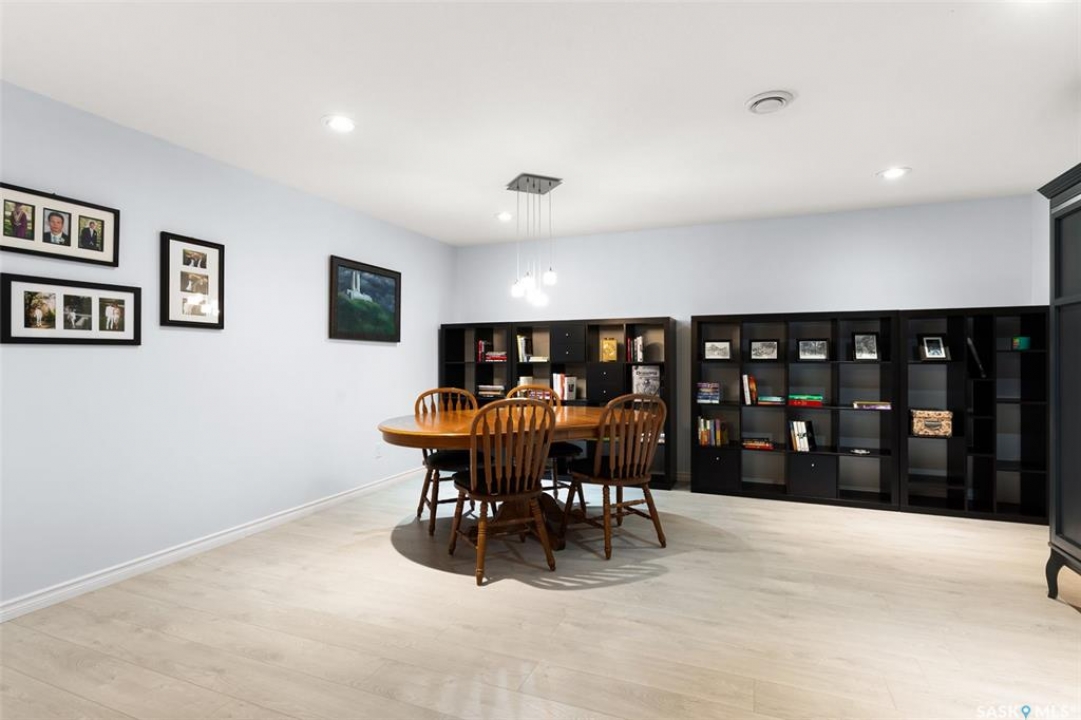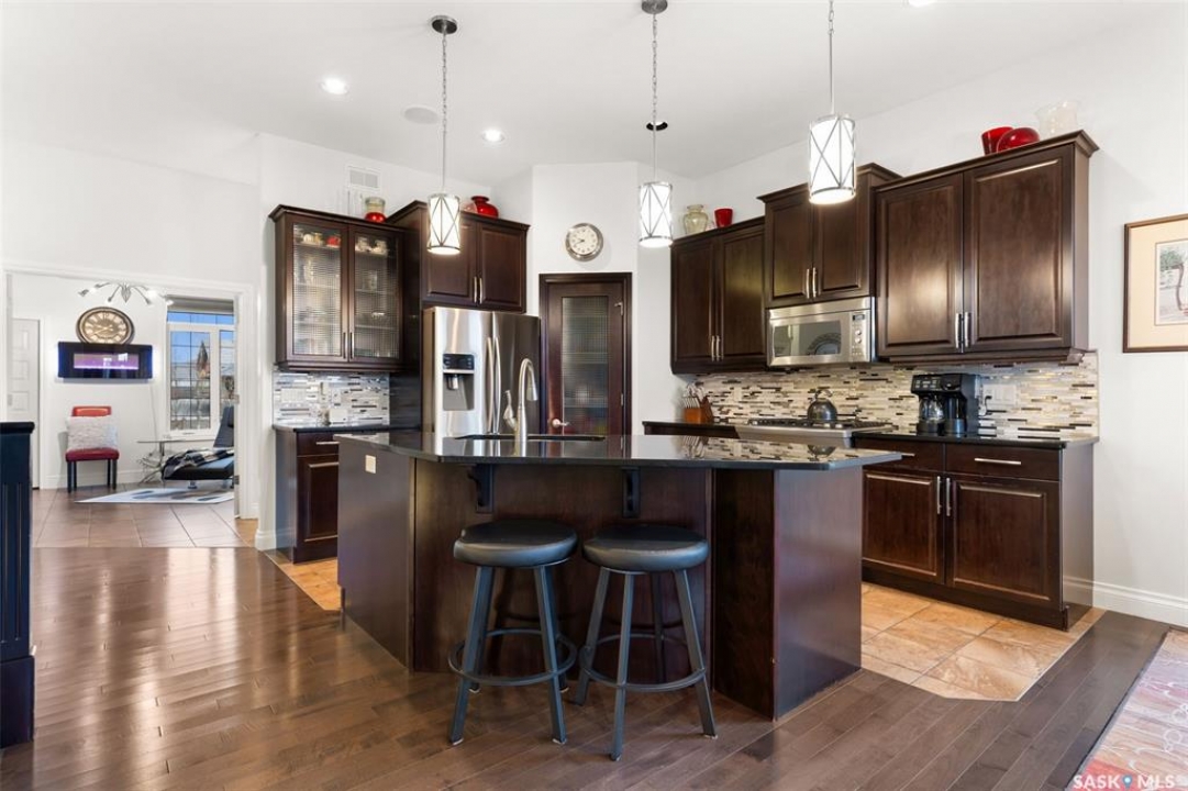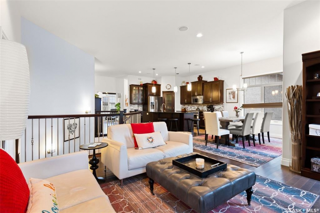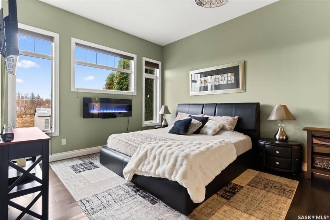 Built in 2011 on one of Harbour Landing's original crescents, this executive bungalow offers 1,700 sq. ft. on the main floor & over 3,400 sq. ft. of finished living space, including 6 bedrooms & 3 bathrooms. Designed for elegance and practicality, it suits families, multi-generational living, or those needing work-from-home flexibility. A spacious tiled foyer with 10' ceilings and built-in surround sound leads to a bright front office/bedroom with fireplace, large windows, a sink, ideal for a studio or salon. A 2nd bedroom and full bath sit privately down the hall. The main-floor laundry room offers ample storage & access to the double attached garage. Hardwood and ceramic tile span the main living areas. The open-concept kitchen, dining, and living room form the heart of the home, featuring quartz countertops, a large island, extensive cabinetry, a corner pantry & stainless steel appliances with a gas stove. The dining area opens to the backyard, while the living room includes a stone-surround gas fireplace. The primary suite provides a peaceful retreat with an electric fireplace, Smart TV, walk-in closet & a luxurious ensuite with double sinks, jetted tub & walk-in shower. The private, low-maintenance backyard has no rear neighbours and includes four composite decks, hot tub, raised perennial beds with drip irrigation & a garden shed. The lower level offers 8-ft ceilings, large windows, laminate flooring & an open layout with a library/games area, family room with projection screen, and a well-equipped wet bar with full fridge/freezer. Three generous bedrooms—two with walk-in closets—& a full bath with double sinks complete the space. Built on thirty-one 12" diameter piles, the home provides exceptional stability, along with an owned on-demand water heater, new Hi Efficient furnace, water filtration & softening systems, underground sprinklers, & drip irrigation. This home delivers space, privacy, & versatility in one of Harbour Landing's most desirable locations.