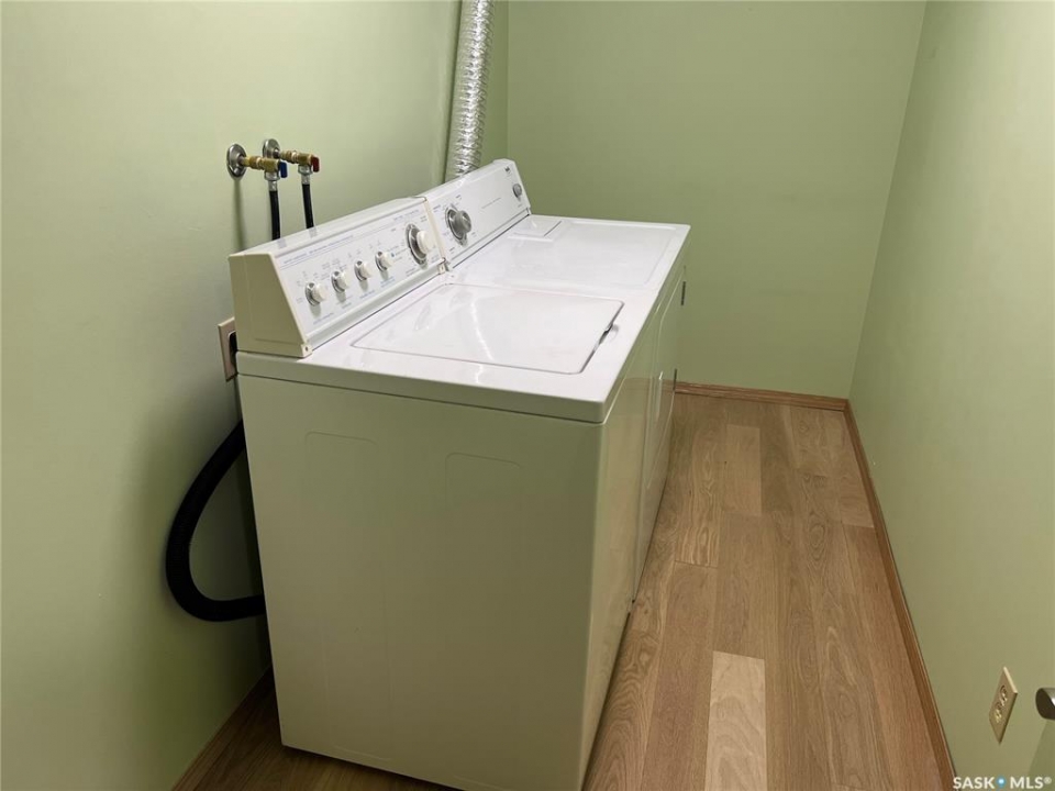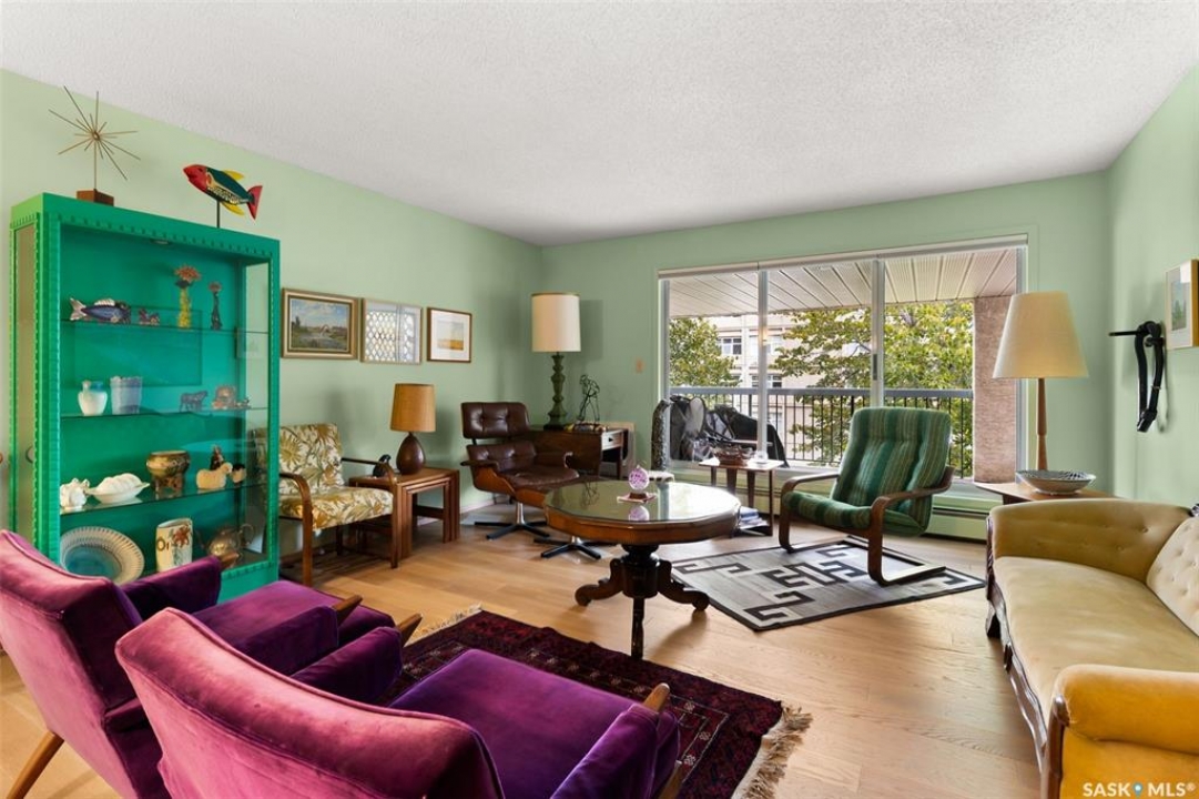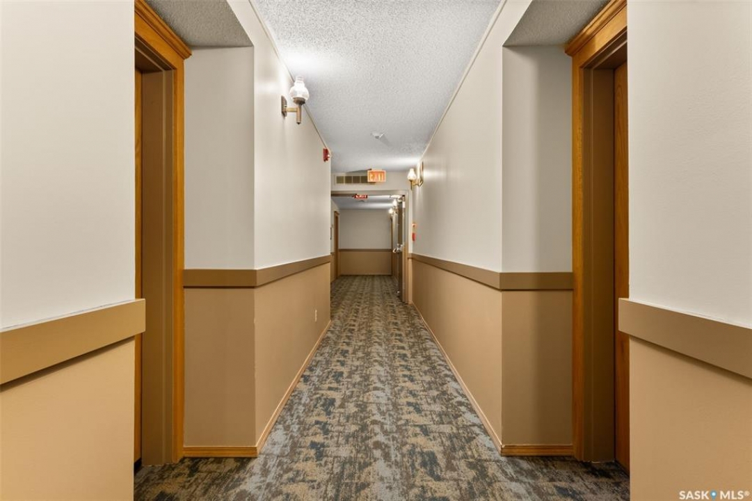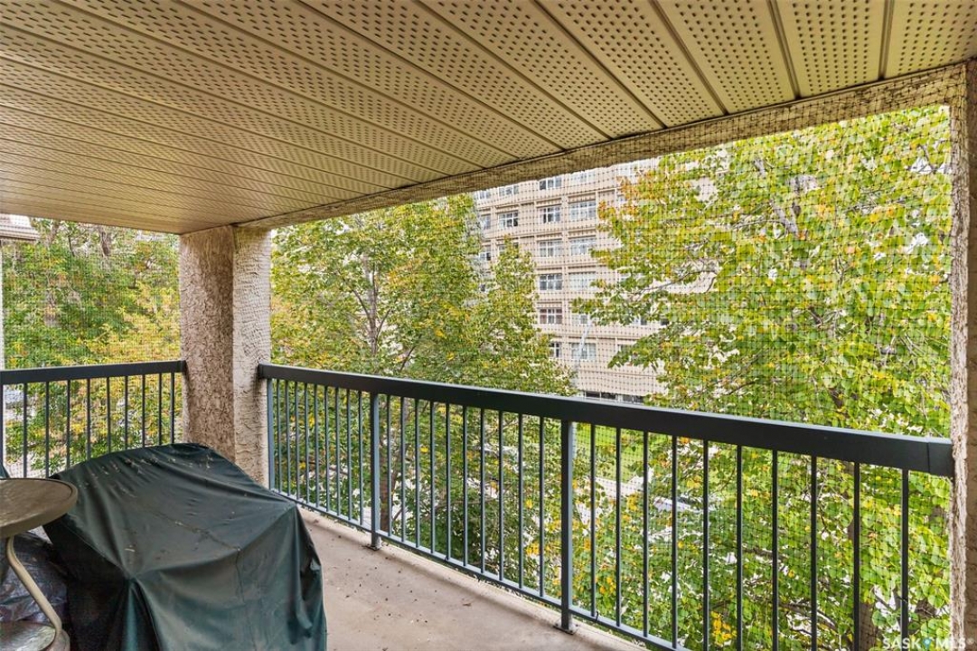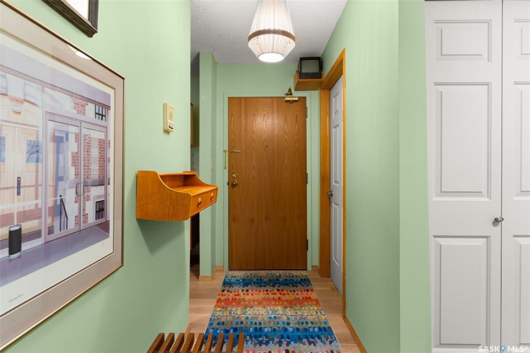 Welcome to this spacious and thoughtfully designed one-bedroom, one-bathroom condo in the heart of downtown. Inside, you'll find a well-appointed kitchen with generous counter space and a layout that comfortably accommodates two people. The in-suite laundry room and dedicated storage add convenience, while engineered hardwood floors, granite countertops, newer cabinets, and updated fixtures elevate the overall aesthetic. The bedroom easily fits a king-size bed along with additional furniture, and features a large walk-in closet for ample storage. Step outside to a covered 18' x 10'9 patio—perfect for summer gatherings, rain or shine—with room for a table, chairs, and a barbecue. All 4 appliances and a bar fridge are included. Although pets are not permitted, the location offers unbeatable access to all downtown amenities just a short walk away. Residents enjoy one electrified surface parking stall and access to beautifully refreshed common areas, including new carpets, fresh paint, a modernized elevator, new boiler and an updated amenities room complete with a lounge and bar area. This well-managed building is ready to welcome its next owner. Condo fees cover heat, water, garbage removal, common area maintenance, building insurance, and reserve fund contributions. Visitor parking is available at the rear of the building —contact your Realtor today to book your showing.