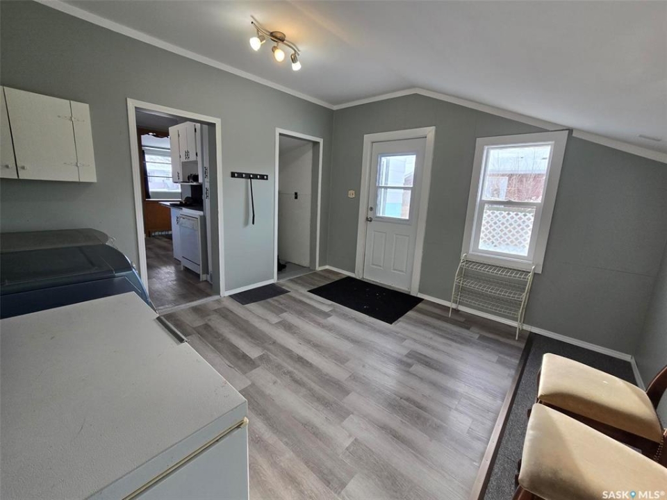 806 Pheasant Street, Grenfell ... a great starter home for a family. Located in the heart of a progressive town not far from all the amenities and 2 schools. A solid home with recent paint and flooring and is vacant and ready for a New Beginning. Could this property be for you? With 3 bedrooms on the second floor and a spacious 4 piece bath , and a 1/2 bath located on the main level , it provides great living and sleeping space in a combined total of 1018 sq ft. The back entry is sunny and bright , a huge area for all your storage needs and main floor laundry. Enter the basement from here to find a small area , partially finished to use as desired. Step into the "Galley Style " kitchen with fresh classic white cabinets. Dining room has a built in cabinet and the living room has lots of natural light filtering in. Assets to include: 100 amp panel, most vinyl windows replaced, new flooring, painted neutral upstairs and down, fenced yard for your furry friends, power vent water heater, NG HE furnace, Shingles are newer and back shed has been painted. STARTER comfortable home and all it really needs is YOU!