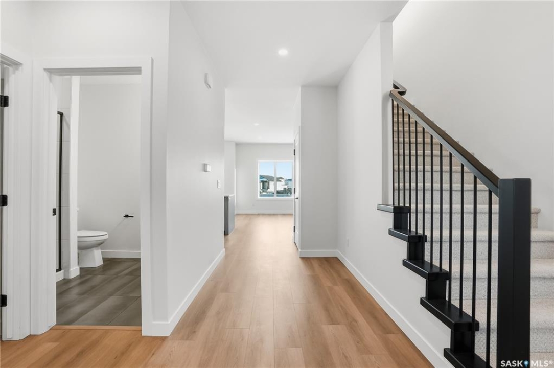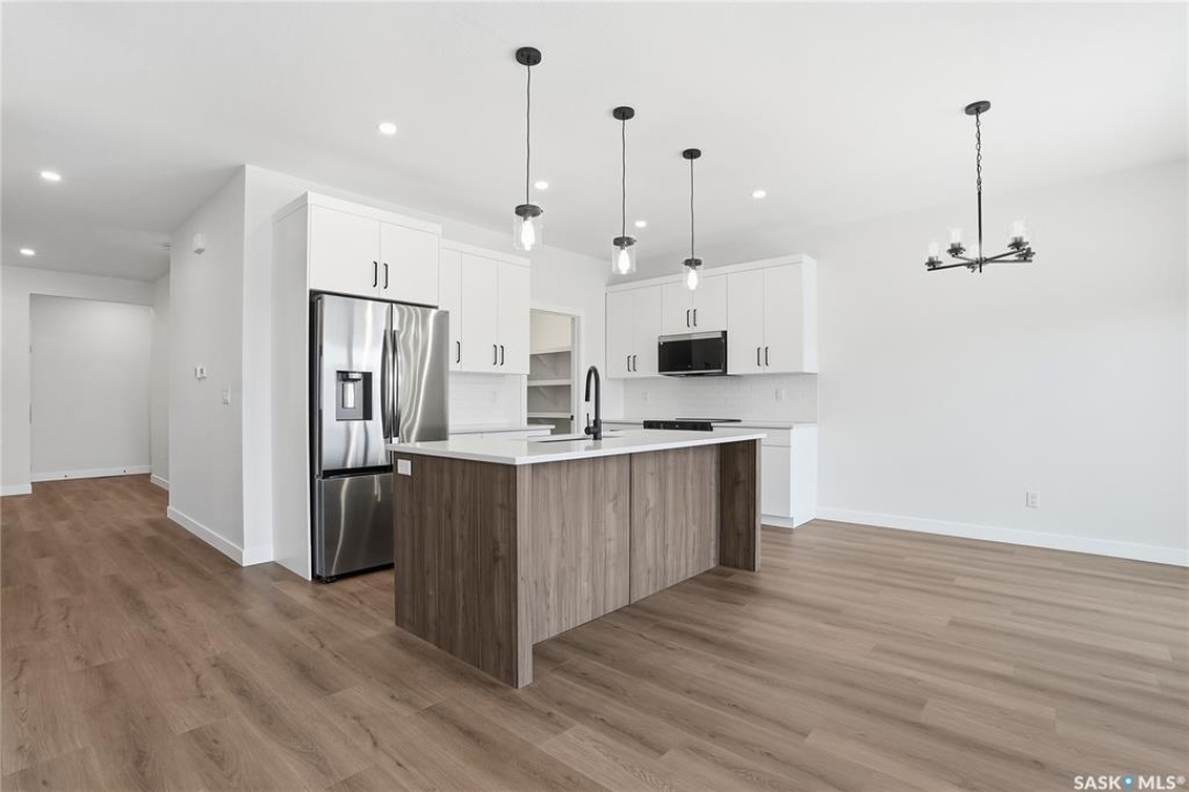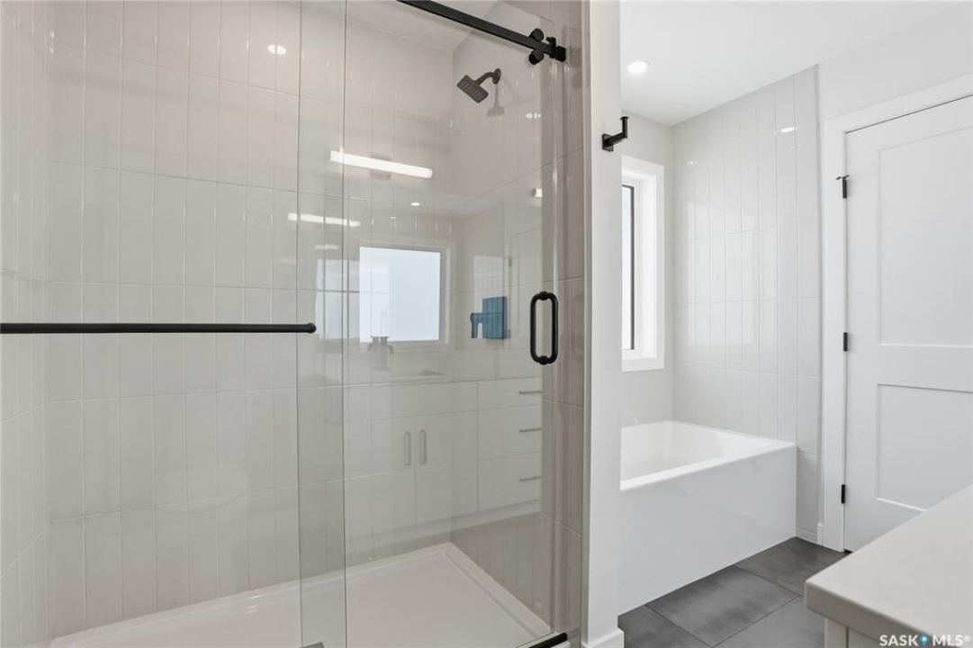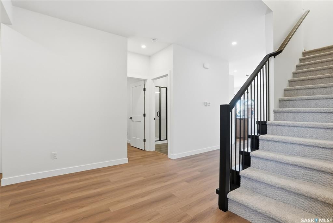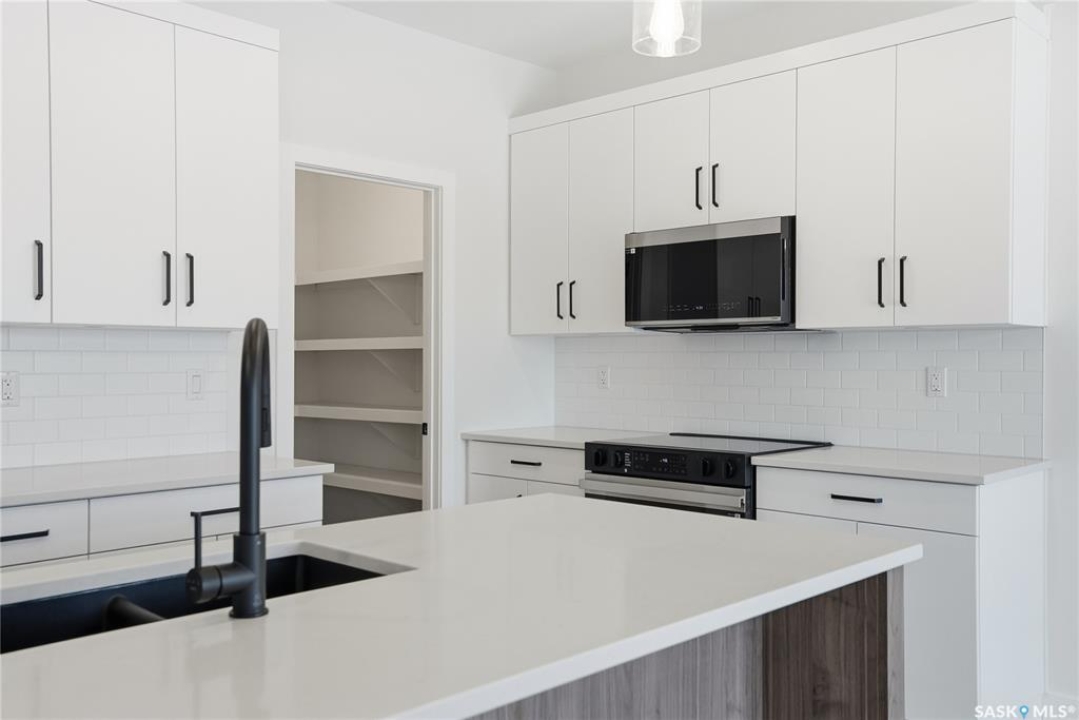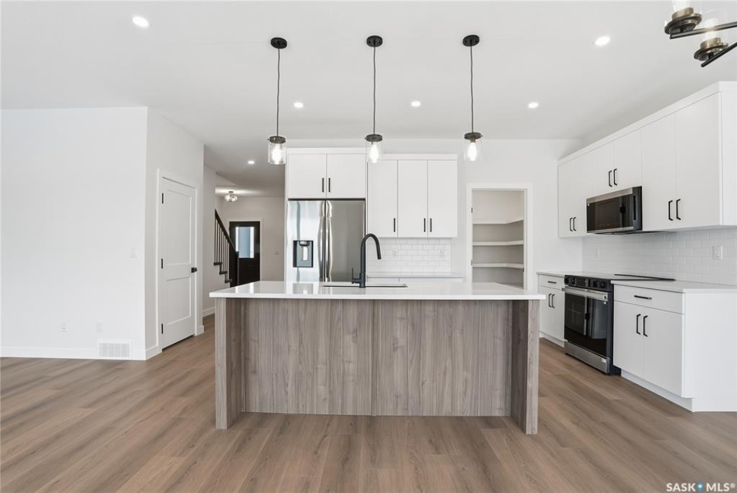 Modern 1,993 sq. ft. two-storey home featuring a rare main-floor bedroom and 3-piece bathroom, ideal for guests or multi-generational living. This 4-bedroom design offers 9' ceilings on the main level, laminate flooring throughout the main and second floors, and ceramic tile in bathrooms with tiled shower surrounds. The kitchen showcases a large quartz island, subway tile backsplash, soft-close cabinetry, walk-in pantry. Upstairs includes additional bedrooms and a well-appointed ensuite with double sinks, soaker tub, and custom tiled shower with glass enclosure. Additional highlights include pot lighting inside and out, upgraded black fixtures, comfort-height toilets, on-demand hot water, HRV, and high-efficiency furnace. Exterior is complete with triple-pane windows, covered front entry, concrete driveway, front landscaping.