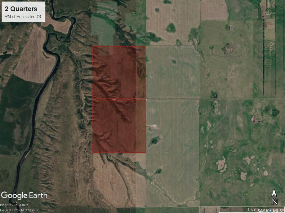 Two quarter sections for sale located southwest of Oxbow, SK in the RM of Enniskillen #3. These two quarters are a good mix of cultivated acres and native grass acres. SAMA Field Sheets identify 175 cultivated acres and 143 native acres. The land is rated T1 – level to nearly level topography and T3 - moderate slopes. Location & Access: There is access to the land via an east-west grid road. Occupancy: The land is available for immediate occupancy (there is no lease in place). ASKING PRICE: $695,000.00, $1,545.62 / Titled Acre, 1.44 x 2025 SAMA Assessed Value. Offers to be submitted to Sellers Brokerage in writing on or before March 17, 2026 at 12:00PM. Highest or any offer not necessarily accepted.
