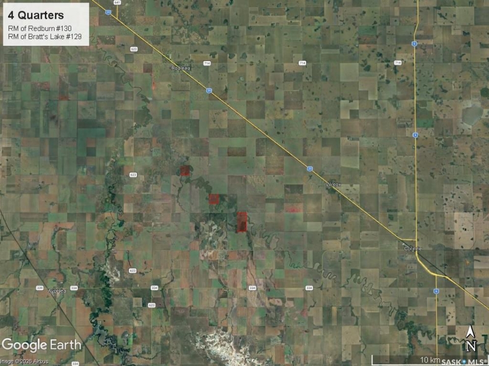 Four quarter sections for sale located west of Wilcox, SK in the RM of Bratt's Lake #129 & RM of Redburn #130. These four quarters are predominantly crop land with some native grass acres. SAMA Field Sheets identify 371 cultivated acres and 120 native acres. The land is all rated T1 – level to nearly level topography. The cultivated acres are rated S1 – none to few stones. Location & Access: There is access to most of this land via grid roads. Occupancy: The land is available for immediate occupancy (there is no lease in place). ASKING PRICE: $995,000.00 $2,179.09/Titled Acre, 1.39 x 2025 SAMA Assessed Value. Offers to be submitted to Sellers Brokerage in writing on or before March 24, 2026 at 12:00PM. Highest or any offer not necessarily accepted.