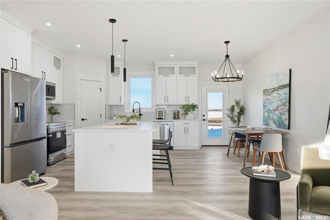 Experience the perfect blend of modern design and everyday functionality in this brand-new 1430 SQFT home built by Taj Homes. This home comes with a fully developed basement featuring two bedrooms, one bathroom, mini bar and an electric fireplace finished with shiplap. On the main floor, the kitchen features floor to ceiling cabinetry, quartz countertops, and a full set of stainless steel appliances, seamlessly connecting to the open concept living and dining areas with an electric fireplace and oversized windows. The home offers three bedrooms and three bathrooms in total, including a primary suite with a custom feature wall, walk in closet and 5 piece ensuite complete with a tiled/glass walk in shower and tiled tub surround and his/her vanities. Main Floor bathrooms include full height tiled surrounds with Delta fixtures and quartz countertops. Built in shelving is provided in the pantry and bedroom closets, along with a convenient main floor laundry room. The oversized heated, insulated and drywalled double attached garage measures 25 x 26 (two overhead doors 10ft and 9ft) and includes a concrete driveway. Additional features include All Weather triple pane windows, on demand water heater and central A/C. The rear deck is included and finished with treated wood planks and aluminum railing, along with partial fenced yard. Backed by Progressive New Home Warranty with a guaranteed possession date. Pictures are from a previous build, finishes are similar.