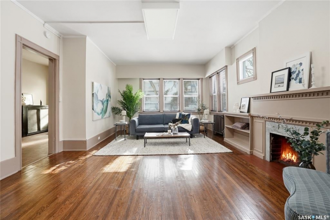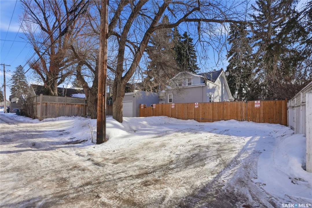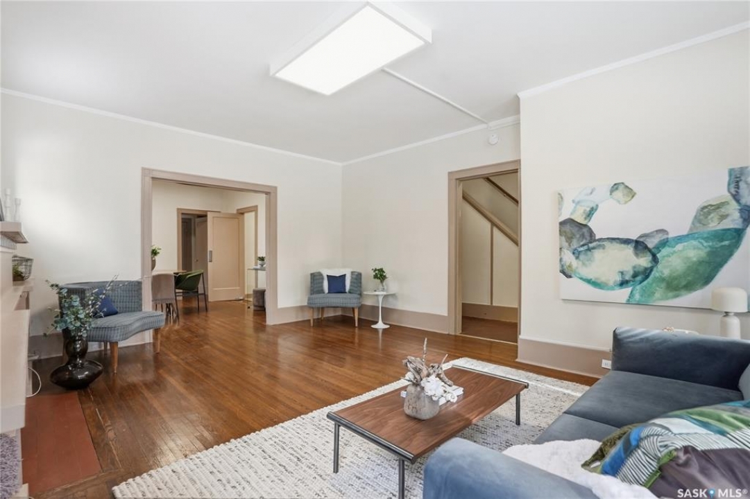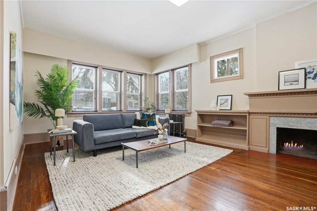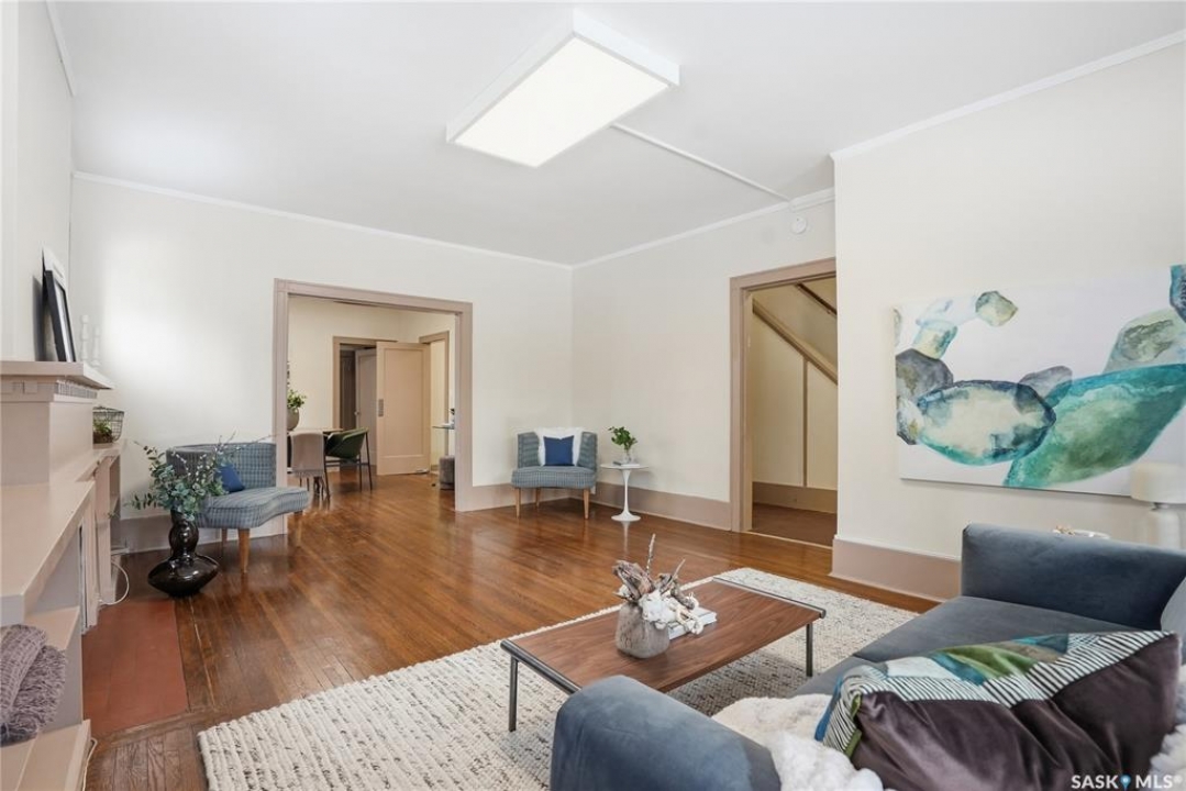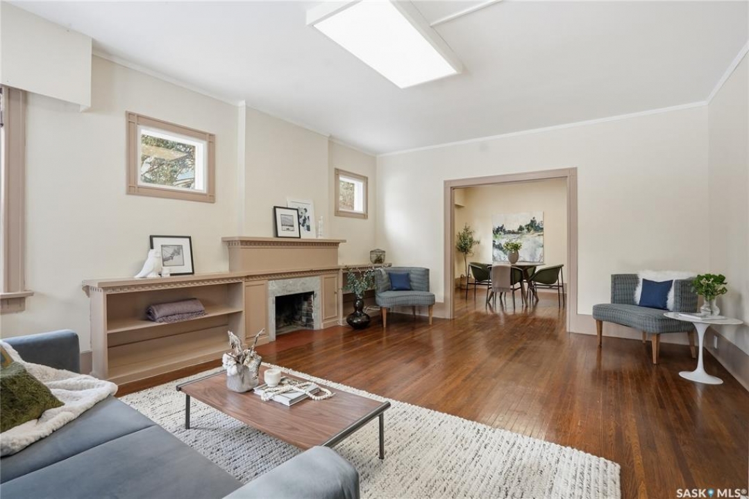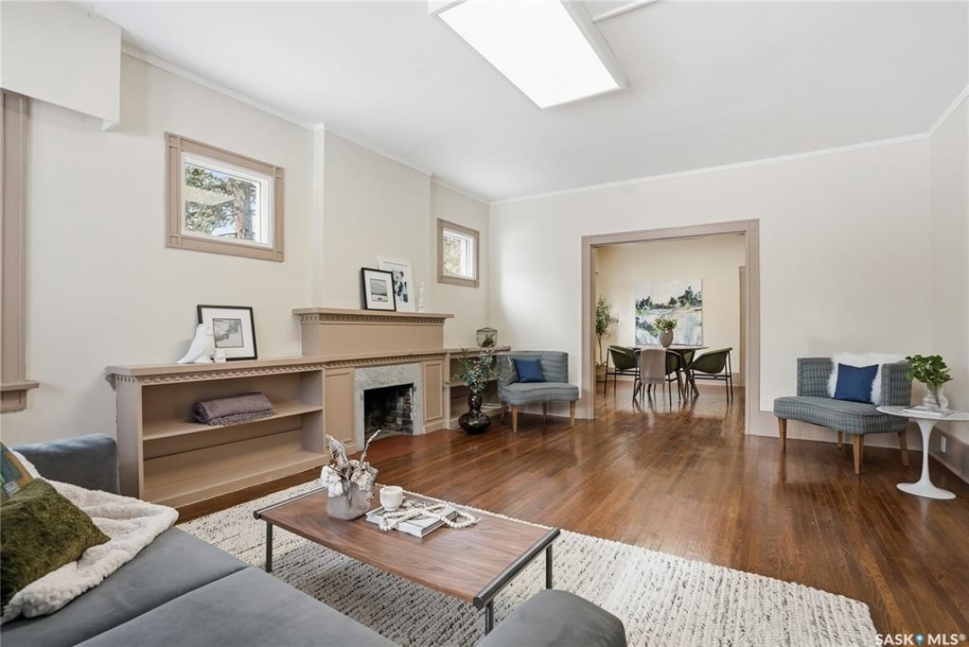 Opportunities exist here in so many ways — investment property, holding property, viable rental with several income streams incl 6 parking stalls, future Residential Corridor redevelopment, multi-family site, or luxury home building site: subdivision to 2 x 30' lots. This well-cared-for and updated home sits on a 60x140 ft lot on beautiful Elliott St E, 1 block to the University of Saskatchewan- the property offers incredible flexibility! Featuring a side entry, two kitchens, 4 beds on the second level, 3 beds in the lower level, and three bathrooms, this property presents strong rental potential or comfortable liveable holding value. Updates include shingles, windows (2025), updated boiler and 300 amp electrical, much more. The rear of the property provides an attached single garage plus six parking stalls, offering excellent additional revenue potential. The storybook front façade welcomes you with a winding sidewalk leading to a front entry. Inside, a foyer opens to the spacious and open great room showcasing the original fireplace with built-in shelving and beautiful corner windows. A large formal dining room is attached off the living area. The main floor also includes a large bedroom (or study) with additional built-ins, a 2-piece bath, and a roomy closet. The adjacent kitchen features wood cabinetry, a peninsula with eating bar, stainless appliances including a Bosch wall oven. Oak treads lead to the second floor where you will find three very large bedrooms, all with refinished hardwood floors, and a spacious 3-piece family bathroom. The fully dev basement offers a separate entry and includes a kitchen, living room, 3 bedrooms, laundry, and a 4-pc bath. The 8400 sq' lot presents long-term potential, including the option for subdivision into 2 x 30' lots or future redevelopment under the Corridor Residential Community Plan, allowing for potential Multiple Unit Dwelling development (see members' remarks), subject to development standards.