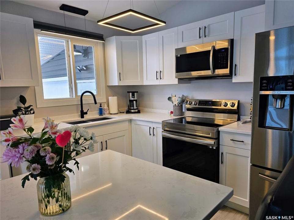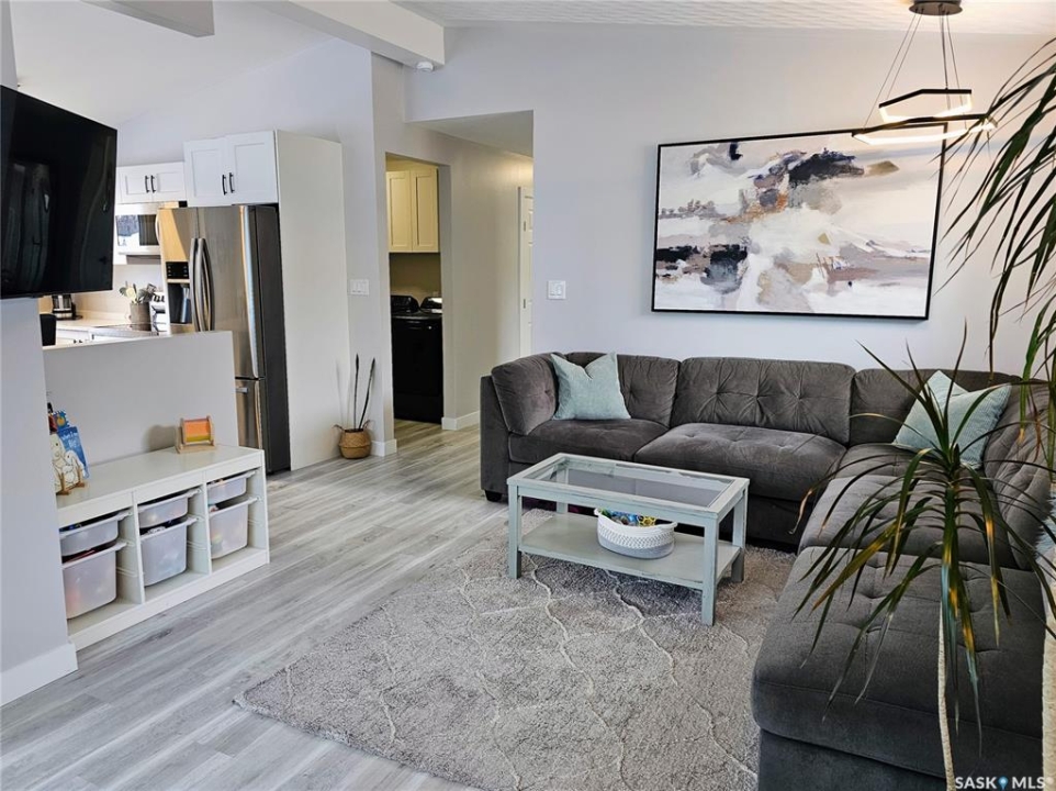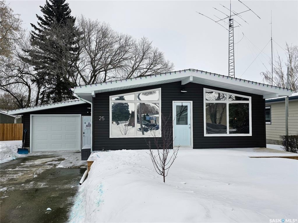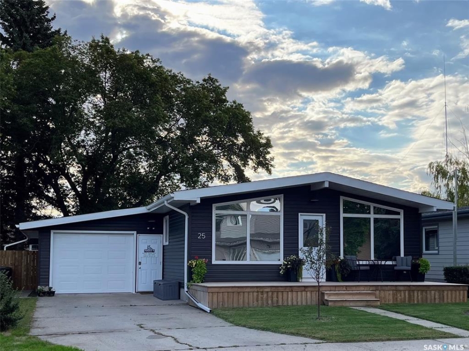 25 King Crescent in Humboldt offers the space, updates, and layout buyers are looking for. Renovations and exterior improvements have already been completed, giving this home a fresh, modern feel throughout. Meticulously maintained, pride of ownership is evident inside and out. Step inside to a bright main floor with vaulted ceilings and large front windows that bring in plenty of natural light. Vinyl plank flooring runs throughout the main living areas. The kitchen has been updated with white cabinetry, quartz countertops, stainless steel appliances, a functional island, and modern lighting. It opens directly to the dining and living room, creating a practical, open layout. Three bedrooms are located on the main level, including a primary bedroom with double closets and a two-piece ensuite. A full four-piece bathroom is also on the main floor. The basement provides additional living space with a large family room, one bedroom, a three-piece bathroom, storage room, and a den with a walk-in closet (window does not meet egress requirements for bedroom use). The attached garage is insulated, heated with electric heat, finished with custom flooring, and leads into a mudroom with laundry. Situated on a large pie-shaped lot, the fully fenced yard features mature trees, green space, and a patio area, along with a natural gas BBQ hookup. Recent updates include central air added in 2023 with a smart thermostat, new siding (2023), new roof and shingles (2023), new soffits and fascia (2023), new front windows (2023), new garage windows (2024), upgraded exterior lighting (2023), front and rear decks (2024), and a new fence (2024). This home has so much to offer and is sure to impress.