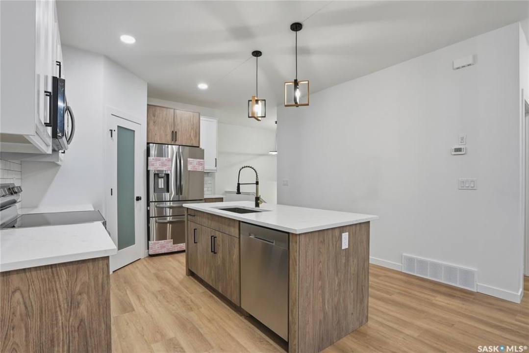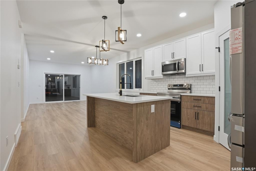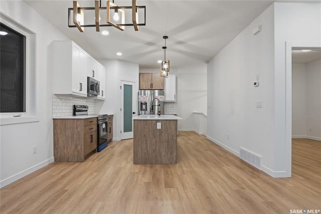 Great location with this Beautiful newly built house that is situated in the popular Kensington area of Saskatoon! Kensington has parks, walking paths, schools & close proximity to many amenities. This stunning newly built home is a 1251 sq. ft modified Bi-level with a double attached 23x20 garage and a finished 2-bedroom legal basement suite. The house boasts exceptional craftsmanship and attention to detail for anyone looking for a luxurious and comfortable living space. The main features upgraded 6.5mm vinyl plank flooring, it has a large foyer, open concept kitchen to dining/living area, a 4-piece bathroom, 2 good sized bedrooms and access to the garage as well as the utility room with plenty of storage. The 2nd floor of the home has a large primary bedroom that features a walk-in closet and a 3-piece ensuite bathroom. The basement has separate entry into a legal 2-bedroom basement suite. It features 2 bedrooms, a 4-piece bathroom, laundry, kitchen, living and dining area. There is the possibility to qualify for the Sask. Secondary Suite Incentive (SSI) Grant Program where the ministry of finance provides 35% of the total price to construct a new secondary suite at an owner's primary residence, to a maximum grant of $35,000 per qualifying property. There will be a concrete driveway & front landscaping that has sod on both sides/1 tree included. Saskatchewan New Home Warranty is included. GST/PST is included in the purchase price with the rebate to the builder. Appliances are included. Do not wait! Call to view! (Photos are of a similar built house., house is almost completed.)