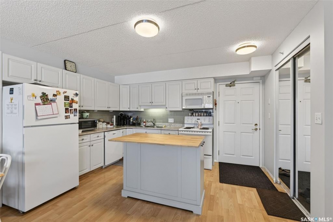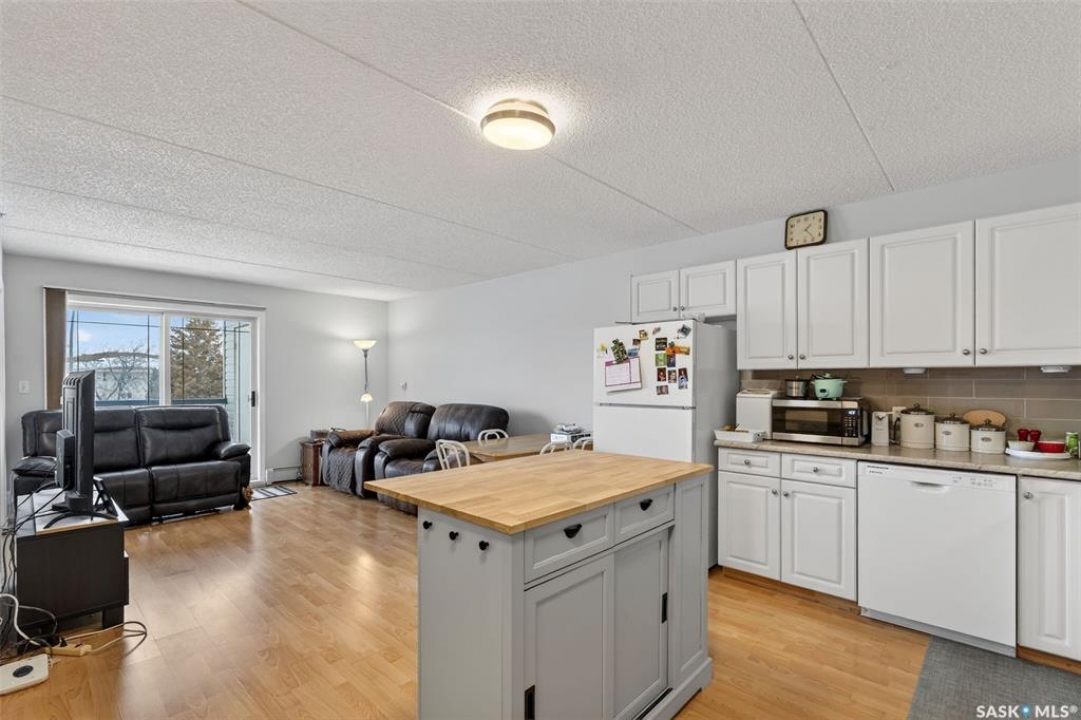 Enjoy low maintenance living in the desirable Regency Arms condo complex, ideally located across from Kinsmen Park and close to everyday amenities! The bright kitchen is both stylish and functional, featuring crisp white cabinetry, a newer modern backsplash, a newer fridge and new dishwasher, creating a welcoming space for casual dining and entertaining. The living room is filled with natural light and opens directly onto the balcony, perfect for enjoying your morning coffee or unwinding in the evenings. The balcony also features two private storage rooms for added functionality. There is also a spacious bedroom that has newer carpet, a versatile den for a home office or hobby space, a 4 piece bathroom, and a convenient laundry room, all enhanced by newer paint throughout that gives the unit a fresh and updated feel. Additional features include underground parking and elevator access, providing both convenience and accessibility. A comfortable and easy lifestyle awaits. Act now and make this your next move!