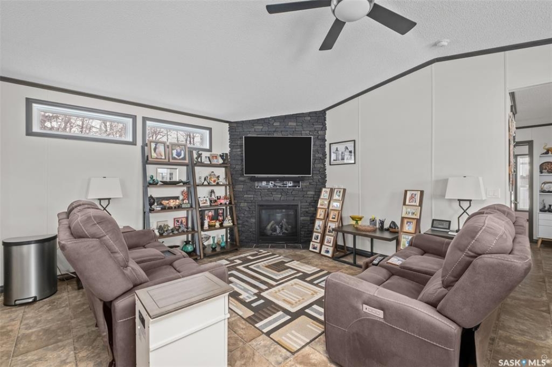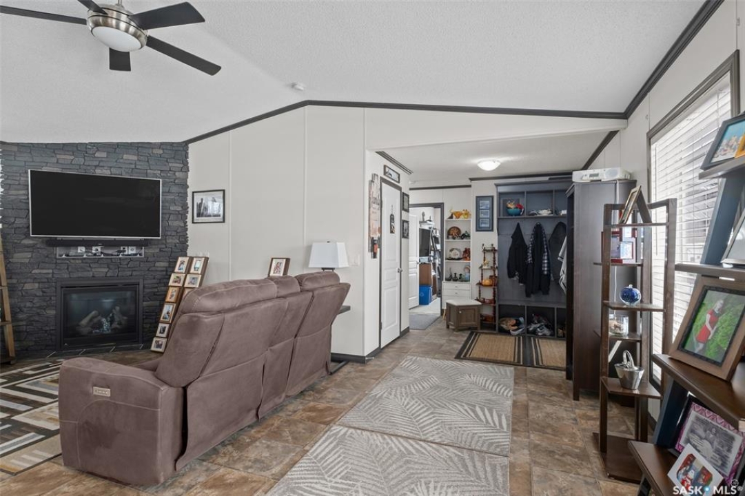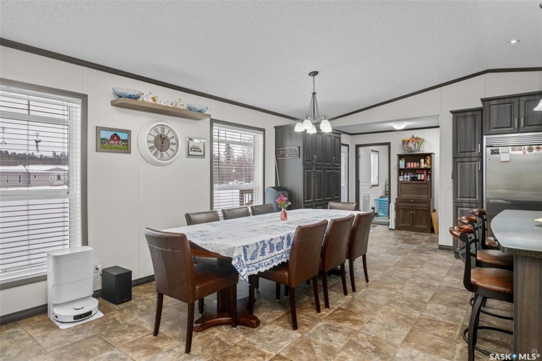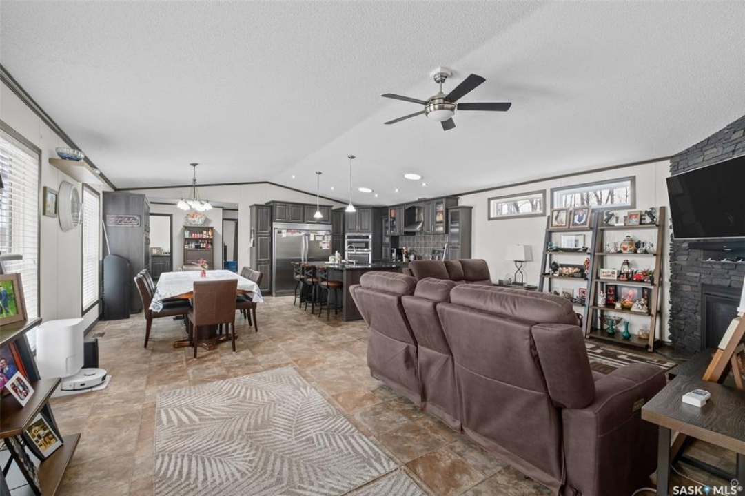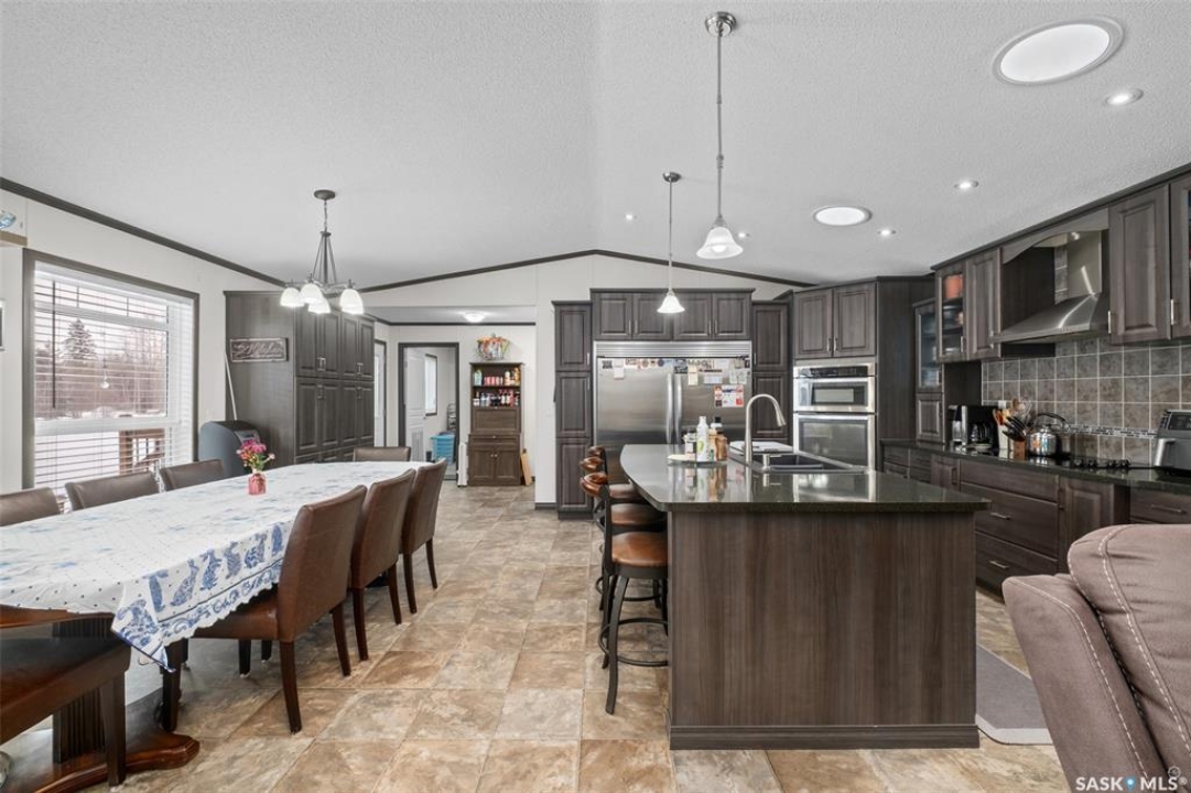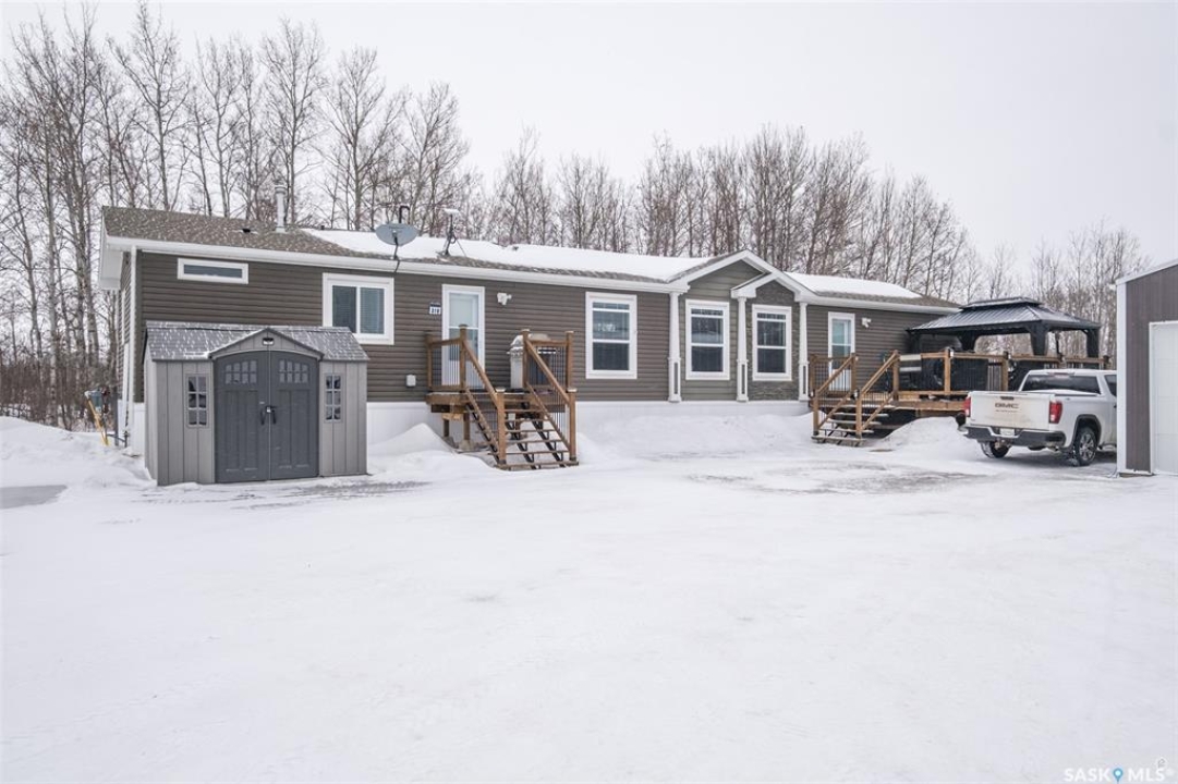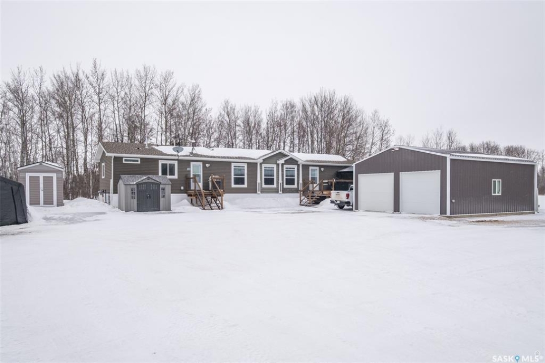 Exceptional 2016 built 3 bedroom and 2 bathroom premier show model manufactured home offering spacious design, quality finishes and small town living just minutes from the city. The open concept main living area is bright and beautifully laid out with vaulted ceilings, an abundance of windows and stylish pot lighting that enhances the modern feel throughout. The living room features a cozy gas fireplace with a dark grey stone surround and the dining area offers plenty of space for a large table. The kitchen showcases rich dark brown cabinetry, stainless steel appliances, an oversized fridge and freezer, built-in stovetop with stainless steel hood fan, built-in oven and microwave and a massive island with bar seating that makes gathering effortless. The primary bedroom offers a private retreat complete with a generous walk-in closet and a luxurious 5 piece ensuite featuring a jacuzzi tub, dual sinks and a stand up shower. Two additional well sized bedrooms, a full 4 piece bathroom and a convenient laundry room with its own sink complete the thoughtful layout. The property includes mature trees and a spacious deck ideal for relaxing or entertaining. A 24 x 32 heated two car garage with 10 foot ceilings and spray foam insulation provides ample space for vehicles, storage or a workshop. Located in the welcoming community of Holbein, just 20 minutes from Prince Albert and 10 minutes from Shellbrook, this property delivers rural charm and everyday convenience. A fantastic opportunity to enjoy modern comfort in a quiet small town setting. Call today to take the next step.