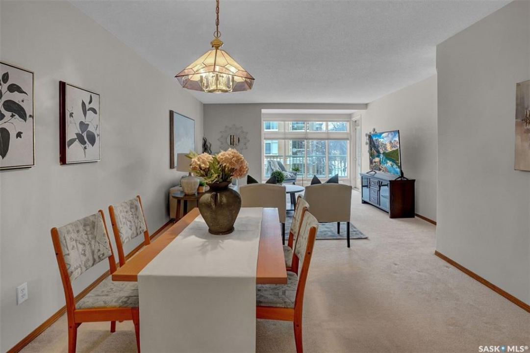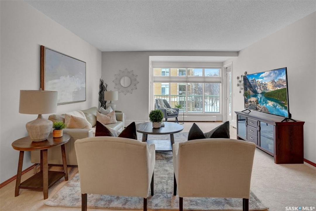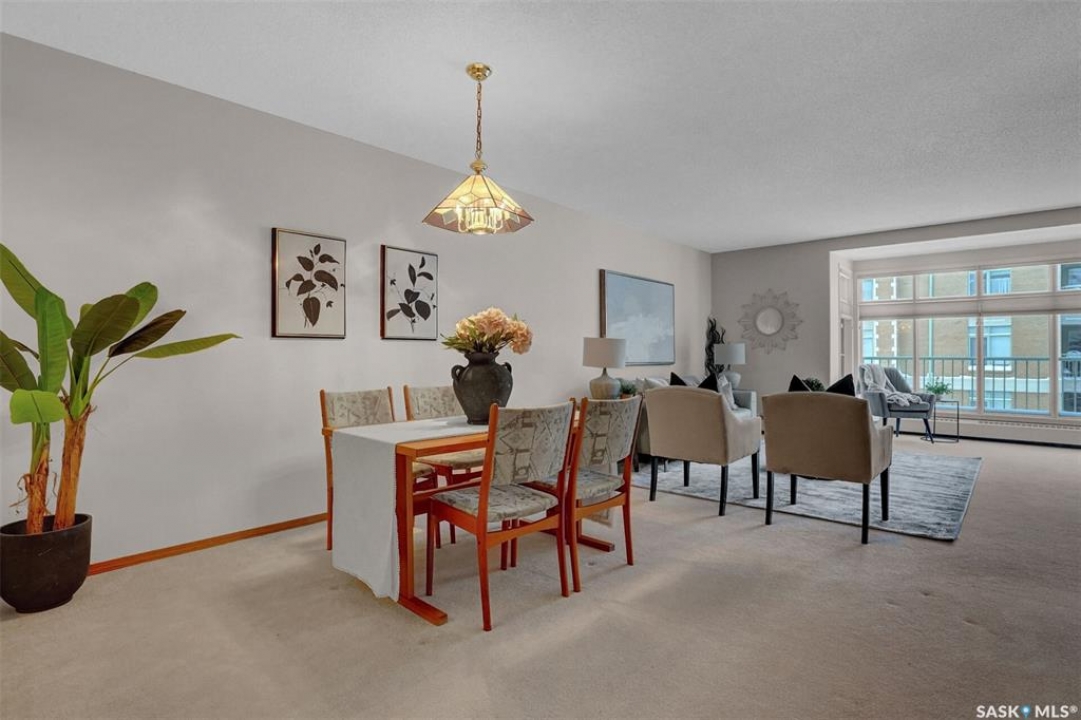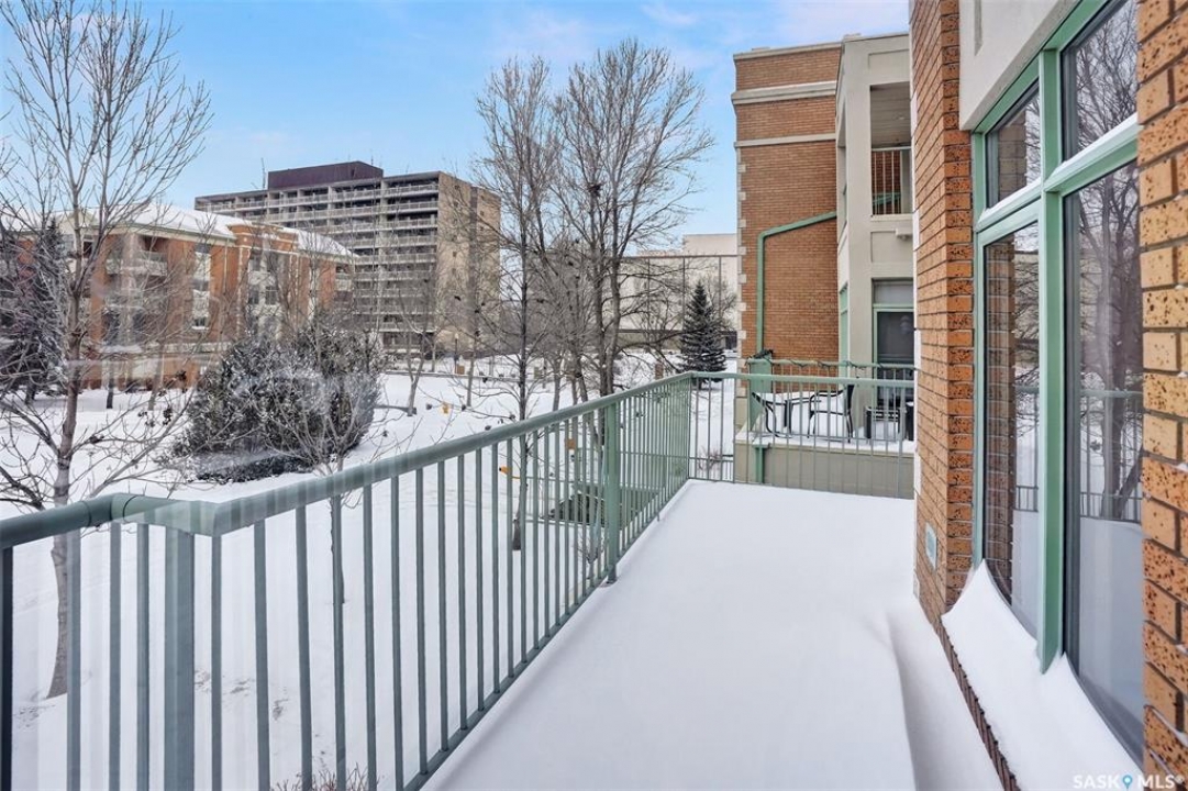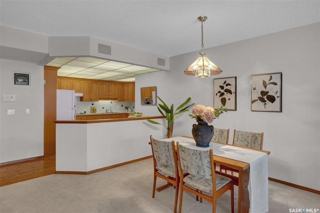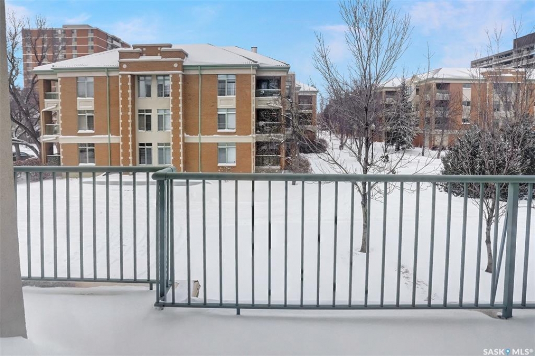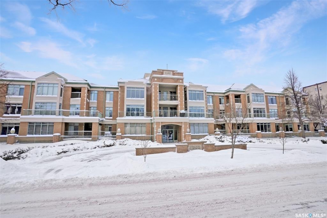 Welcome to this beautifully maintained 1,249 sq ft condo in the prestigious College Gardens complex. Offering 2 bedrooms and 2 bathrooms, this spacious unit combines comfort, functionality, and an unbeatable location directly across from Wascana Park. Filled with natural light, the open-concept living and dining areas are enhanced by a full wall of windows and direct access to your private balcony overlooking peaceful greenspace. The generous dining area easily accommodates large family gatherings, while the oak kitchen is in pristine condition and features a built-in oven and cooktop, tiled backsplash, pantry with pull-out drawers, and a bright eat-in nook. A large front foyer welcomes you into the unit, with a convenient laundry/storage room just off the entrance. The second bedroom is ideally suited as a guest room, home office, or library, with a 4-piece bathroom and linen closet located directly across the hall. The primary bedroom is a true retreat, offering space for a king-sized suite, a cozy reading nook with views of the greenspace, a 6'5" x 5'8" walk-in closet, and a private ensuite complete with a walk-in shower featuring dual seating. Constructed with concrete, this building provides exceptional soundproofing, privacy, and peace of mind. Additional highlights include one heated underground parking stall with a spacious 6'11" x 8'6" storage unit located directly in front of your parking space. Ideally situated with convenient access to downtown, the University of Regina, the airport, and the natural beauty of Wascana Park, this is condo living at its finest.