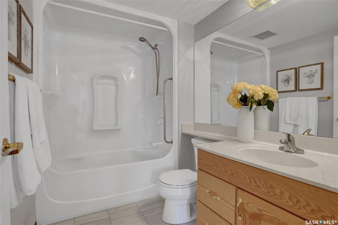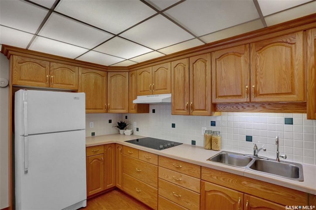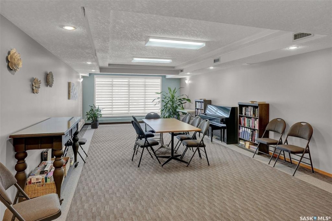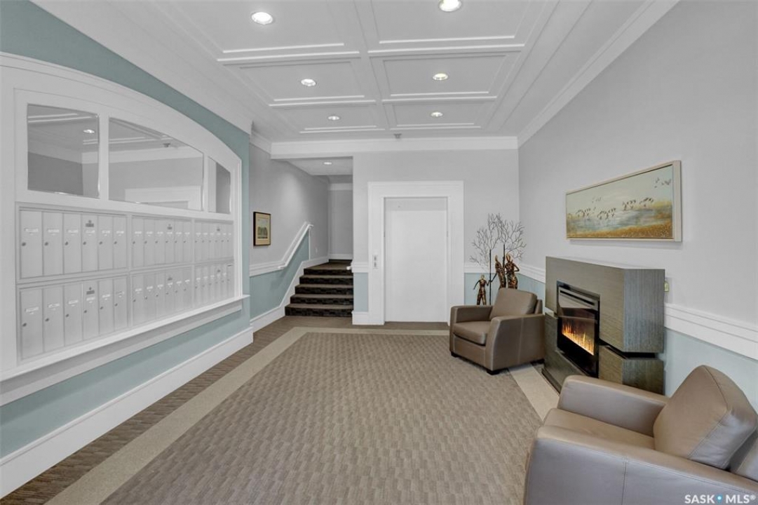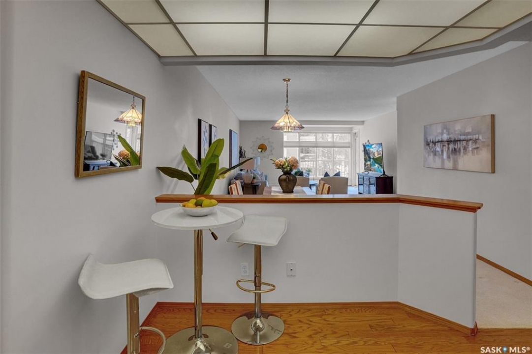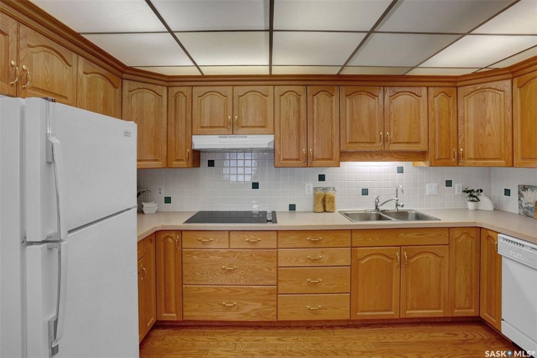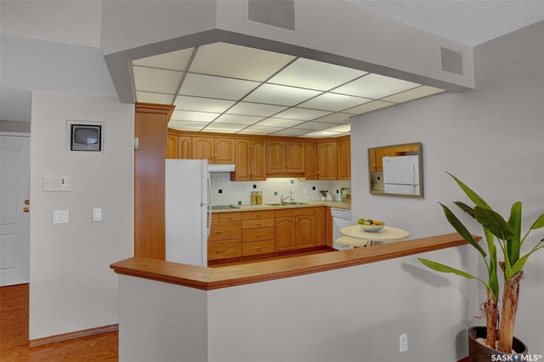 Welcome to this beautifully maintained 1,249 sq ft condo in the prestigious College Gardens complex. Offering 2 bedrooms and 2 bathrooms, this spacious unit combines comfort, functionality, and an unbeatable location directly across from Wascana Park. Filled with natural light, the open-concept living and dining areas are enhanced by a full wall of windows and direct access to your private balcony overlooking peaceful greenspace. The generous dining area easily accommodates large family gatherings, while the oak kitchen is in pristine condition and features a built-in oven and cooktop, tiled backsplash, pantry with pull-out drawers, and a bright eat-in nook. A large front foyer welcomes you into the unit, with a convenient laundry/storage room just off the entrance. The second bedroom is ideally suited as a guest room, home office, or library, with a 4-piece bathroom and linen closet located directly across the hall. The primary bedroom is a true retreat, offering space for a king-sized suite, a cozy reading nook with views of the greenspace, a 6'5" x 5'8" walk-in closet, and a private ensuite complete with a walk-in shower featuring dual seating. Constructed with concrete, this building provides exceptional soundproofing, privacy, and peace of mind. Additional highlights include one heated underground parking stall with a spacious 6'11" x 8'6" storage unit located directly in front of your parking space. Ideally situated with convenient access to downtown, the University of Regina, the airport, and the natural beauty of Wascana Park, this is condo living at its finest.