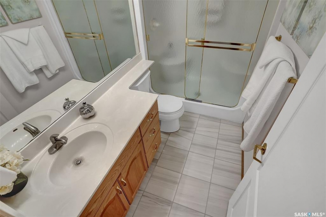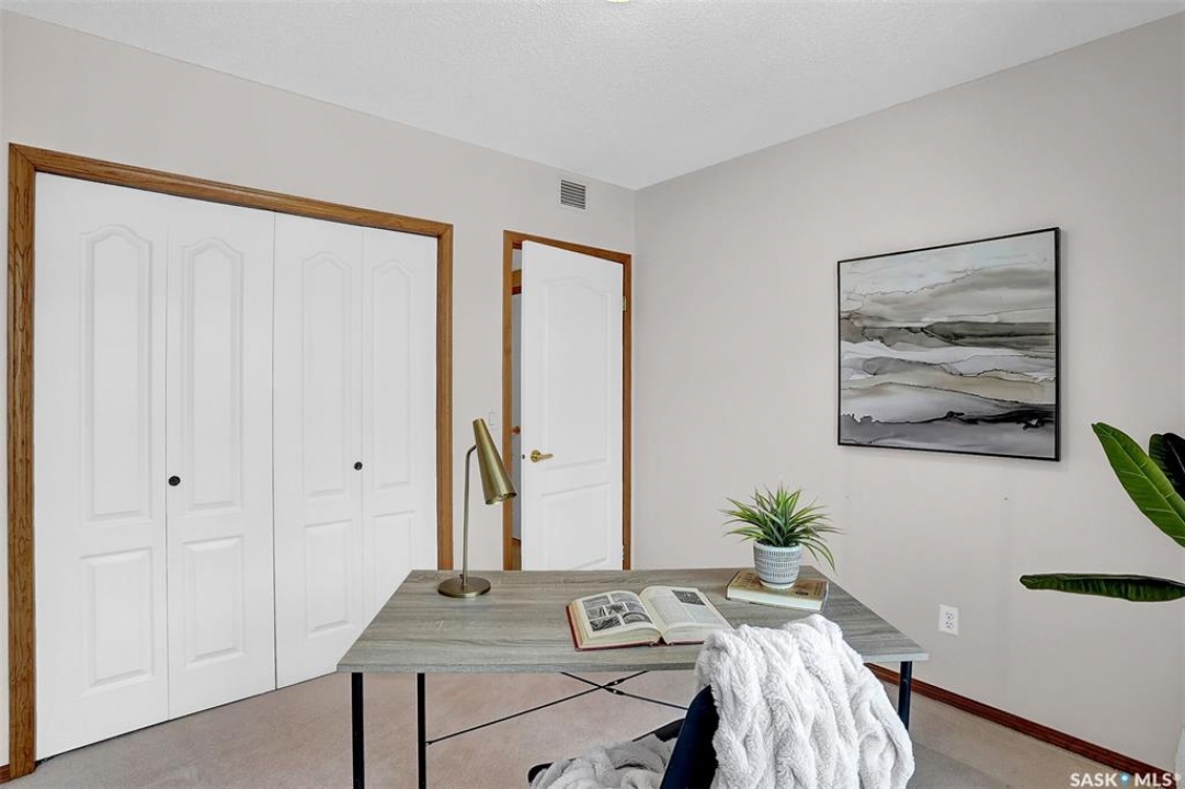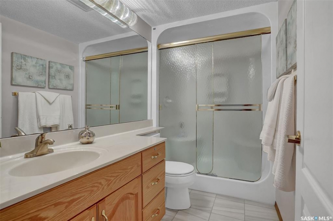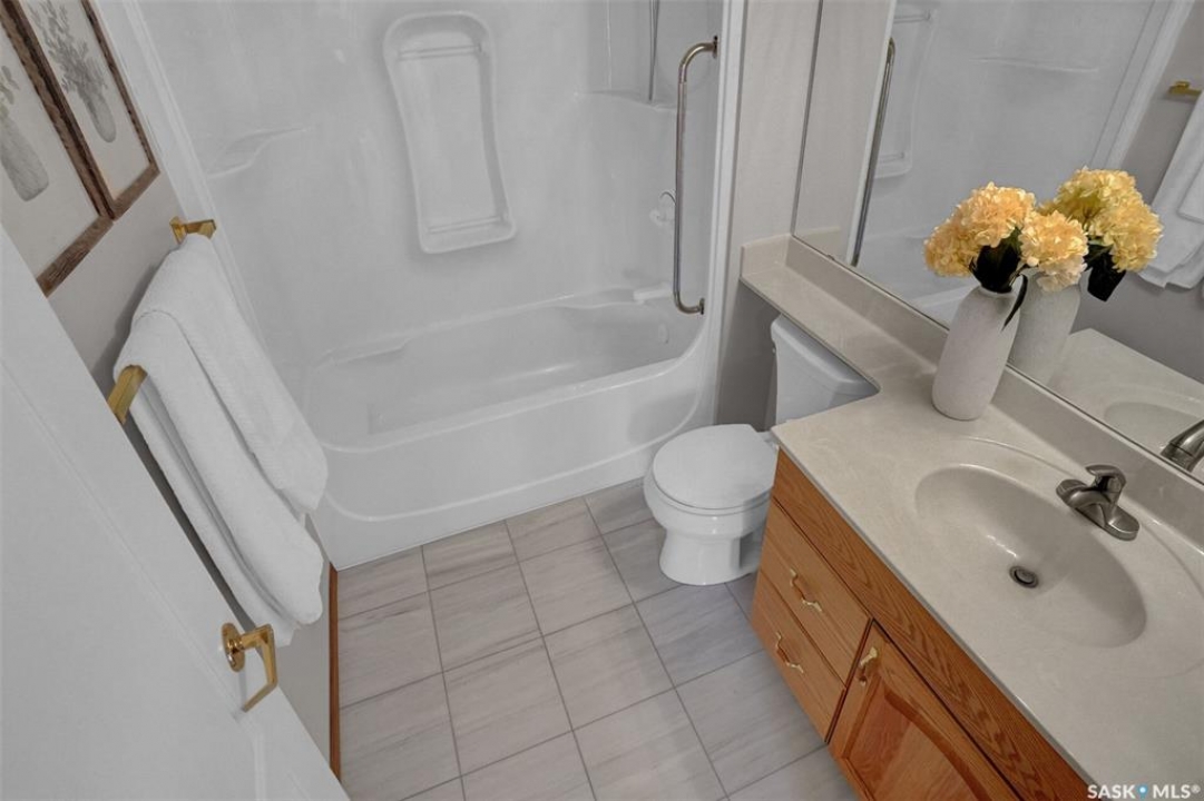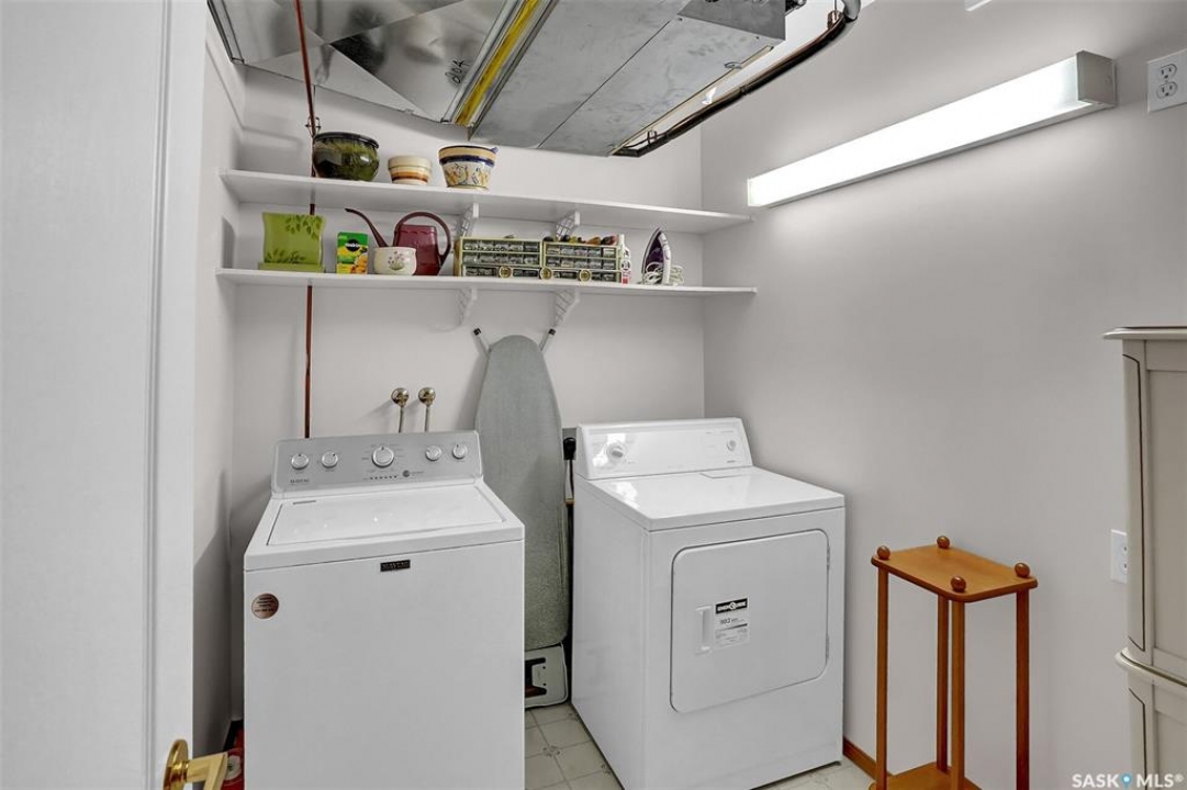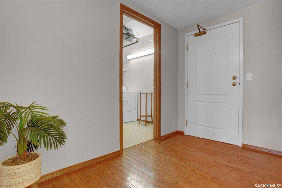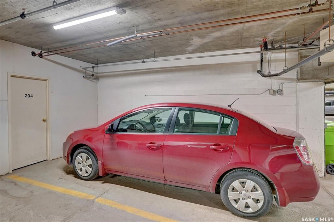 Welcome to this beautifully maintained 1,249 sq ft condo in the prestigious College Gardens complex. Offering 2 bedrooms and 2 bathrooms, this spacious unit combines comfort, functionality, and an unbeatable location directly across from Wascana Park. Filled with natural light, the open-concept living and dining areas are enhanced by a full wall of windows and direct access to your private balcony overlooking peaceful greenspace. The generous dining area easily accommodates large family gatherings, while the oak kitchen is in pristine condition and features a built-in oven and cooktop, tiled backsplash, pantry with pull-out drawers, and a bright eat-in nook. A large front foyer welcomes you into the unit, with a convenient laundry/storage room just off the entrance. The second bedroom is ideally suited as a guest room, home office, or library, with a 4-piece bathroom and linen closet located directly across the hall. The primary bedroom is a true retreat, offering space for a king-sized suite, a cozy reading nook with views of the greenspace, a 6'5" x 5'8" walk-in closet, and a private ensuite complete with a walk-in shower featuring dual seating. Constructed with concrete, this building provides exceptional soundproofing, privacy, and peace of mind. Additional highlights include one heated underground parking stall with a spacious 6'11" x 8'6" storage unit located directly in front of your parking space. Ideally situated with convenient access to downtown, the University of Regina, the airport, and the natural beauty of Wascana Park, this is condo living at its finest.
