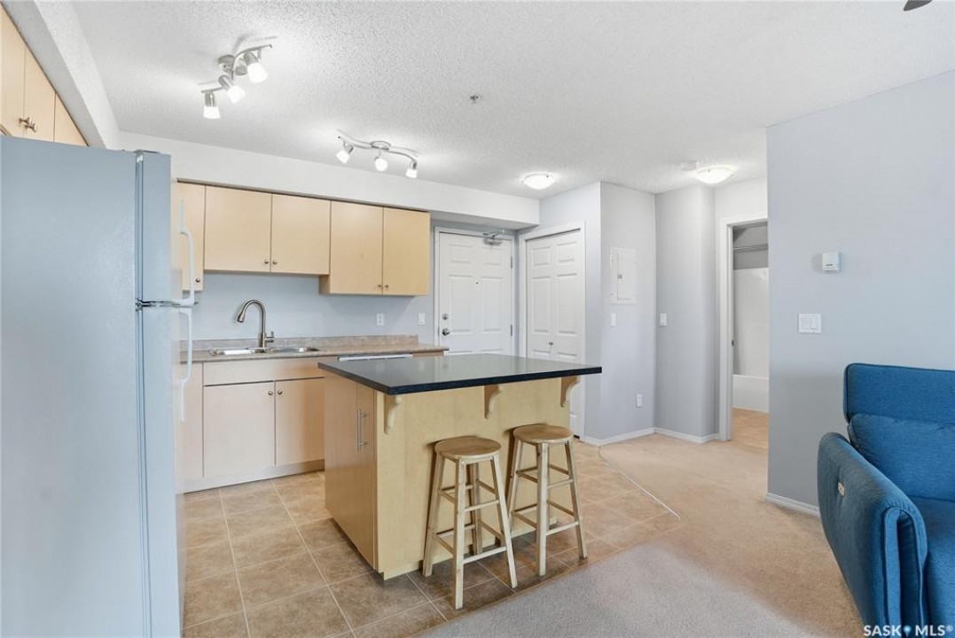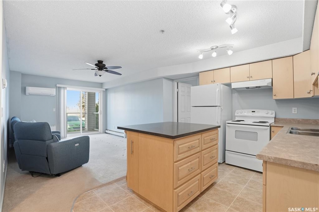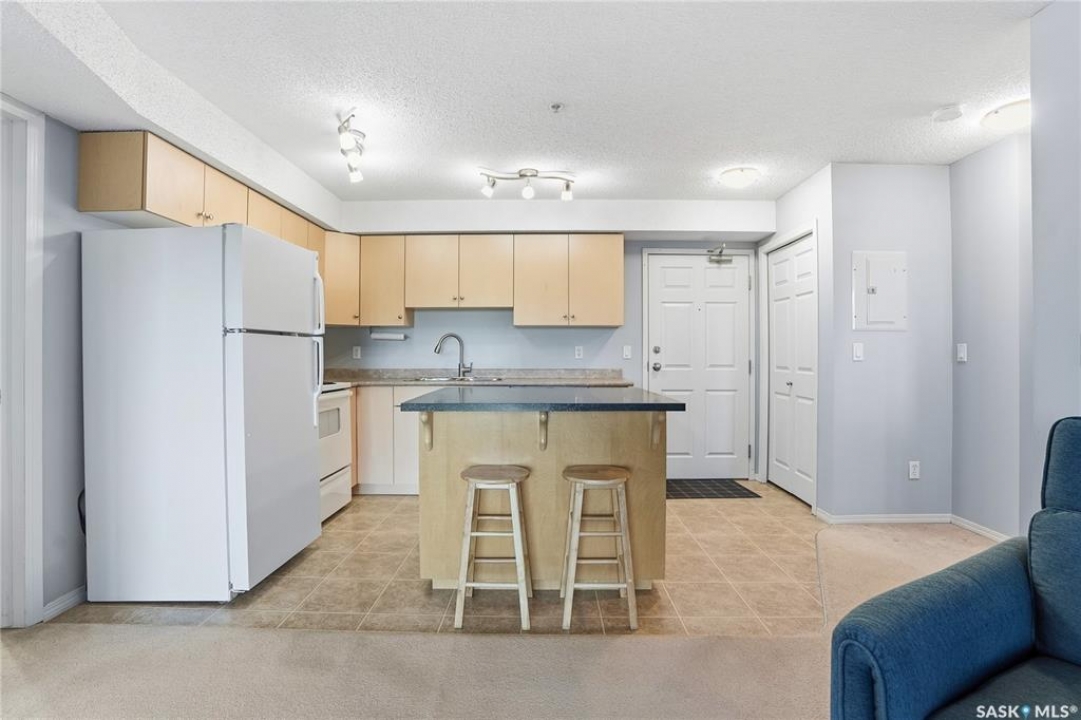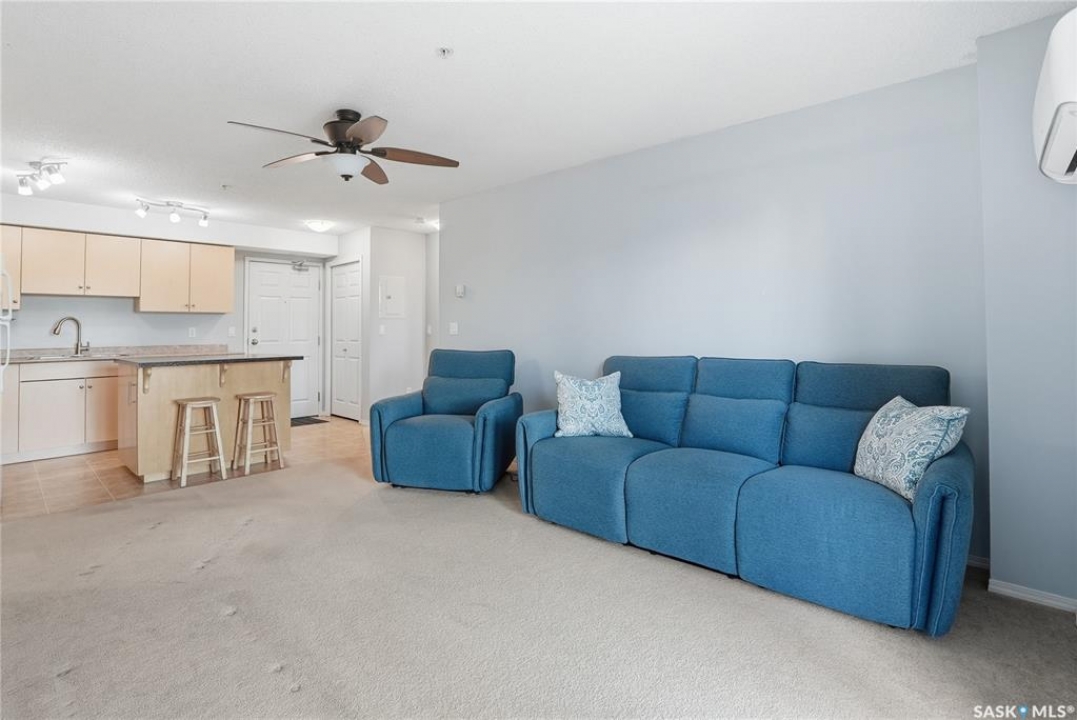 Welcome home to 303 Lowe Road unit 107. West facing views, underground parking, and a 1 + 1 configuration for a primary sized bedroom and large den - this condo shows 10/10! Step inside to find a bright main area with a kitchen that is clean and functional. Ample storage around with a custom built island that hosts drawers on either side! The living room features an updated Air Conditioner and is set for relaxing with plenty of natural light from the large patio doors. From here you have access to your own covered patio space. Inside you will find that the primary bedroom is a great size with room for a large bed and dresser. Opposite to this bedroom is a large den that could accommodate a bed and has an included closet system. The bathroom is a clean 4 piece design with laundry included. Located in University Heights you will find this to be one of the most walkable locations in Saskatoon! Steps to the bus stop and a short walk to grocery stores, restaurants, gyms, and walking paths through the Forestry Farm and the north swale. Amenities include an exercise room, elevator, and plenty of visitor parking. Well cared for and turn-key! Call today to see this exceptional home!