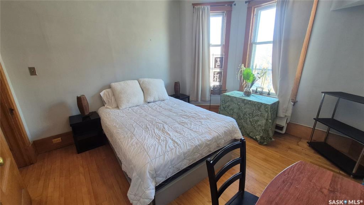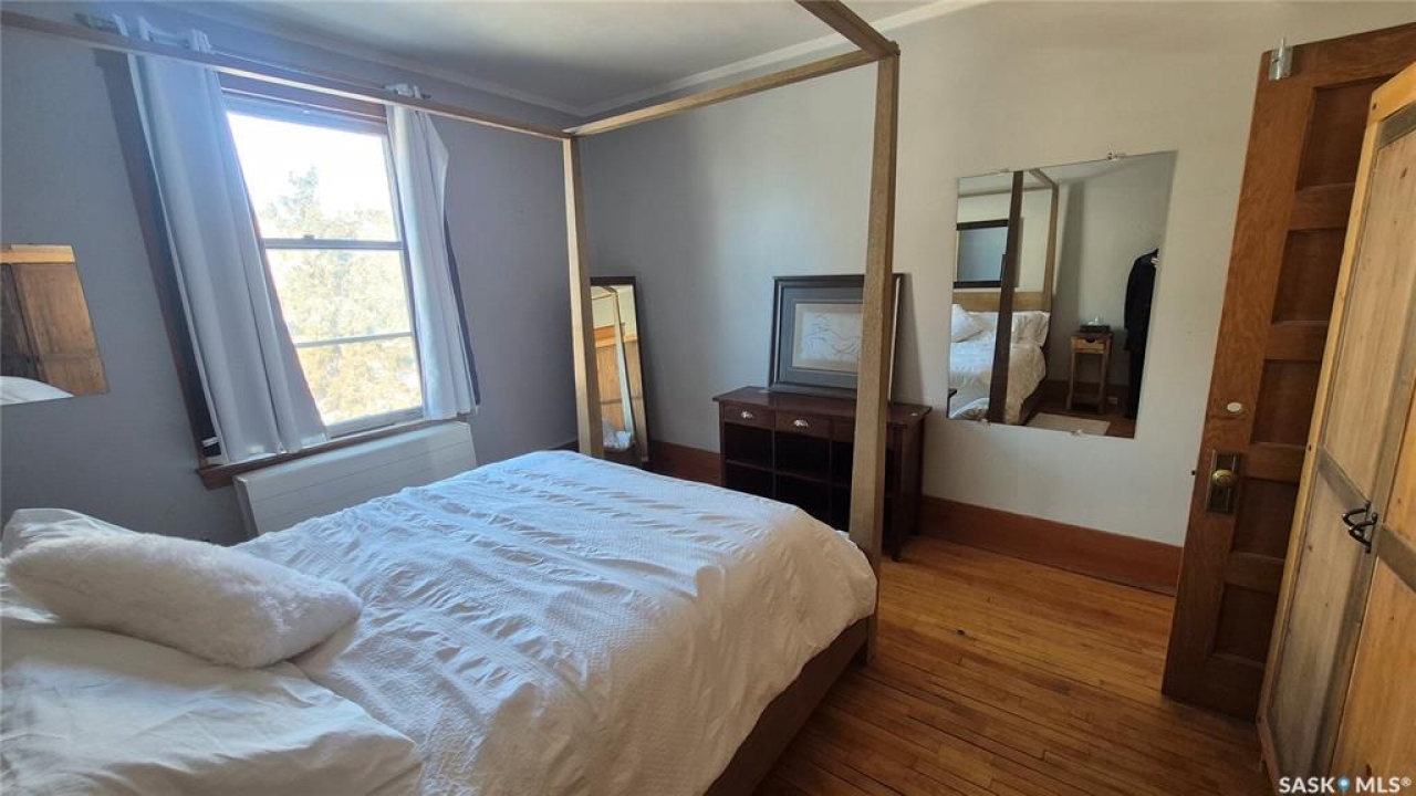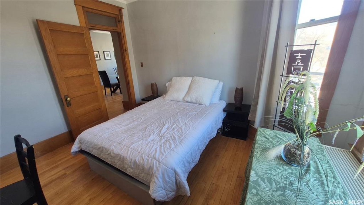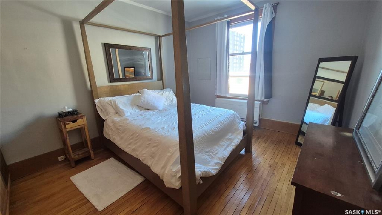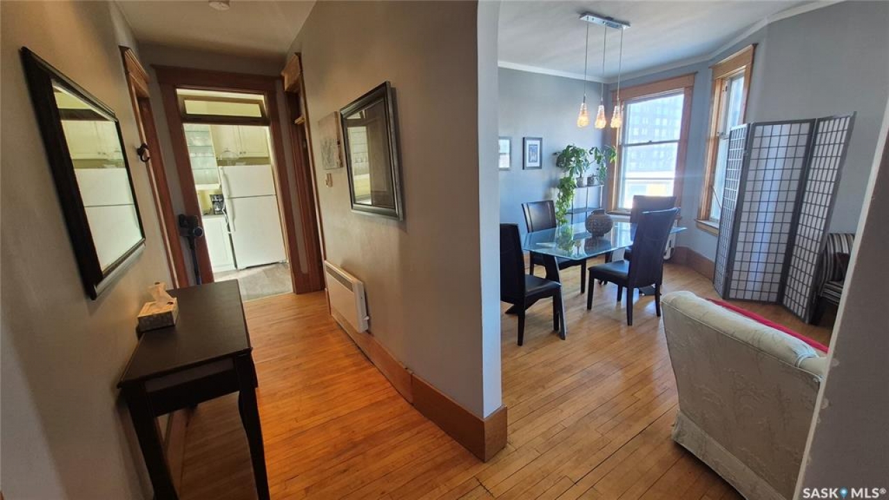 Welcome to this charming top-floor corner-unit condo in the historic Bartleman Building, ideally located in the heart of downtown Regina, just two blocks from beautiful Wascana Park. Offering 889 sq. ft. of living space, this home blends character, comfort, and convenience in a truly walkable location. Step inside to a bright, open-concept living and dining area where extra windows of the corner unit flood the space with natural light, highlighting the home's high ceilings and timeless architectural details, including original trim, tall baseboards, and classic doors. Hardwood flooring and a decorative fireplace add warmth and charm, creating an inviting space to relax or entertain. An elegant archway leads to the kitchen. The bright white kitchen provides ample counter space and comes complete with a fridge, stove, built-in dishwasher, and durable vinyl flooring. A garden door extends your living space outdoors to a private patio, the perfect place to enjoy morning coffee or unwind after a long day. The spacious primary bedroom easily accommodates a king-sized bed and is located next to the 4-piece bathroom, which features vinyl flooring, a tiled tub/shower combination, and additional storage. The large second bedroom includes hardwood flooring and a walk-in closet, making it ideal for guests, a home office, or additional living space. Additional highlights include one dedicated parking stall, ample street parking for visitors, and extra storage in the basement. What truly sets this condo apart is the lifestyle it offers. Downtown professionals will appreciate being able to walk to work, enjoy nearby cafés and restaurants, or spend time outdoors at Wascana Park. Local favourites such as Tangerine, Fireside Bistro, Niche Yoga & Therapy, Leo's OG, the Royal Saskatchewan Museum, and the shops along 13th Avenue are all just minutes away on foot. This is a rare opportunity to own a character-filled condo that's looking for the next perfect owner to call it home!