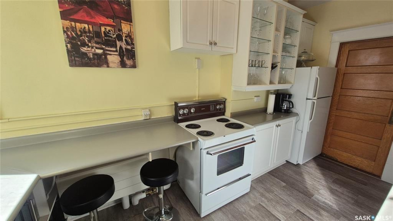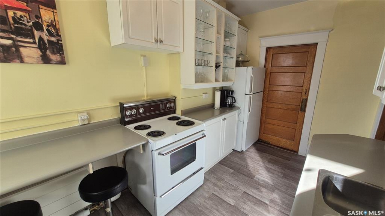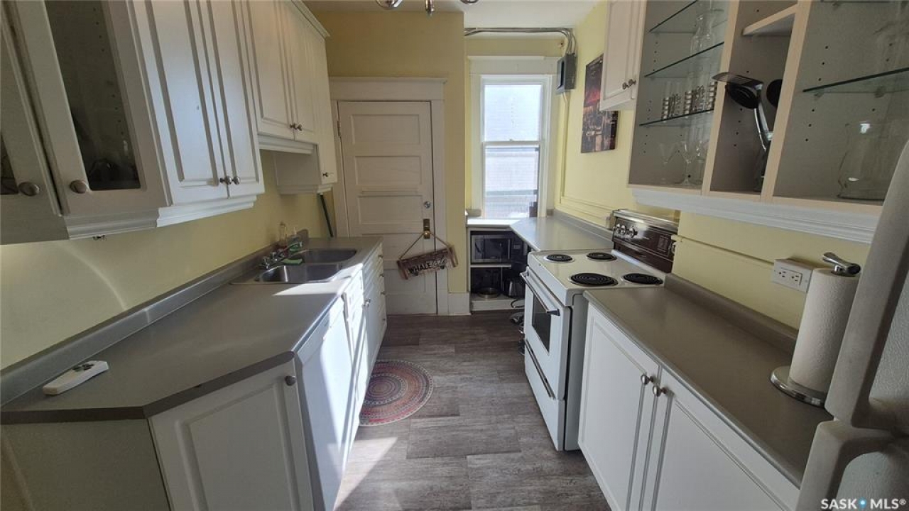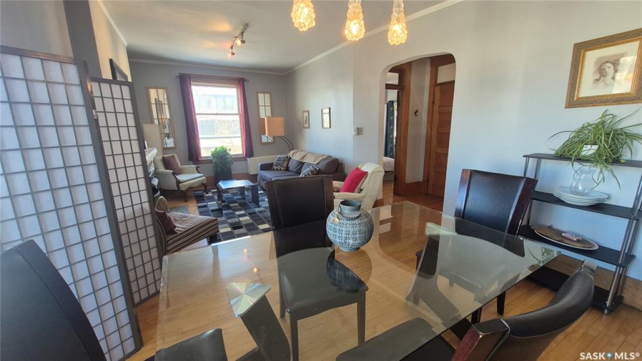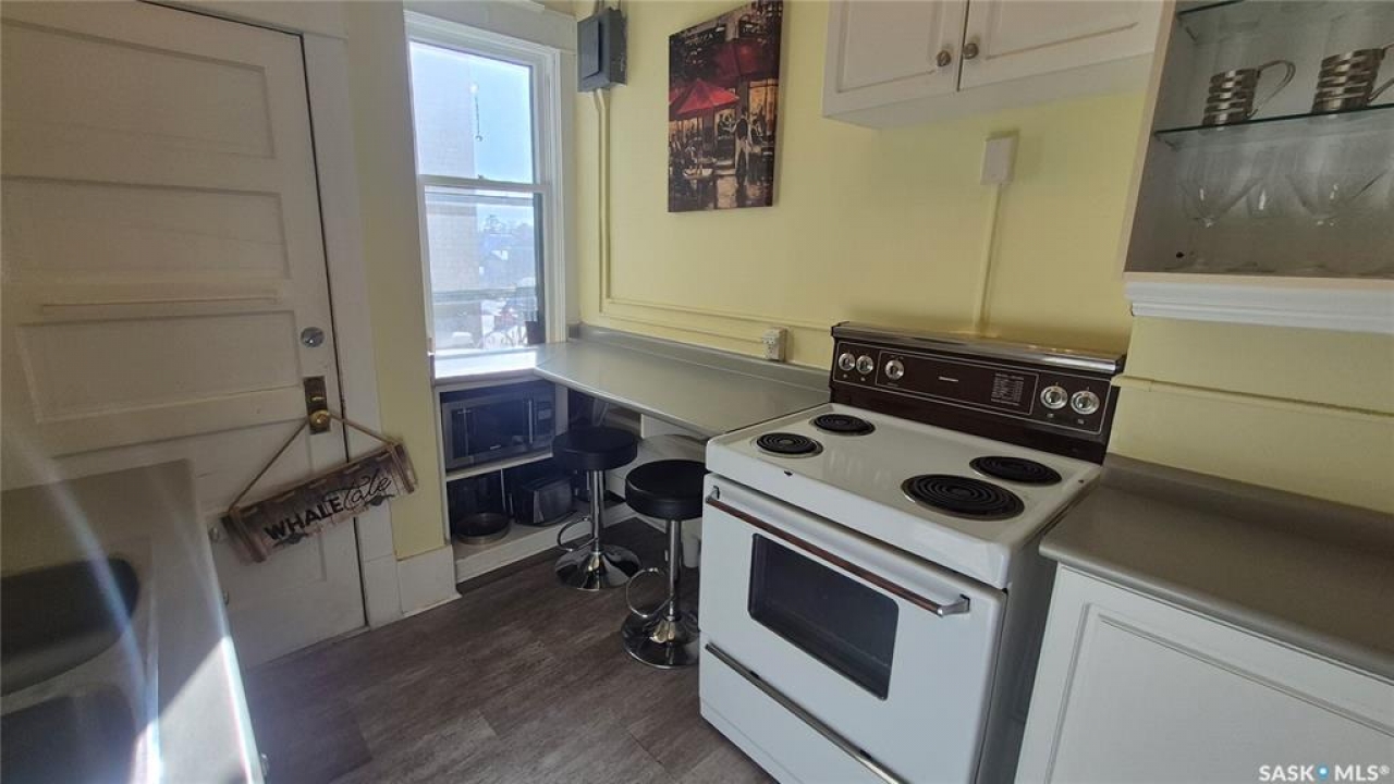 Welcome to this charming top-floor corner-unit condo in the historic Bartleman Building, ideally located in the heart of downtown Regina, just two blocks from beautiful Wascana Park. Offering 889 sq. ft. of living space, this home blends character, comfort, and convenience in a truly walkable location. Step inside to a bright, open-concept living and dining area where extra windows of the corner unit flood the space with natural light, highlighting the home's high ceilings and timeless architectural details, including original trim, tall baseboards, and classic doors. Hardwood flooring and a decorative fireplace add warmth and charm, creating an inviting space to relax or entertain. An elegant archway leads to the kitchen. The bright white kitchen provides ample counter space and comes complete with a fridge, stove, built-in dishwasher, and durable vinyl flooring. A garden door extends your living space outdoors to a private patio, the perfect place to enjoy morning coffee or unwind after a long day. The spacious primary bedroom easily accommodates a king-sized bed and is located next to the 4-piece bathroom, which features vinyl flooring, a tiled tub/shower combination, and additional storage. The large second bedroom includes hardwood flooring and a walk-in closet, making it ideal for guests, a home office, or additional living space. Additional highlights include one dedicated parking stall, ample street parking for visitors, and extra storage in the basement. What truly sets this condo apart is the lifestyle it offers. Downtown professionals will appreciate being able to walk to work, enjoy nearby cafés and restaurants, or spend time outdoors at Wascana Park. Local favourites such as Tangerine, Fireside Bistro, Niche Yoga & Therapy, Leo's OG, the Royal Saskatchewan Museum, and the shops along 13th Avenue are all just minutes away on foot. This is a rare opportunity to own a character-filled condo that's looking for the next perfect owner to call it home!