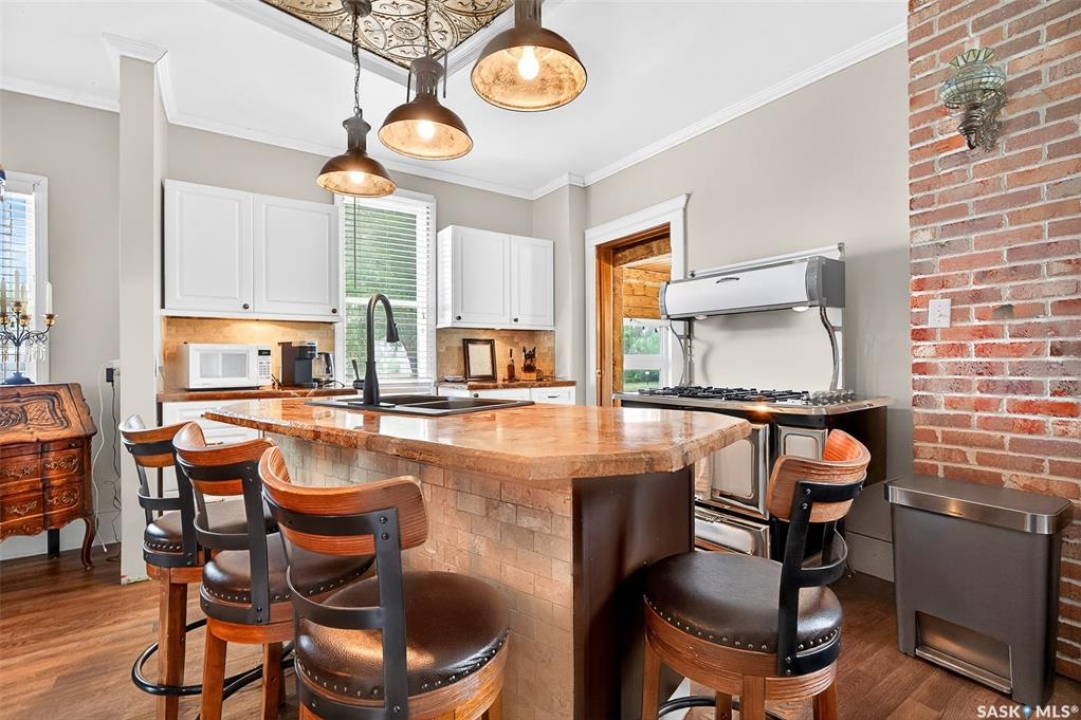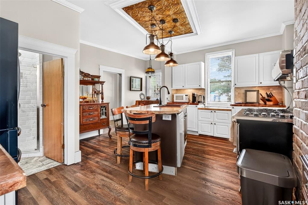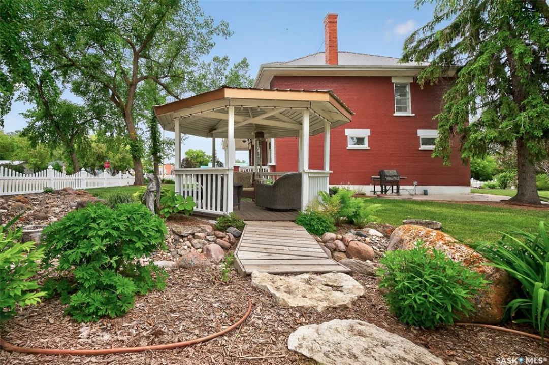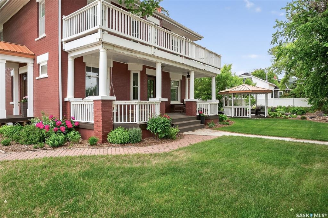 Looking for a once in a lifetime opportunity to own one of the most stunning character homes around? You won't want to miss this one! This 3 storey double brick home boasts 2,600 sq.ft. of living space on 3 floors with 3 bedrooms and 2 bathrooms. Sitting on 4 large corner lots with the most beautiful landscaping around. This iconic home stands out as soon as you see it with its excellent curb appeal. This yard features a vinyl fence, stunning gazebo, custom riverbed, stunning rock gardens, beautiful flowers and a stamped concrete pad with a rock fireplace. The home features a huge covered veranda which welcomes you into a beautiful foyer. Leading into a huge open living / dining room complete with a wood fireplace and beautiful hardwood floors. On the other side of the front door we find an office and second entrance - you are sure to love the real brick flooring. At the back of the home we have a huge kitchen which is sure to impress! Complete with a stunning custom gas stove that matches the era and a beautiful island that ties it all together. Off the kitchen we find one of the cutest sunrooms you can find - you will spend many hours here. Heading upstairs we find a huge second floor balcony with 3 large bedrooms! The primary bedroom features a seating area and a large walk-in closet. There is laundry on the second floor for added convenience. The absolutely stunning 4 piece bathroom will blow you away! From the clawfoot soaker tub to the copper sink or stunning vanity it will impress you. Heading up to the third floor we have a large loft space finished in pine that could be used as a 4th bedroom, playroom or yoga loft! The basement features a large family room, workshop, and lots of storage! If you are looking for a different pace of life Mortlach is an excellent little town. Located just 30 minutes west of Moose Jaw and boasting a K-12 school! There is so much more to see - book your walkthrough today!