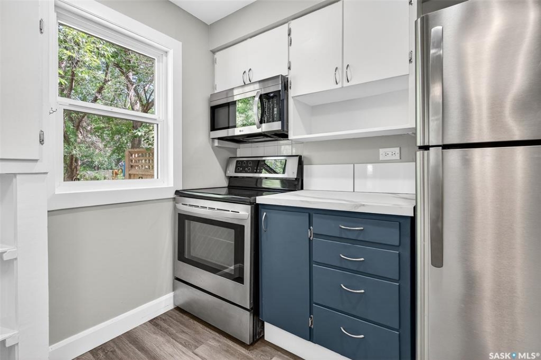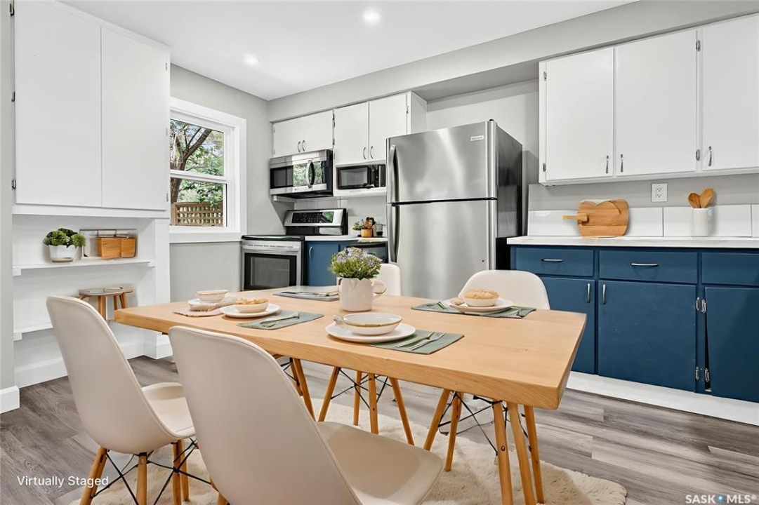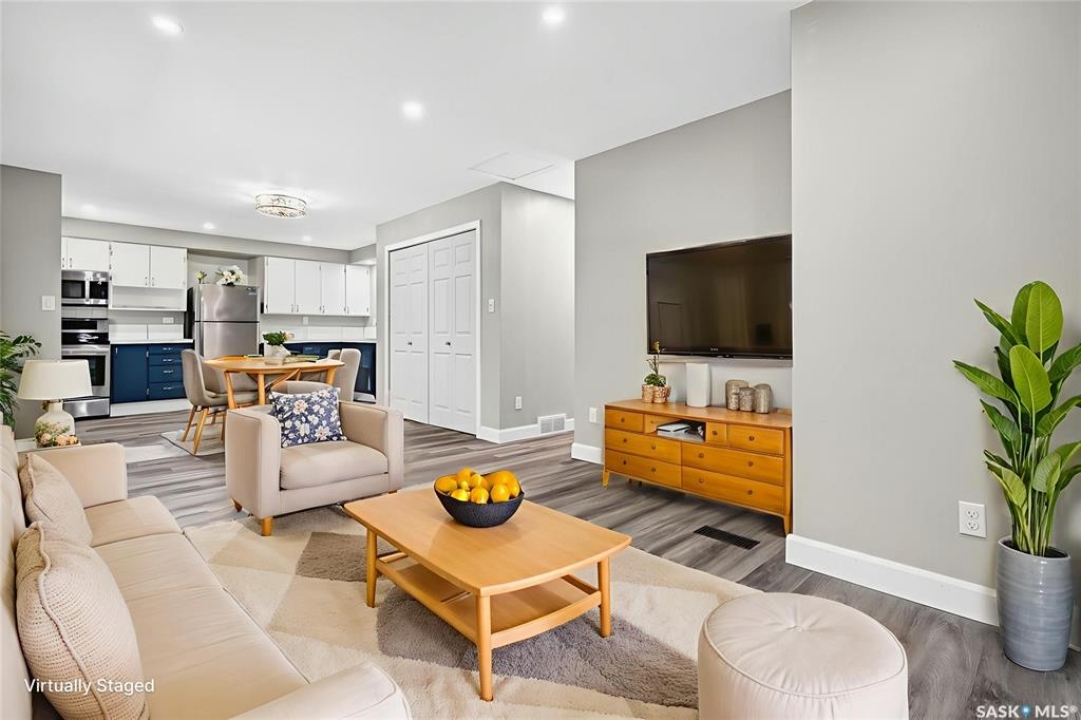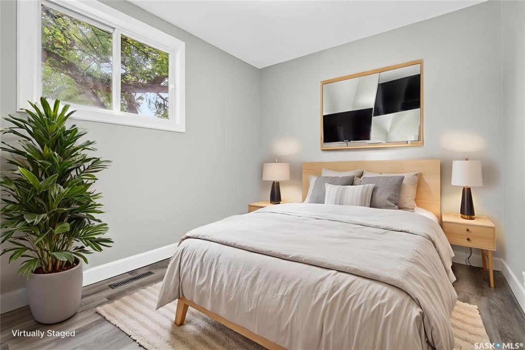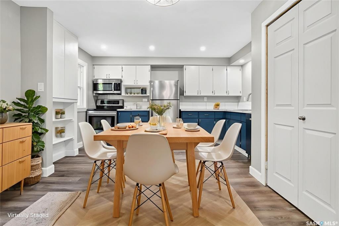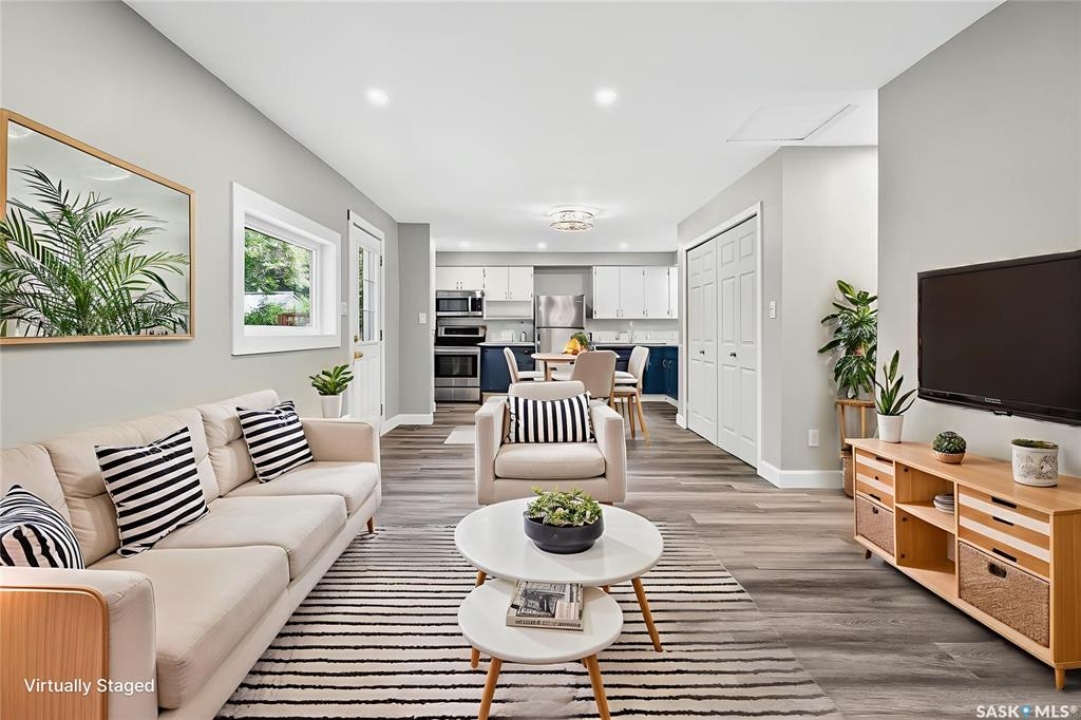 Are you looking for an updated starter home? This super cute 2 bed and 1 bath boasts just over 700 sq.ft. has just been extensively renovated. Excellent curb appeal as you pull up with one of the cutest decks! Situated on a beautifully treed corner lot! Heading in the back door you are greeted by an open concept living area with a living space to one side and kitchen on the other leaving space for a dining room in the middle. The kitchen boasts 2 tone cabinets, lots of counter space and a stainless steel appliance package. Down the hall we find 2 bedrooms as well as a stunning 4 piece bath and main floor laundry! So much work has just been done to this home - all that is left is too move in and enjoy it! Outside we have a 14'x22' garage complete with a new door and opener. You are sure to love the shade from all of the trees on your back deck or patio! So many updates just done - new appliances, new furnace, hot water tank, new bathroom, new drywall, updated electrical and plumbing, new flooring and paint throughout! If you are looking for easy and affordable living this could be the home for you! Reach out today to book your showing!