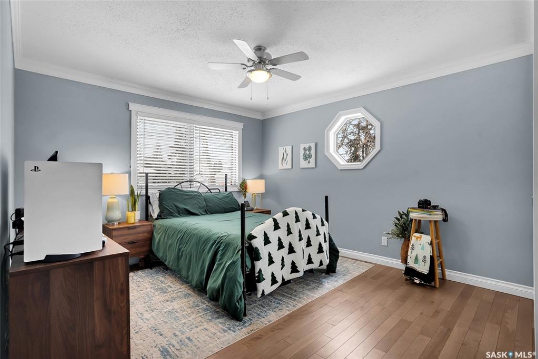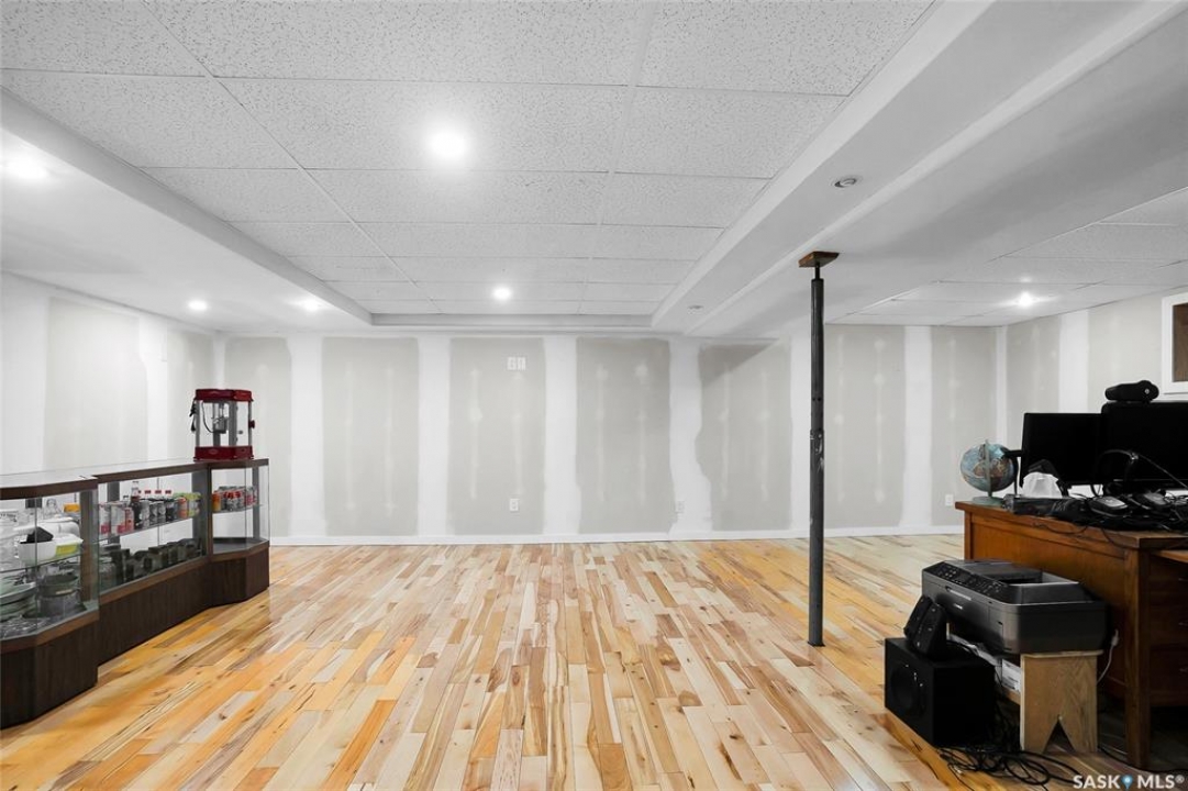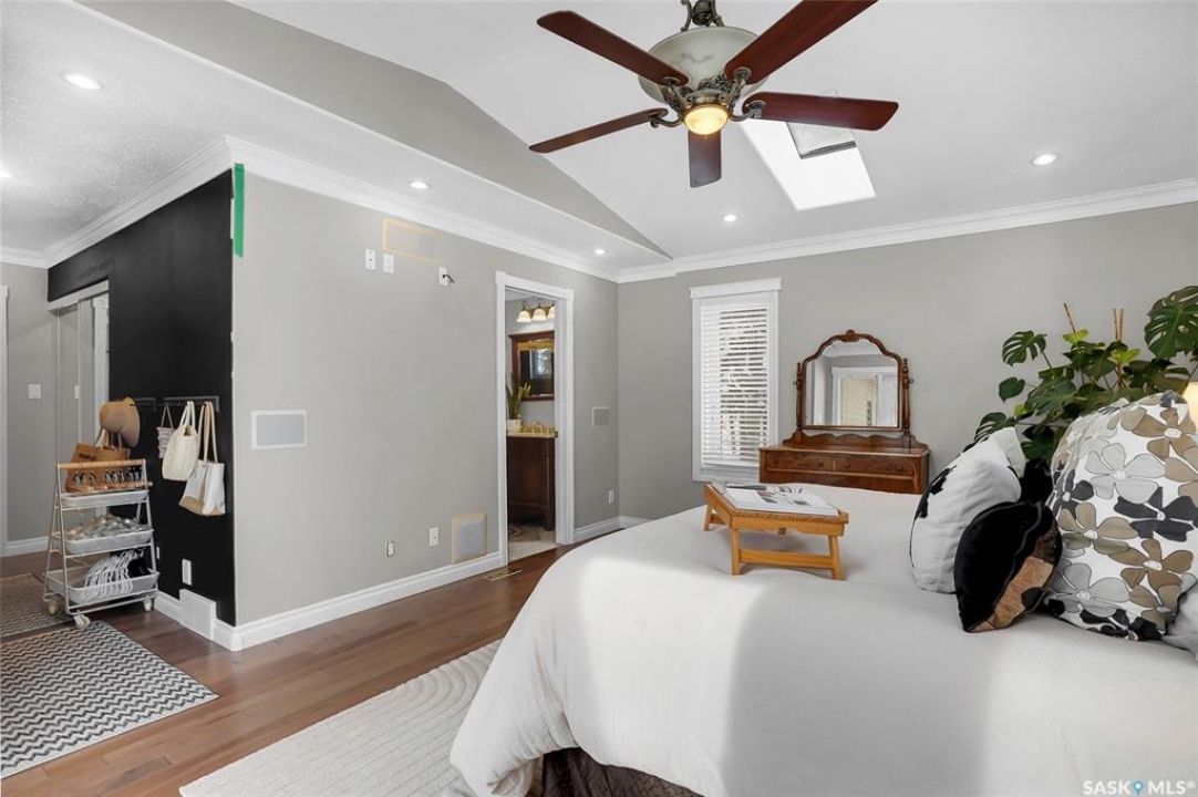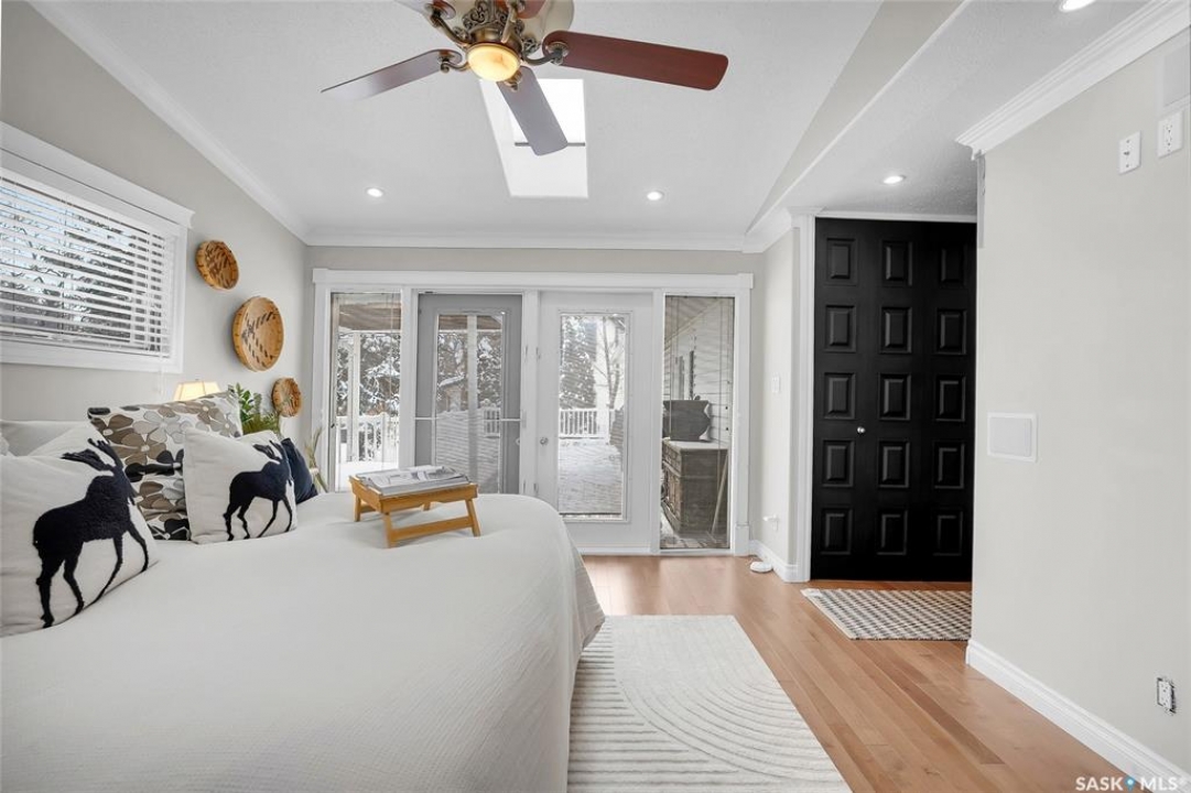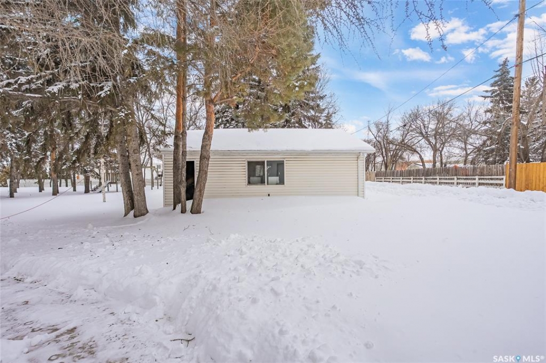 Welcome to 111 Norman Avenue in Aberdeen, where you get full on acreage energy without leaving town! Sitting on four lots wrapped in mature trees and privacy, this property feels like you're living at the lake, yet you're just minutes to Highway 11 for an easy commute to Warman, Saskatoon, or a quick escape north to Lakeland. This thoroughly updated bungalow brings the vibe with hardwood throughout the main floor, a bright modern 4-piece bath with updated plumbing (2025), and a primary bedroom that honestly feels like a boutique retreat — vaulted ceilings, skylight, built-in speakers, patio doors (replaced 2015) leading to the deck, plus a dreamy ensuite with soaker tub and your own dry sauna. The oversized living room (converted from the original attached garage) gives you that open, flexible space perfect for hosting, creating, or just spreading out, while the basement is wired for a projector so movie nights hit different. Major upgrades bring peace of mind: shingles redone in 2024, sewer line replaced from the town to the house (cost shared between seller and town), attic insulation topped up in 2022, plumbing updated in the kitchen in 2025, furnace tuned up with parts replaced in 2025, and appliances replaced in 2014 (fridge updated in 2016). With central air and thoughtful improvements throughout, this home is truly move-in ready….but the real flex? Two detached garages (single and double), with 220 power in the single garage, two driveways, nine off-street parking spots, RV parking, and endless room for hobbies, side hustles, car builds, boats, trailers, and all the toys. The massive back deck and private yard make everyday life feel like a weekend getaway. If you've been craving space, freedom, and a slower pace without sacrificing connection, this is that rare small-town lifestyle upgrade that just makes sense.