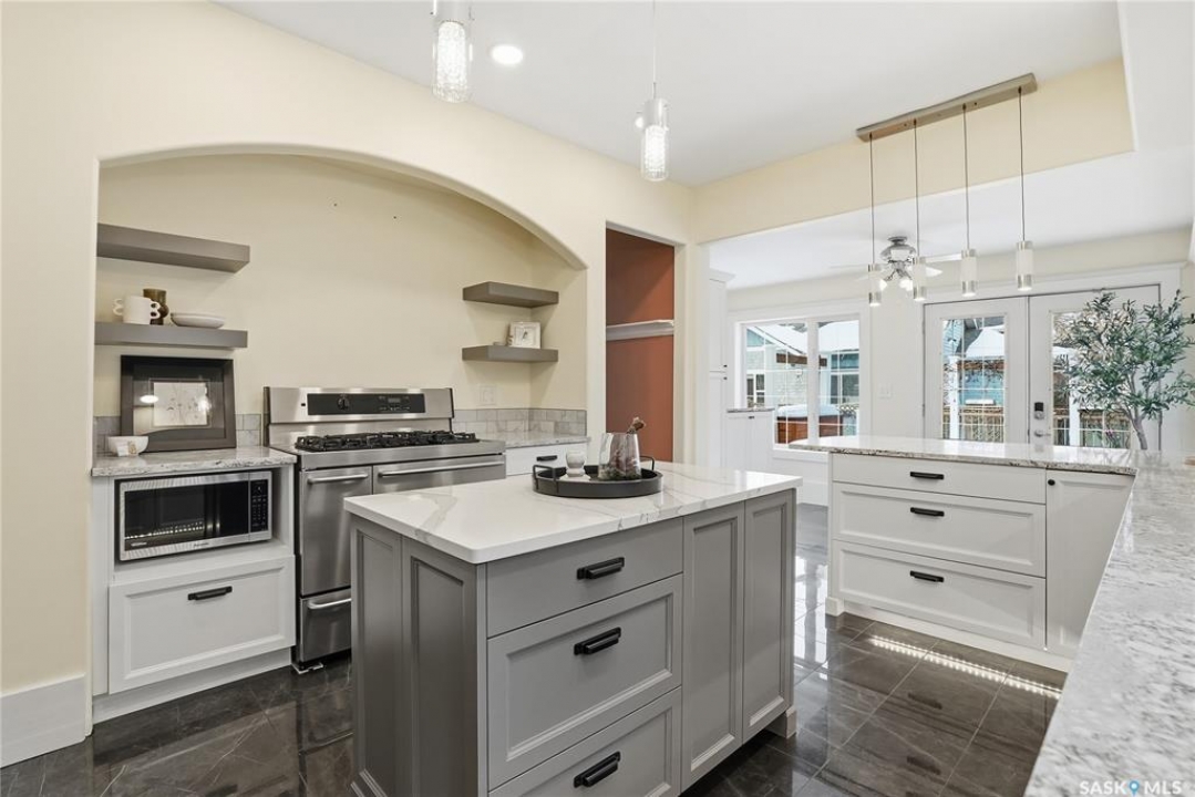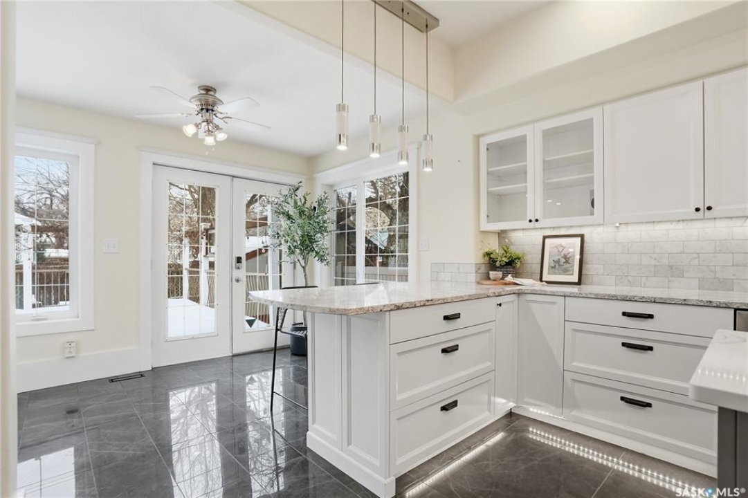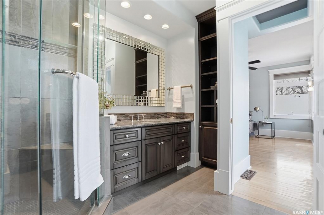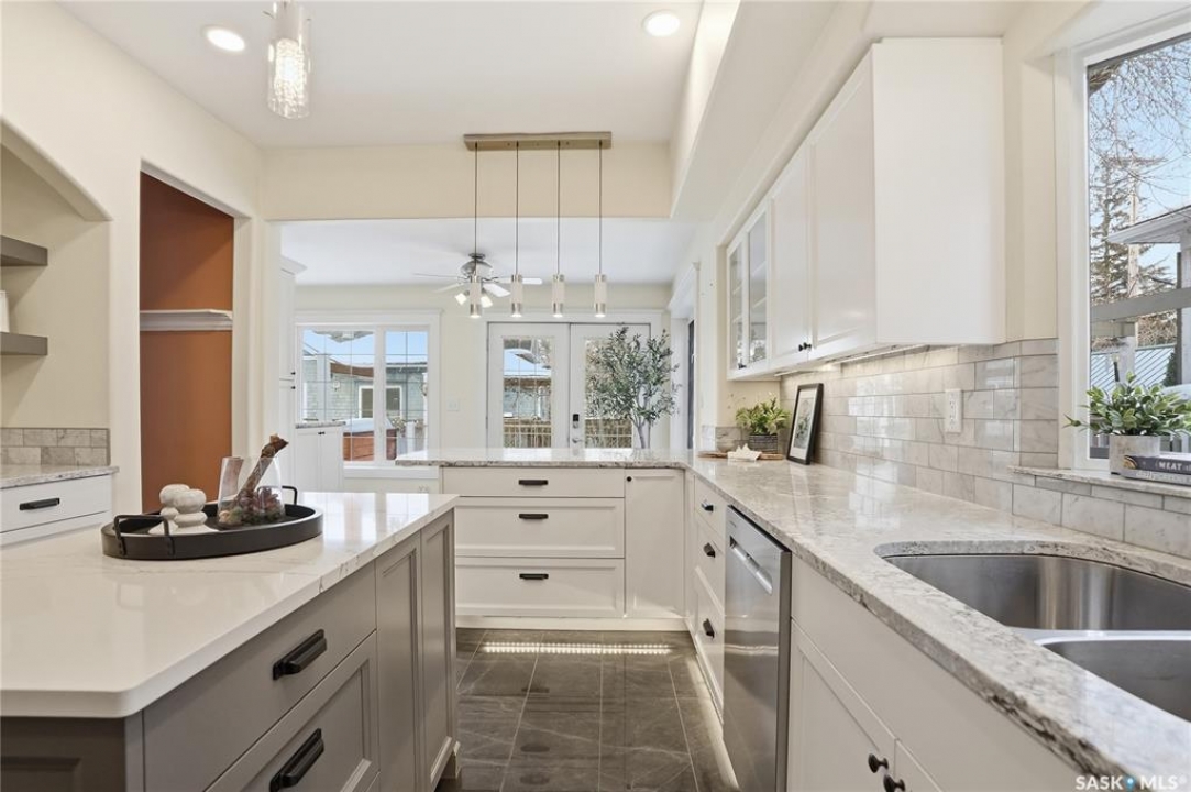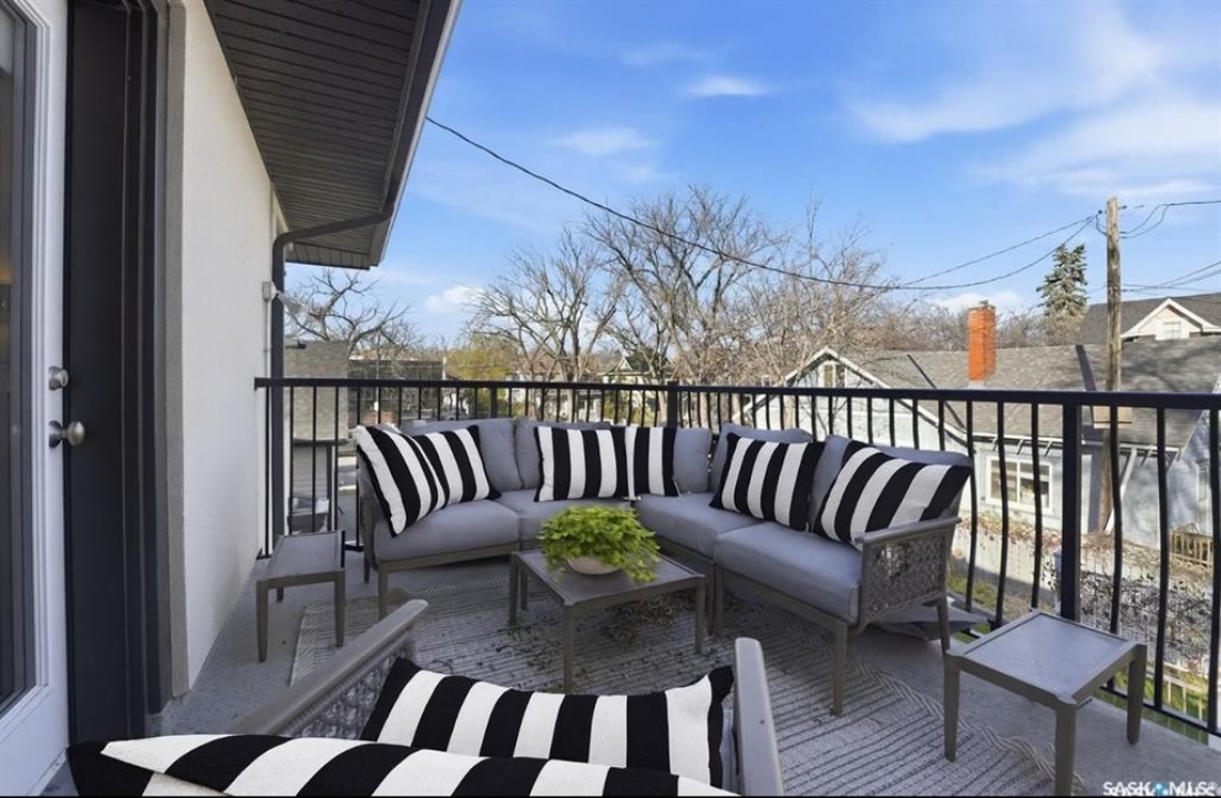 Don't miss this INCREDIBLE character home in one of Saskatoon's most desirable neighbourhoods! A stately family home with a fully developed basement with separate entry. This property exudes pride of ownership with charm and professional updates throughout. Enter into the main floor to find a welcoming sunroom and foyer, living room with wood burning fireplace, and a formal dining with a bay window. At the heart of the home is a chef's DREAM KITCHEN- spacious and beautifully appointed with quartz countertops, stainless appliances, and a sit-up eating area that opens onto a sitting room, overlooking a large deck and private yard. A 2-pc bath completes the main. Upstairs, you'll find 3 bedrooms: a primary suite with an ensuite and a charming private deck of the master. Two additional lrg bedrooms and a newly renovated 3-piece bathroom complete 2nd flr. Large windows flood every room with natural light, highlighting the significant character. Extensive renovations and upgrades have been meticulously completed recently, blending heritage with modern class. The unique dev basement offers a modern living room, lounge and 1 bed layout with a sep entrance, 4-pc bath, 2x laundry, kitchenette, and a family room w/ gas fireplace — ideal for additional cash flow. The oversized, heated att garage includes a large attic storage area above. The front yard is low maintenance with a stamped concrete driveway providing parking 3 vehicles. The private backyard will impress w/manicured grounds: a two-tiered deck, garden boxes, artificial turf, curbing, and climbing vines. In total, there are three decks, including a covered front deck and the private balcony off the master. Upgrades include: furnace, hot water heater, shingles, garage, decks, kitchen, two bathrooms, basement development, many new windows, updated exterior, and driveway — the list goes on! This gem is ideally situated within walking distance to the river, downtown, U of S, and all hospitals, the location is unbeatable!