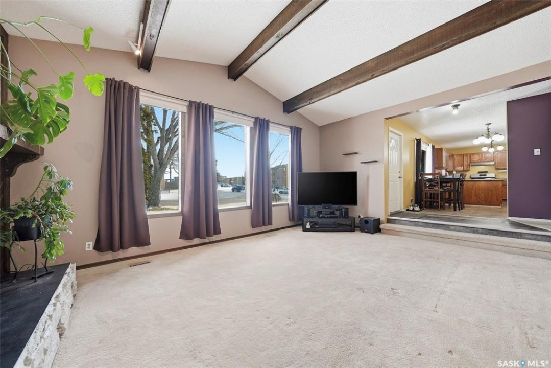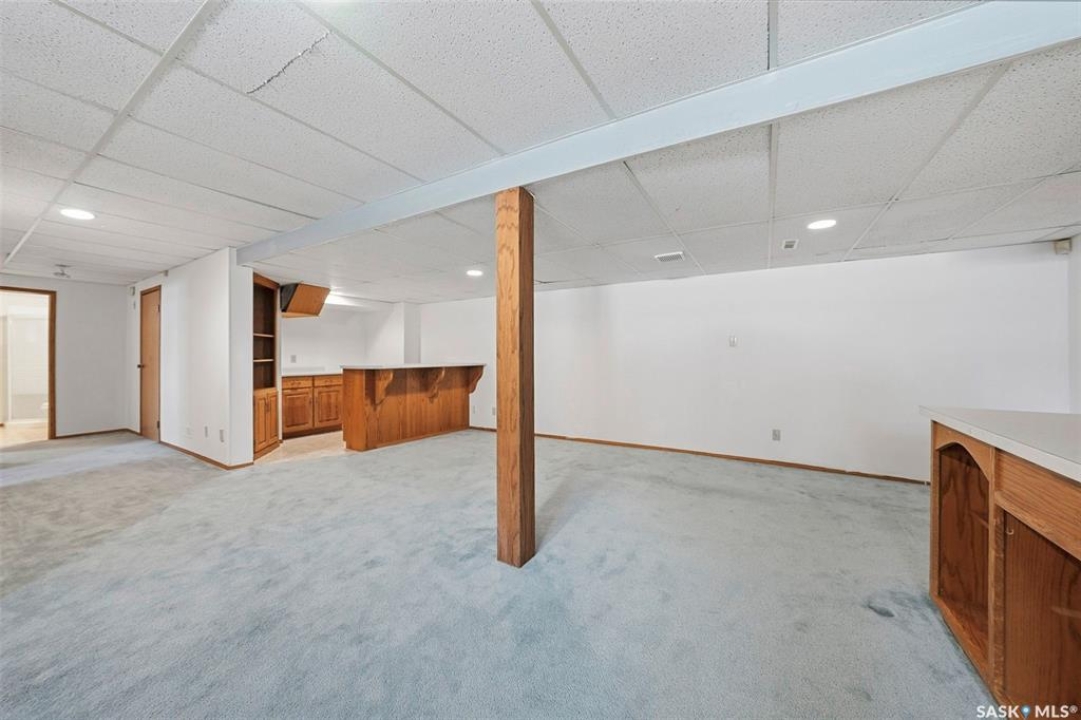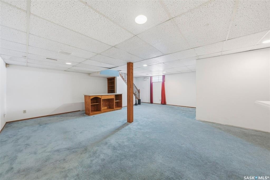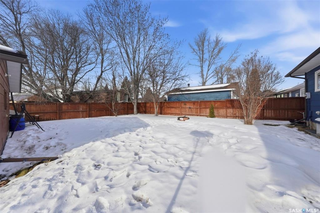 Located in Meadowgreen, Saskatoon, this 1,316 sq. ft. family home sits on a large corner lot and offers a functional layout with plenty of space throughout. The main floor features a sunken living room with vaulted ceilings, large windows for natural light, and a fireplace. There are three bedrooms on this level along with a four-piece bathroom. The kitchen offers good workspace, and the main floor also includes a separate laundry room and coat/storage area. There is ample storage throughout the home with multiple closets and well-planned spaces. The basement is spacious and includes a built-in bar area, additional built-in shelving, two bedrooms, and a large utility/storage room. A covered patio-style front porch provides a nice sitting area overlooking the lawn. The backyard offers additional space with fruit trees, lawn area, and an insulated two car detached garage. Situated in an established Saskatoon neighbourhood, this property offers solid space and layout with room to make it your own.