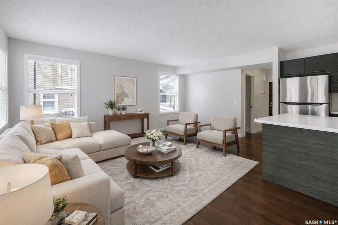 Welcome to 215-410 Ledingham Way! This well cared for 1341 sq foot, end unit, features 3 bedroom and 3 bathrooms. The main floor has hardwood flooring, lots of light (South facing condo with extra windows), a 2 piece bathroom, kitchen with quartz countertops, a functional island, and direct entry to the single attached garage. Upstairs you will be impressed with the large bedrooms. The 4 piece bath features a skylight and entry from both the primary bedroom or hall. The basement is fully developed with a family room and 3 piece bath as well as laundry. Other features include some updated appliances & central air. Close to many amenities. Condo fees include water, common insurance, snow removal, lawn care and reserve fund contribution. Dogs allowed with board approval (some breeds excluded). Staged photos are virtual.