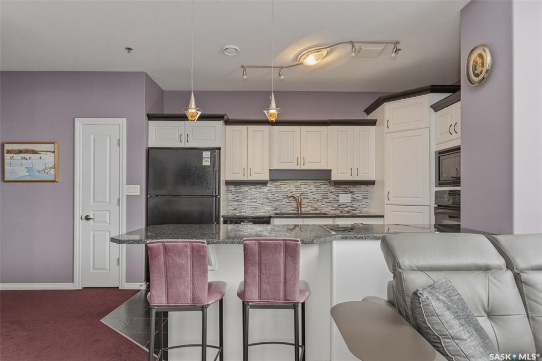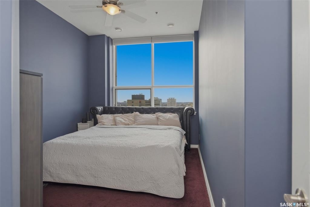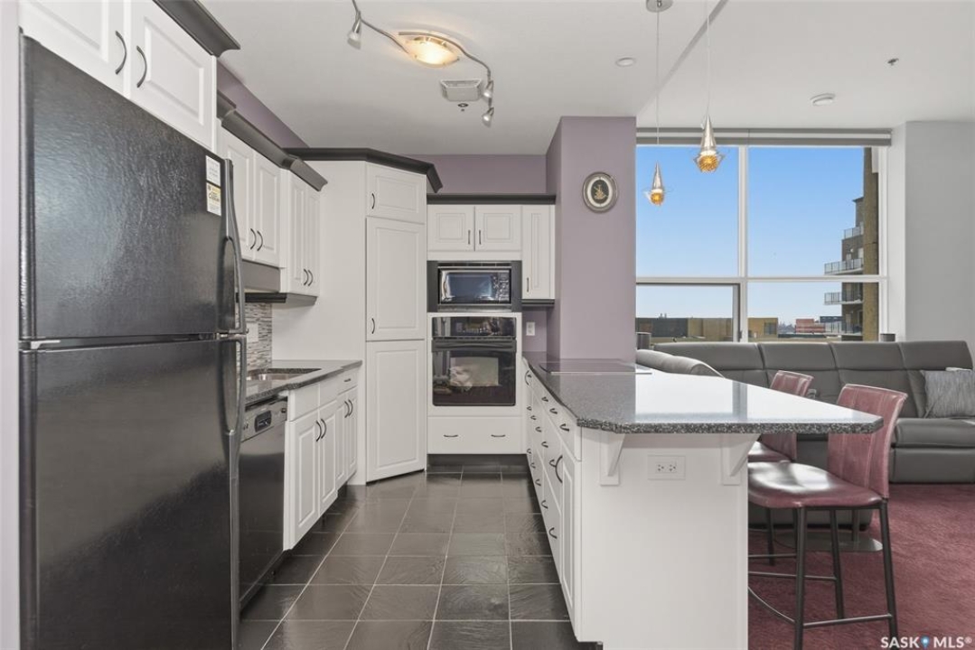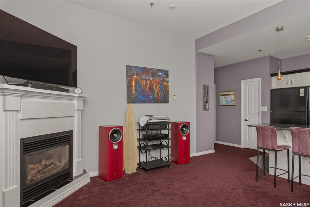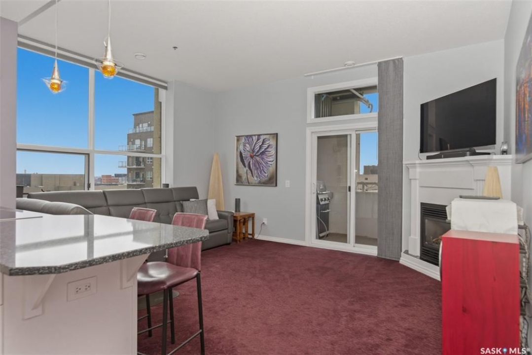 Welcome to this 1,221 sq. ft., 2-bedroom, 2-bathroom condo on the 8th floor of the Motherwell Building. Fully renovated in 2012, this unit features white kitchen cabinets, quartz countertops, tile flooring in the bathrooms, and high-quality burgundy/wine carpets throughout. The home offers 9-foot ceilings in the kitchen and 10-foot ceilings in the living room and both bedrooms, with a south-facing balcony and bedrooms that bring in excellent natural light. A gas fireplace adds comfort to the living area, and additional features include Custom Electric blinds, in-suite laundry, one titled parking stall, and a separate storage space in the basement. This well-kept, move-in-ready condo is steps from Crave, Gulf's Steakhouse, coffee shops, and within walking distance to Wascana Park. Both bedrooms and the Balcony have a great view for Canada day Fireworks every year.