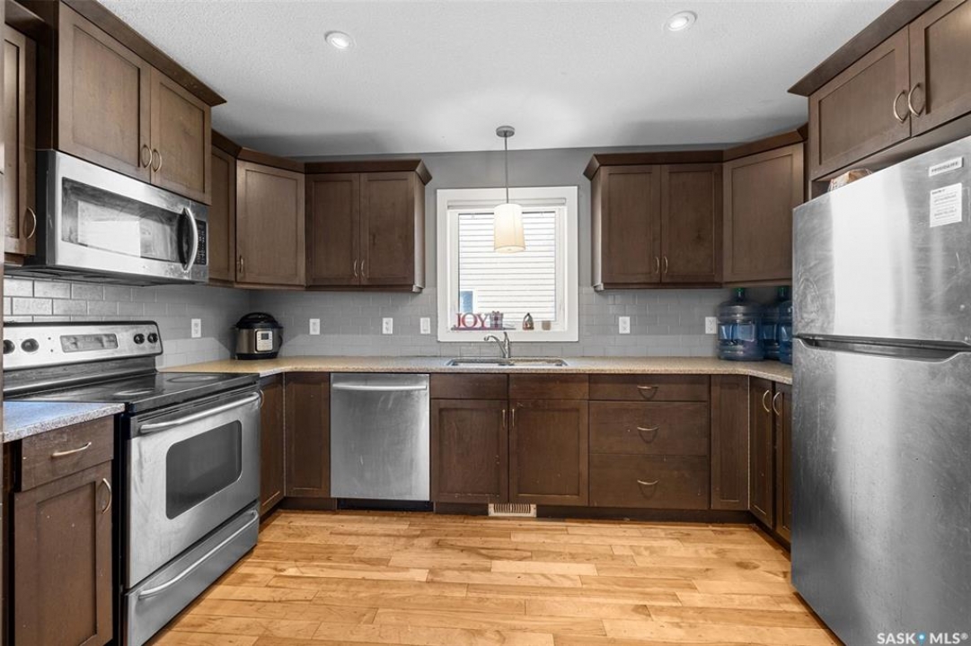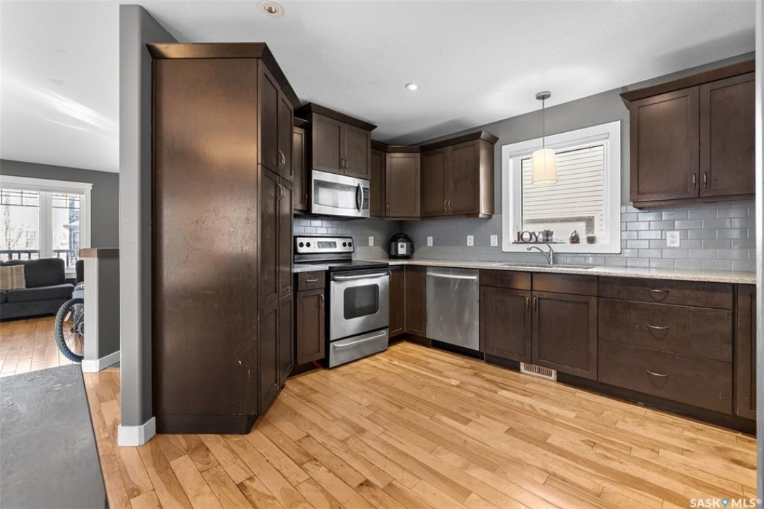 Front porch mornings. Fireplace evenings. Income potential below. Welcome to 5313 Mitchinson Way — a former Trademark Homes show home located in Regina's desirable Harbour Landing. This large 1,227 sq ft raised bungalow immediately impresses with the expansive front porch stretching across the home — the perfect place to enjoy your morning coffee or unwind in the evening. Inside, the open-concept main floor showcases hardwood and tile flooring, quartz countertops, a spacious kitchen with ample cabinetry and pantry space, and a bright dining area ideal for everyday living and entertaining. The living room features a beautiful fireplace with a stained maple mantle, adding warmth and character. The main floor offers three bedrooms, including a primary suite with a walk-in closet, a full bathroom, and the convenience of main-floor laundry. What truly sets this home apart is the fully finished basement. Designed with large windows and thoughtful attention to detail, the lower level feels bright and welcoming — nothing like a typical basement. The suite features a spacious kitchen, open living and dining area, two bedrooms, one with a walk-in closet, a full bathroom, in-floor heating, and its own laundry. Both units have separate utilities and there is a private side entrance, making this an outstanding opportunity for mortgage support or investment income in a market where rental properties are in high demand. Whether you are looking for a family home with added income potential, a first-time buyer opportunity to offset your mortgage, or a turnkey investment property, this home offers exceptional versatility in one of Regina's most popular neighbourhoods. Opportunities like this don't come along often — book your private showing today. All information is deemed reliable but not guaranteed and should be independently verified by the buyer.
