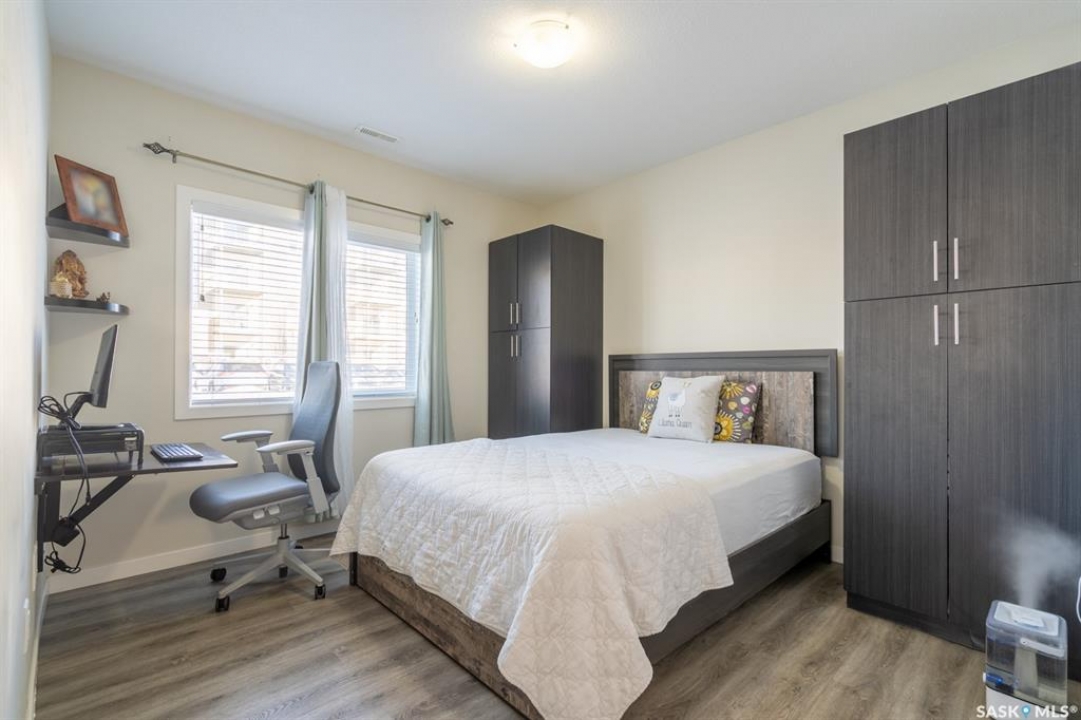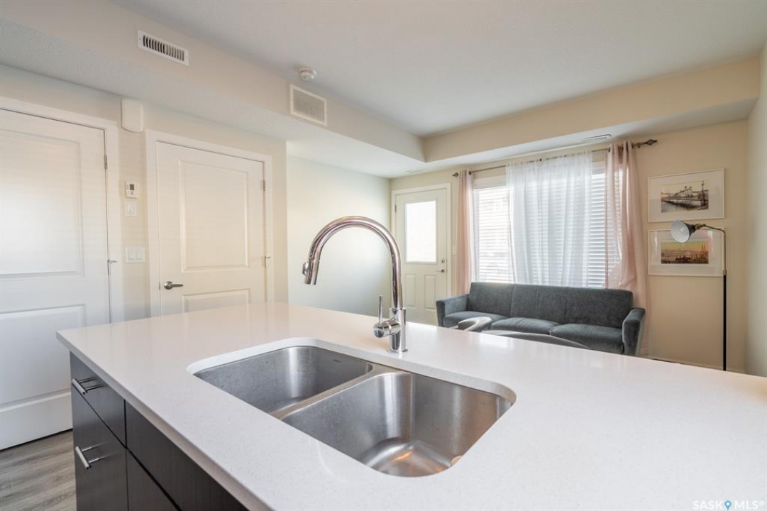 Welcome to this thoughtfully designed studio-style condo, ideally located in a prime location within the complex. Set just off the street, this main level unit offers added privacy, convenient extra parking, and pleasant views of newly built homes across the way—enhancing the peaceful setting. Step inside to a bright and inviting space filled with natural sunlight streaming through the front living room window and door. The open-concept layout seamlessly connects the comfortable living area to a modern kitchen featuring an extended eat-up island, quartz countertops, stylish tile backsplash, stainless steel appliances, and soft-close cabinetry for a refined touch. Durable vinyl plank flooring runs throughout, adding to the contemporary appeal. The thoughtfully designed bedroom area is tucked behind a pocket door for privacy. While it does not offer a window, it includes two built-in closets, easy access to the 4-piece bathroom, and an additional storage closet with in-suite laundry conveniently located nearby. This original-owner unit has been meticulously maintained with no pets and minimal wall hangings, preserving its pristine condition. Upgrades include central air conditioning, an owned alarm system, and tasteful window coverings. The outdoor parking stall is just steps from the front entrance, ensuring everyday convenience. A perfect blend of comfort, style, and affordability—this charming condo is ready to welcome its next owner. Some virtually staged photos are labeled. Don't miss this opportunity!