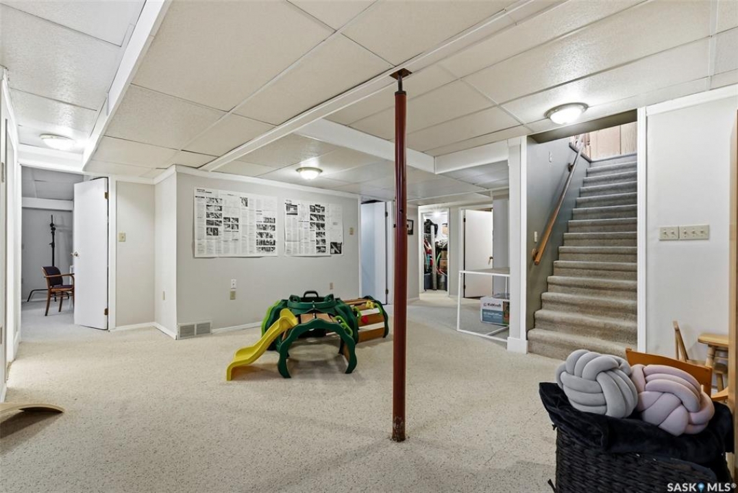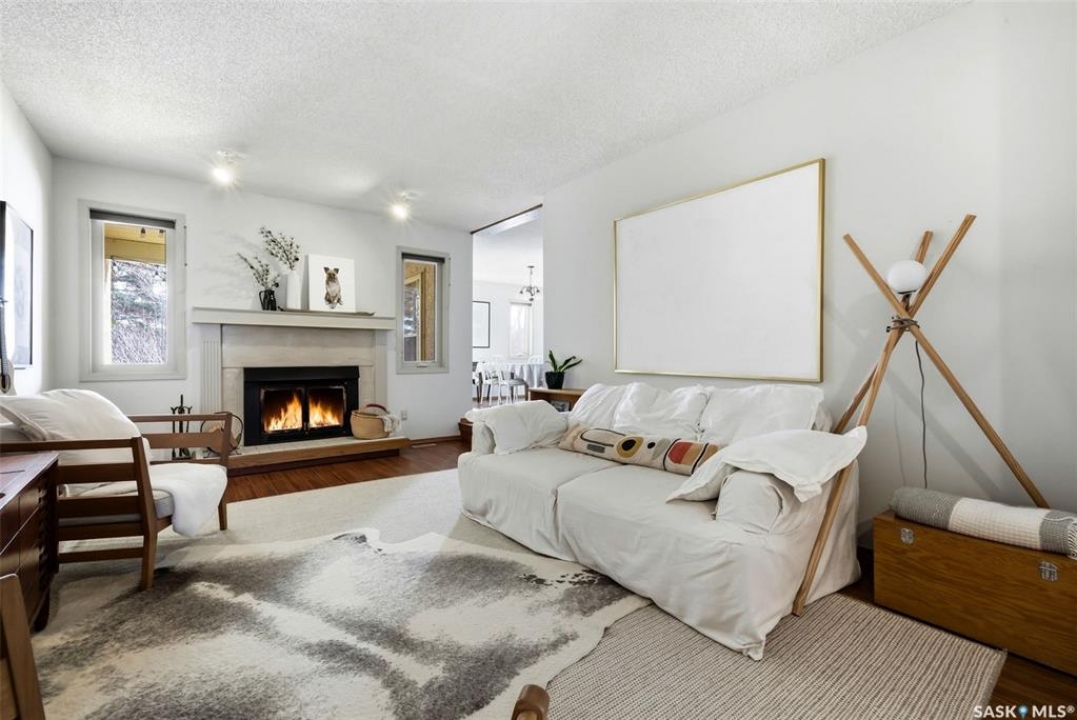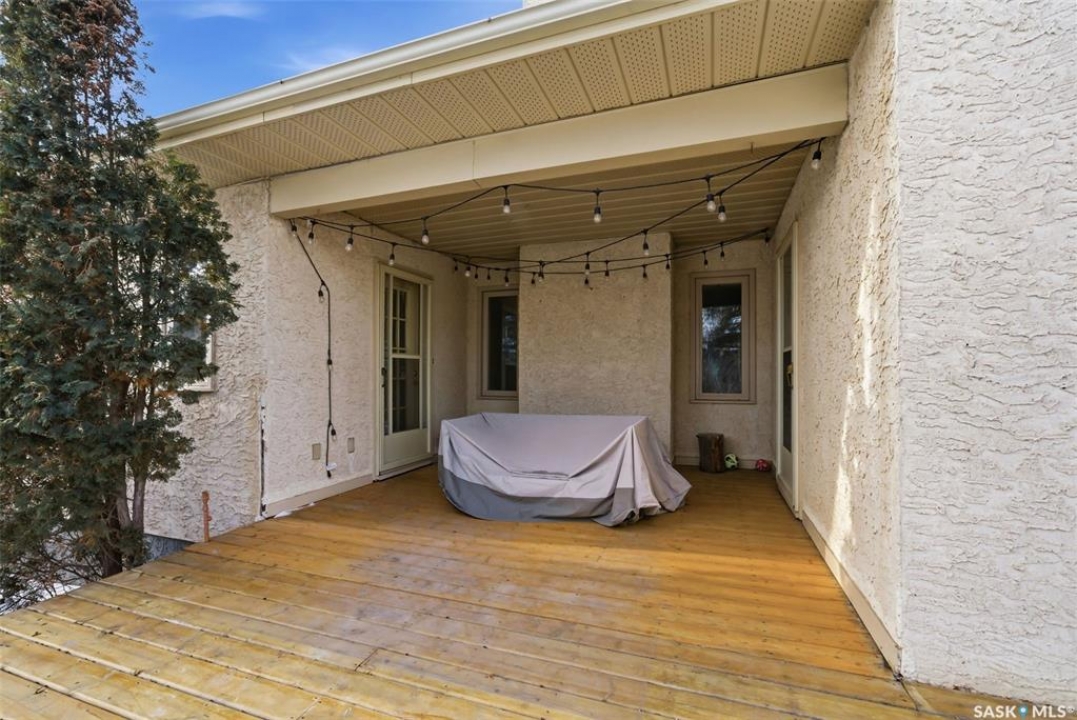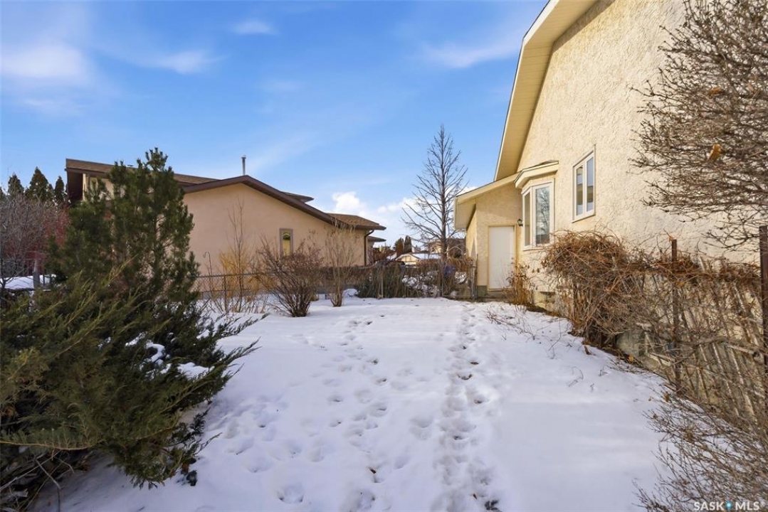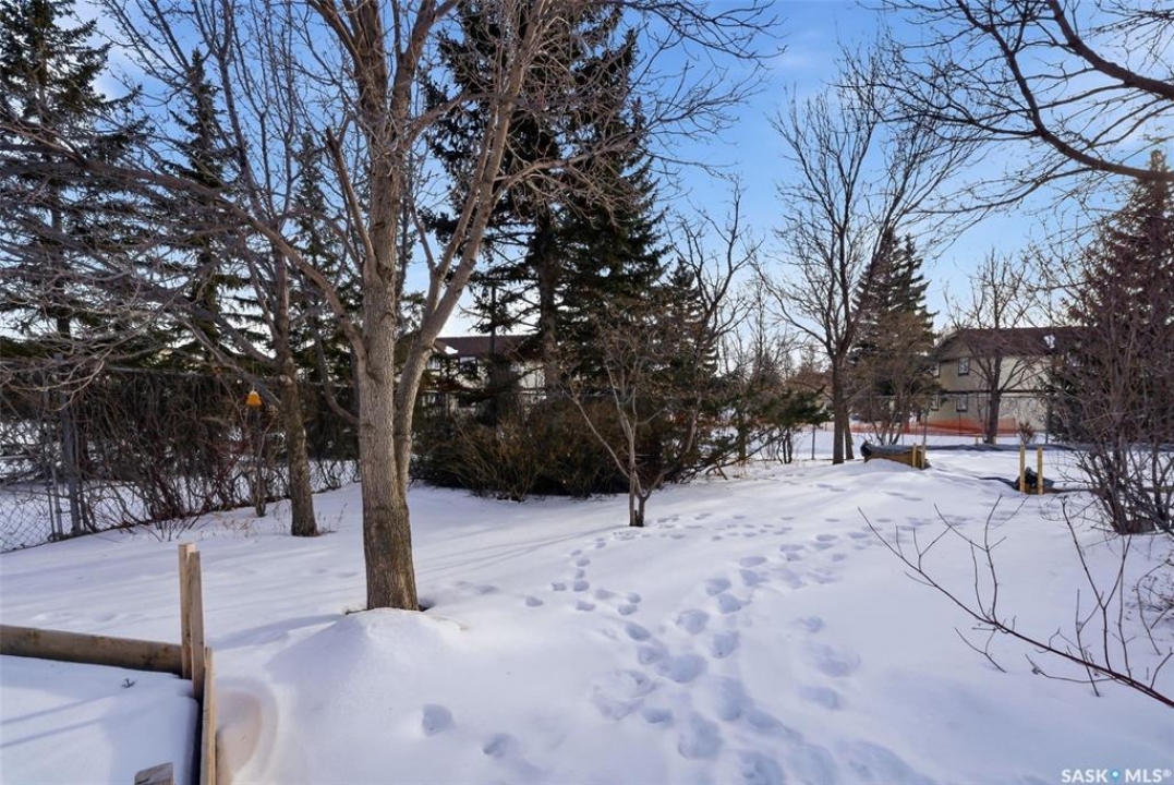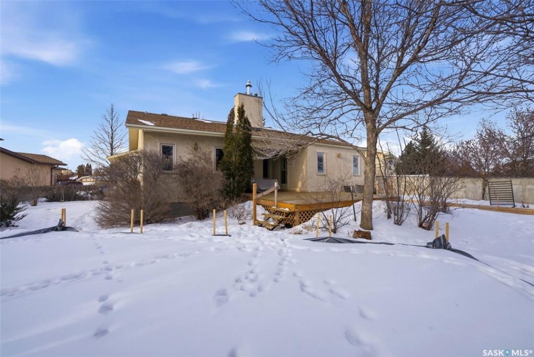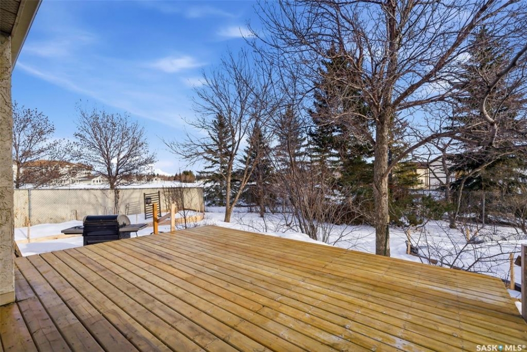 Welcome to 2643 Lacombe Crescent, ideally located in Regina's desirable east end, just steps from green space, walking paths, and within close proximity to W.F. Ready and St. Marguerite Elementary Schools. This spacious, well maintained Gilroy built bungalow offers 5 bedrooms and 3 bathrooms, providing exceptional space for a growing family. The front entry features a large closet, direct access to the double attached insulated and heated garage, and a glass door that allows the foyer to be privately sectioned off. Thoughtfully designed, the main floor separates the bedroom wing from the entertaining areas, creating a functional and family friendly layout. The sunken living room showcases updated laminate flooring and a cozy wood burning fireplace, while the bright formal dining room offers direct access to the backyard deck. The kitchen provides ample cabinetry and counter space along with a comfortable informal eating area. Convenient main floor laundry is located in the rear hallway next to a second entrance to the garage. On the opposite end of the home, the primary suite features a walk in closet, 3 piece ensuite, and private access to the deck. Two additional well sized bedrooms and a full main bathroom complete the main level. The fully developed basement is exceptionally spacious, offering a large family room, two additional bedrooms, a 3 piece bathroom, utility room, and abundant storage space. Step outside to enjoy the partially covered deck with two gas BBQ hookups, overlooking a beautifully landscaped, park like yard filled with mature trees, shrubs, perennials, a garden area, and gazebo that all back directly onto green space for added privacy and tranquility. Built on piles, numerous updates including larger ticket items such as windows (2010), 35-year shingles (2014), flooring (2010), high-efficiency furnace (2025), and central air conditioning. Situated in a quiet neighbourhood, this meticulously cared for bungalow is truly a pleasure to show.