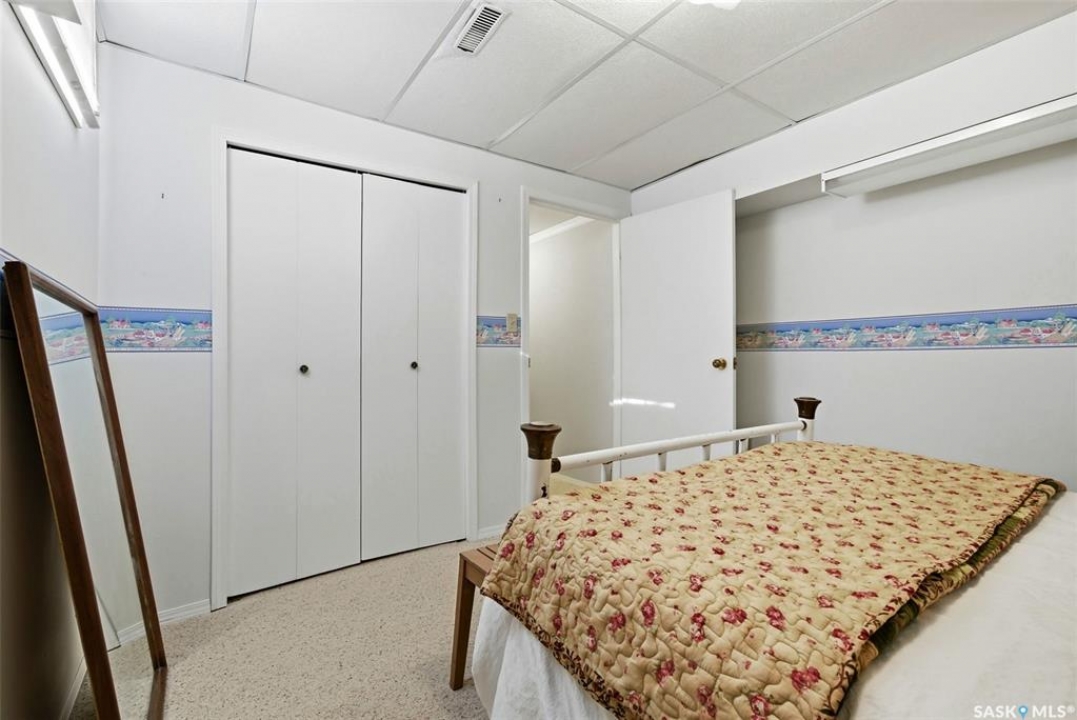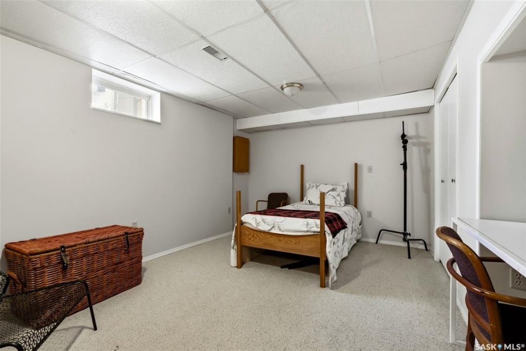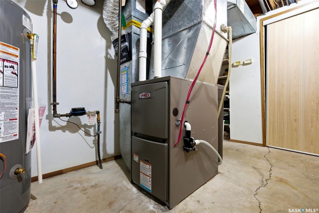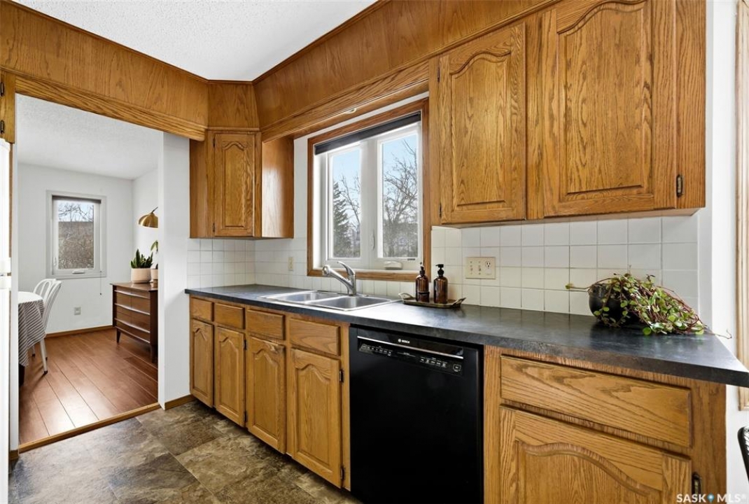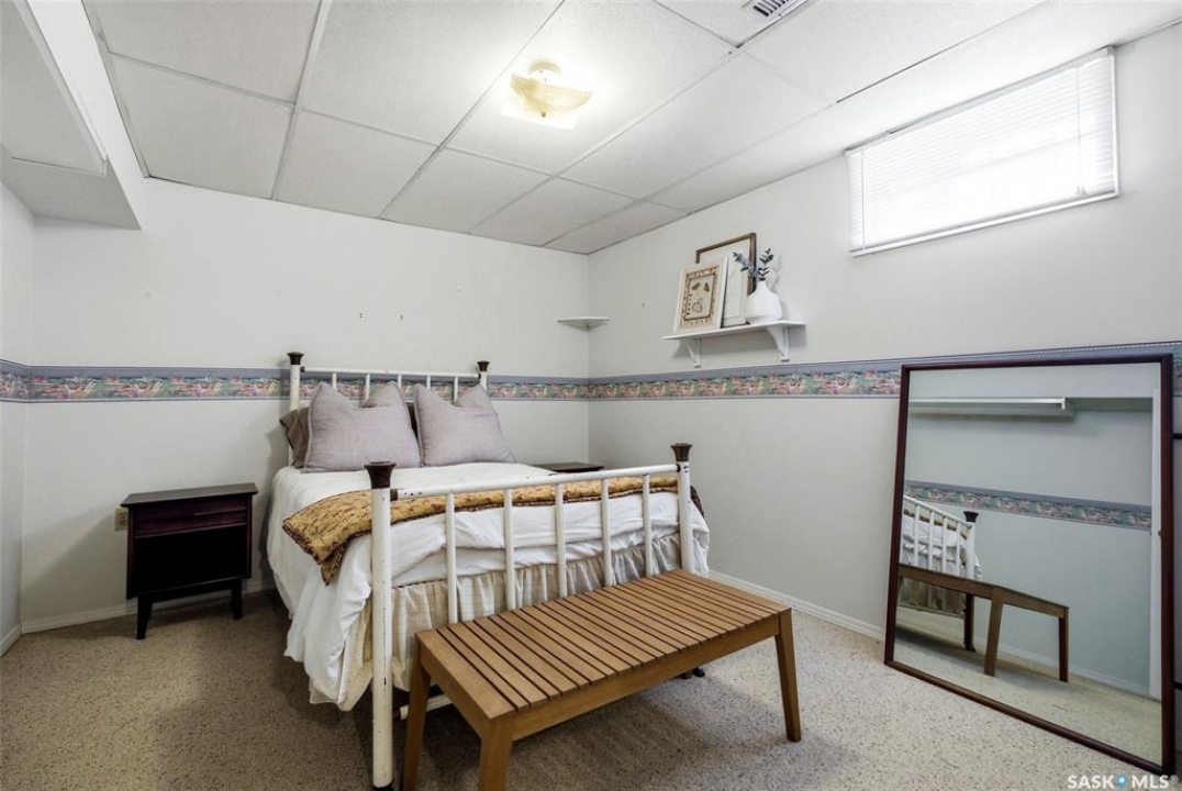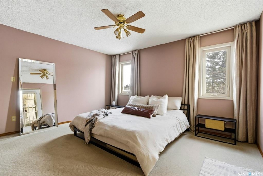 Welcome to 2643 Lacombe Crescent, ideally located in Regina's desirable east end, just steps from green space, walking paths, and within close proximity to W.F. Ready and St. Marguerite Elementary Schools. This spacious, well maintained Gilroy built bungalow offers 5 bedrooms and 3 bathrooms, providing exceptional space for a growing family. The front entry features a large closet, direct access to the double attached insulated and heated garage, and a glass door that allows the foyer to be privately sectioned off. Thoughtfully designed, the main floor separates the bedroom wing from the entertaining areas, creating a functional and family friendly layout. The sunken living room showcases updated laminate flooring and a cozy wood burning fireplace, while the bright formal dining room offers direct access to the backyard deck. The kitchen provides ample cabinetry and counter space along with a comfortable informal eating area. Convenient main floor laundry is located in the rear hallway next to a second entrance to the garage. On the opposite end of the home, the primary suite features a walk in closet, 3 piece ensuite, and private access to the deck. Two additional well sized bedrooms and a full main bathroom complete the main level. The fully developed basement is exceptionally spacious, offering a large family room, two additional bedrooms, a 3 piece bathroom, utility room, and abundant storage space. Step outside to enjoy the partially covered deck with two gas BBQ hookups, overlooking a beautifully landscaped, park like yard filled with mature trees, shrubs, perennials, a garden area, and gazebo that all back directly onto green space for added privacy and tranquility. Built on piles, numerous updates including larger ticket items such as windows (2010), 35-year shingles (2014), flooring (2010), high-efficiency furnace (2025), and central air conditioning. Situated in a quiet neighbourhood, this meticulously cared for bungalow is truly a pleasure to show.