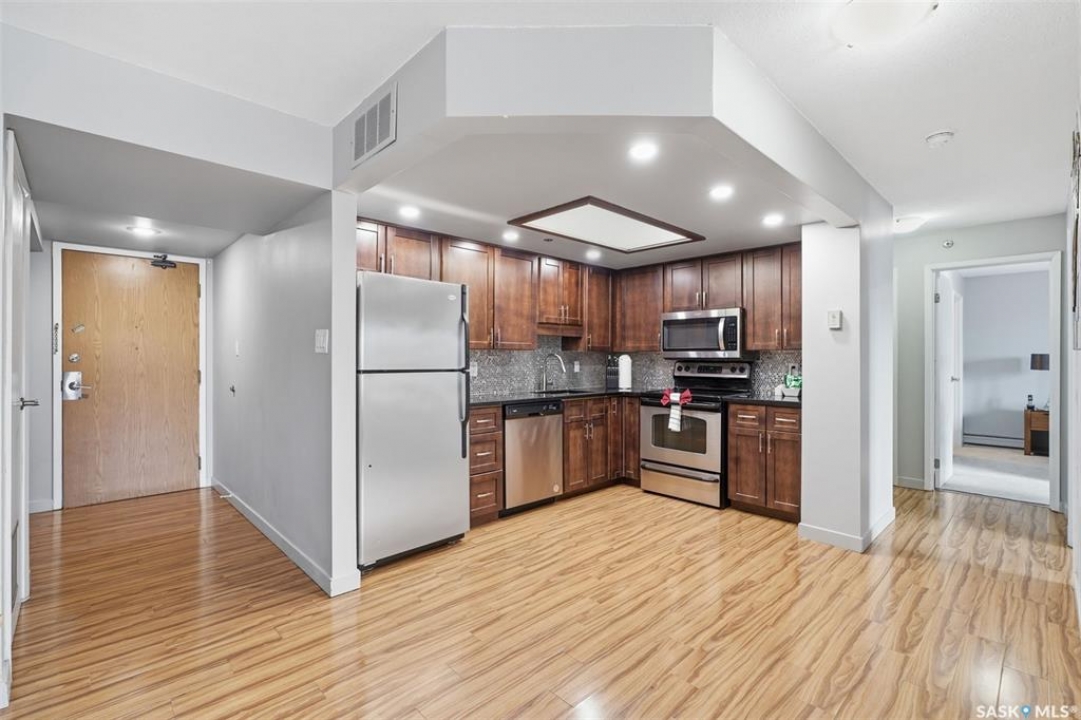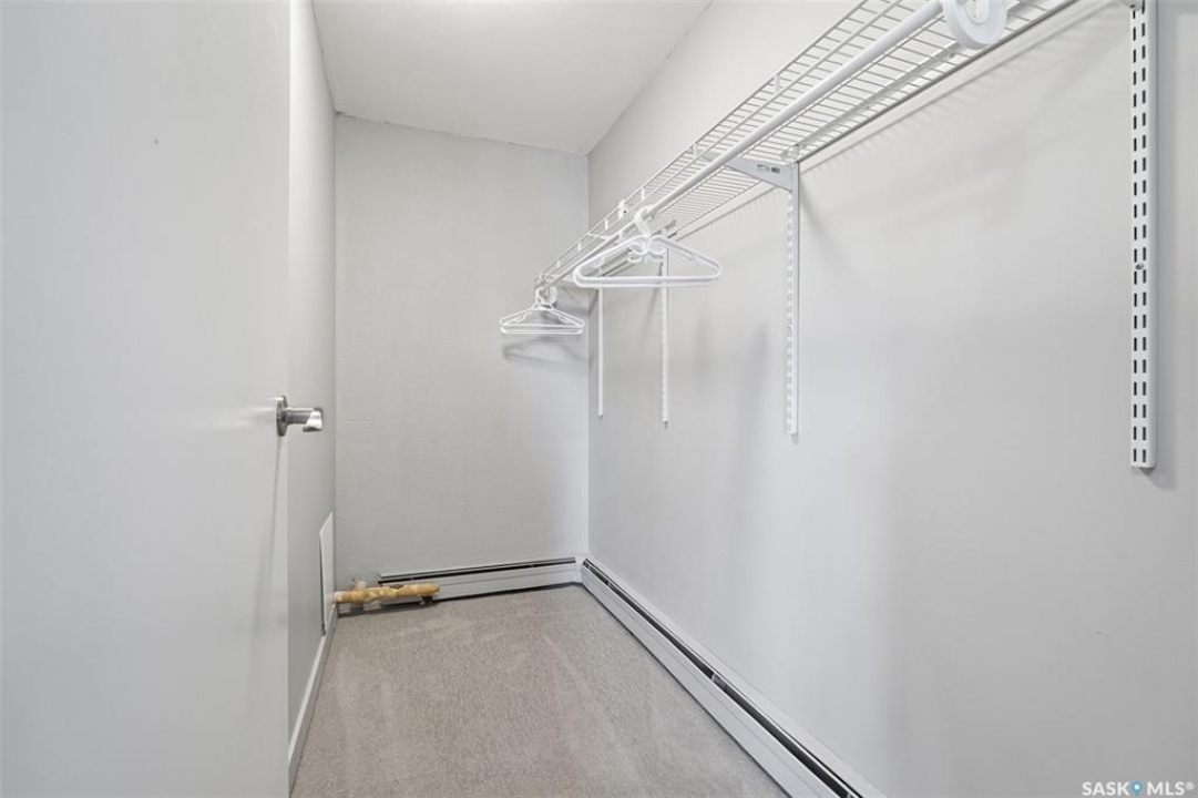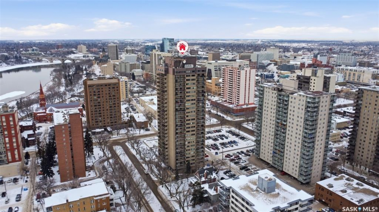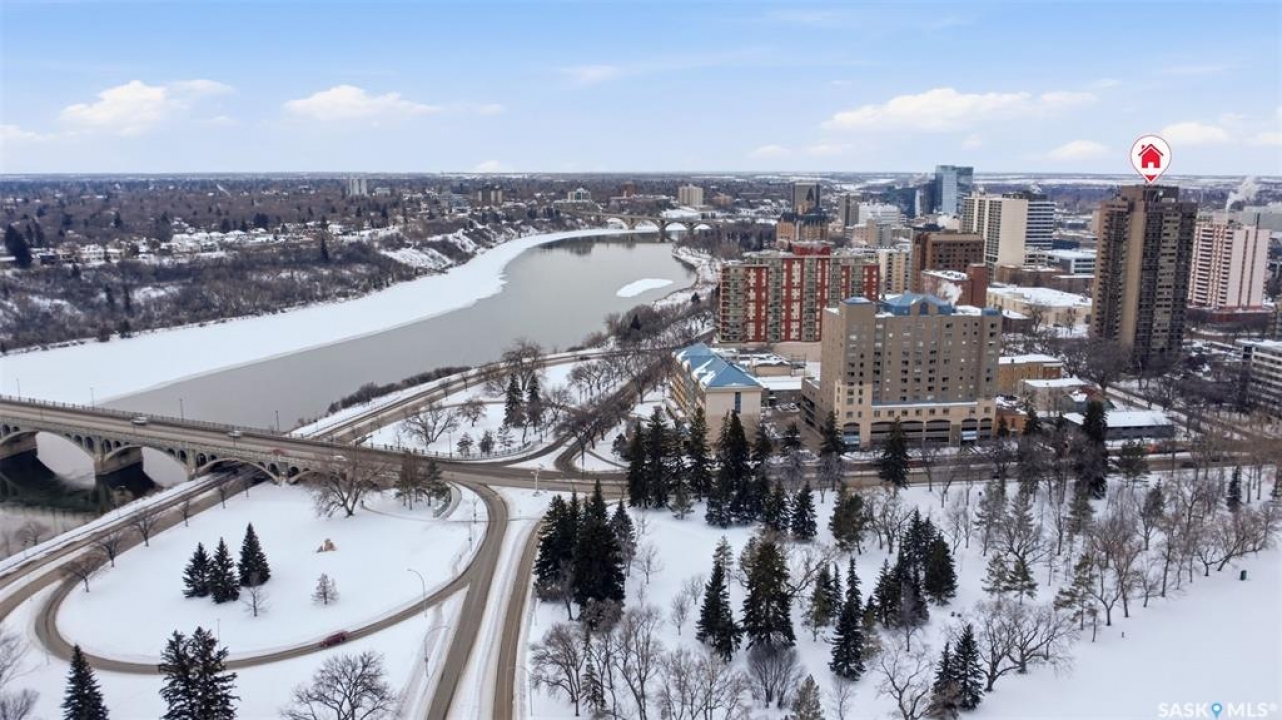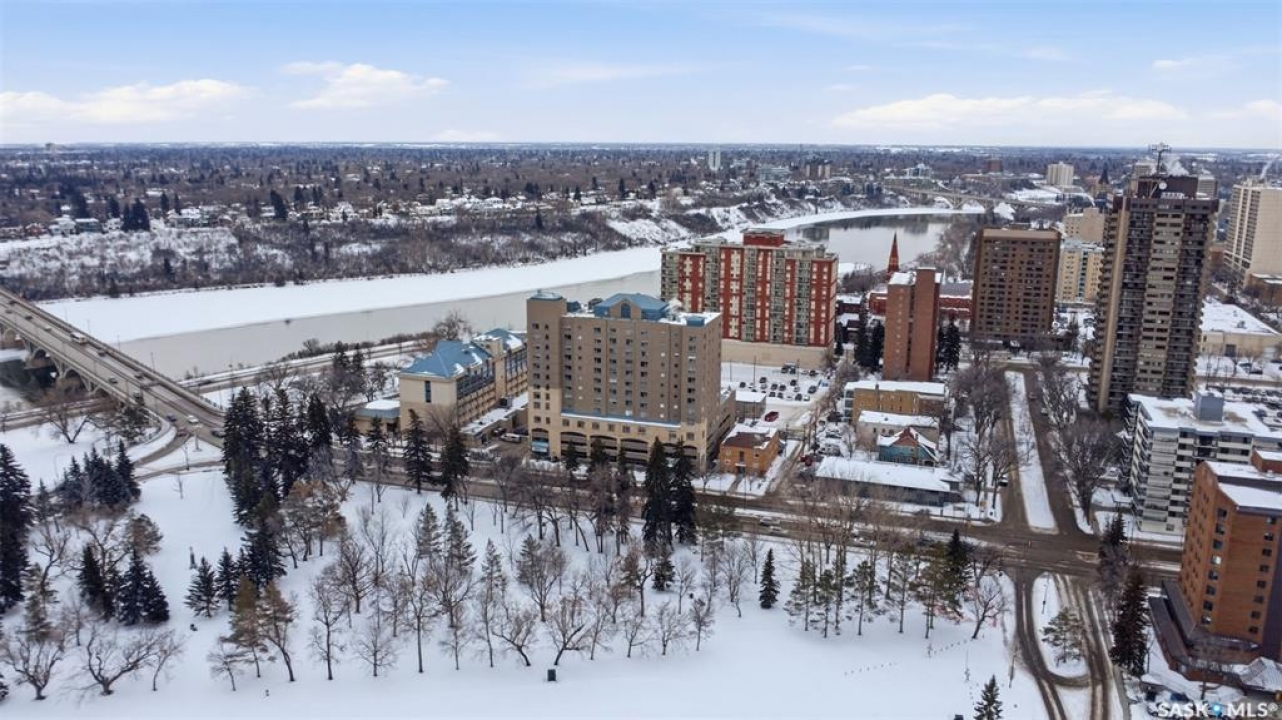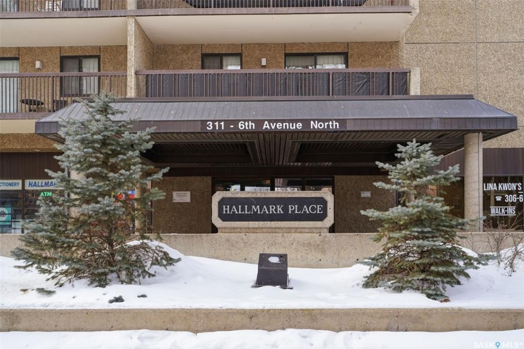 Exceptional city views with a peek of the river await from the 5th floor of Hallmark Place in the heart of Saskatoon! This well-maintained 970 sq. ft. condo offers 2 bedrooms and 1 full bathroom, all in excellent condition with a bright, open-concept layout. The kitchen overlooks the spacious living area and features a convenient breakfast bar—perfect for casual dining or entertaining. Both bedrooms are generously sized, with the spacious primary suite featuring a large walk-in closet. Freshly painted with new carpet, this move-in-ready unit also includes in-suite laundry and all appliances. Step out onto your private balcony to enjoy city skyline views along with a glimpse of the river—an ideal setting for morning coffee or relaxing evenings. Hallmark Place is a well-managed concrete building offering fantastic amenities, including an amenities room, exercise area, squash court, outdoor patio, and high-speed elevators. There's even a convenient store right at the entrance for added everyday convenience. While this unit does not include its own parking stall however the seller has secured underground rental parking if there is interest. Don't miss your opportunity to enjoy downtown living with views—call your REALTOR � today to book your private showing!