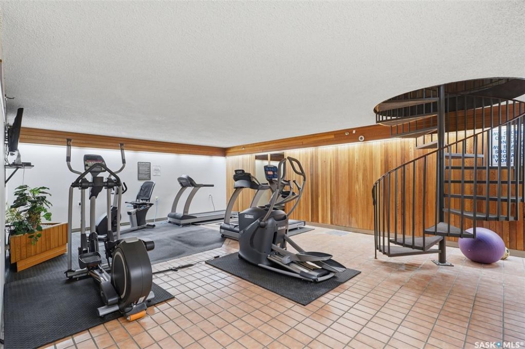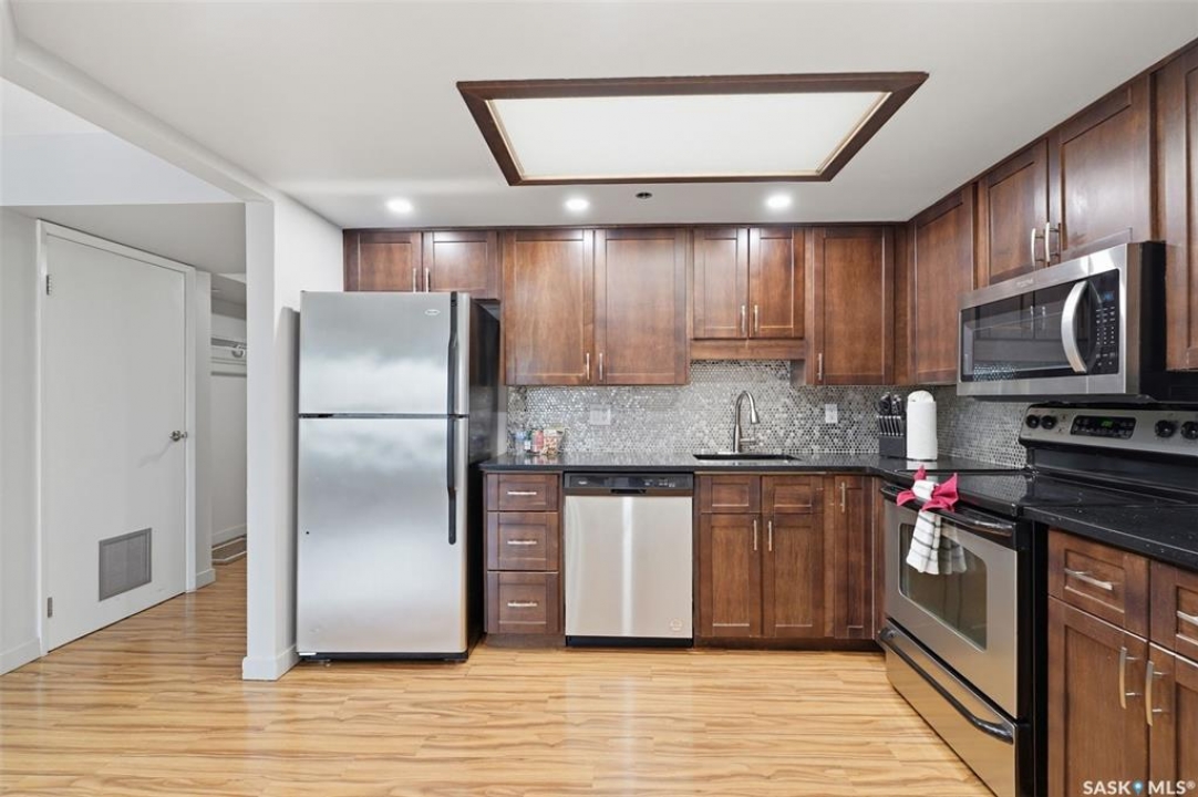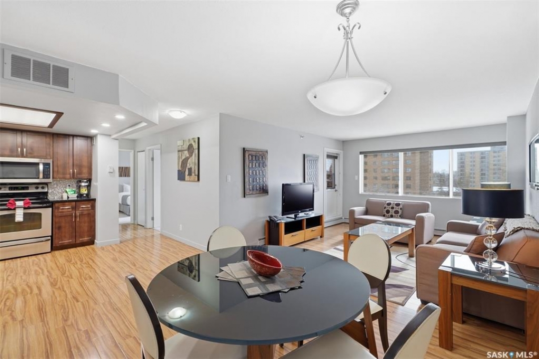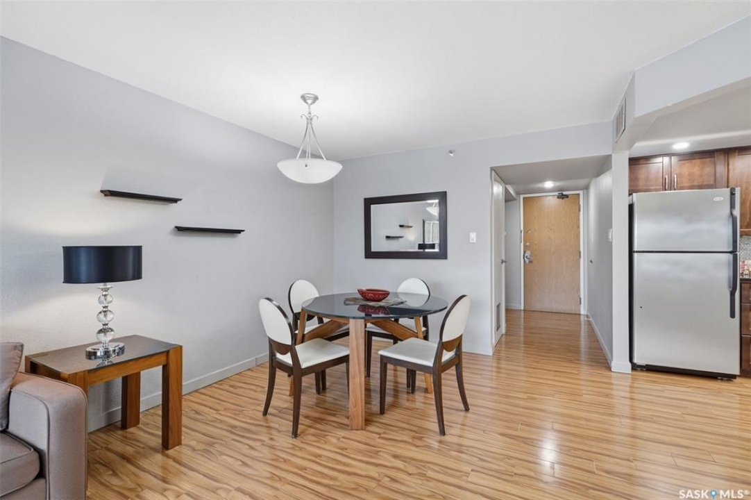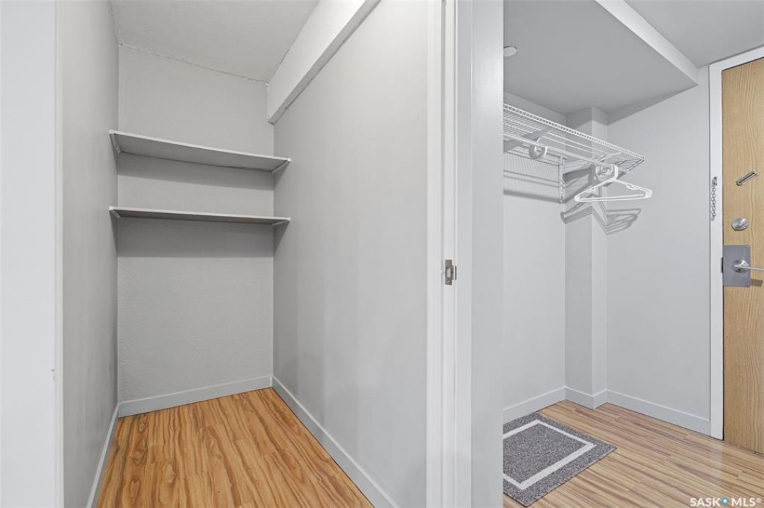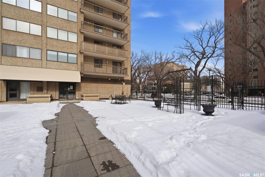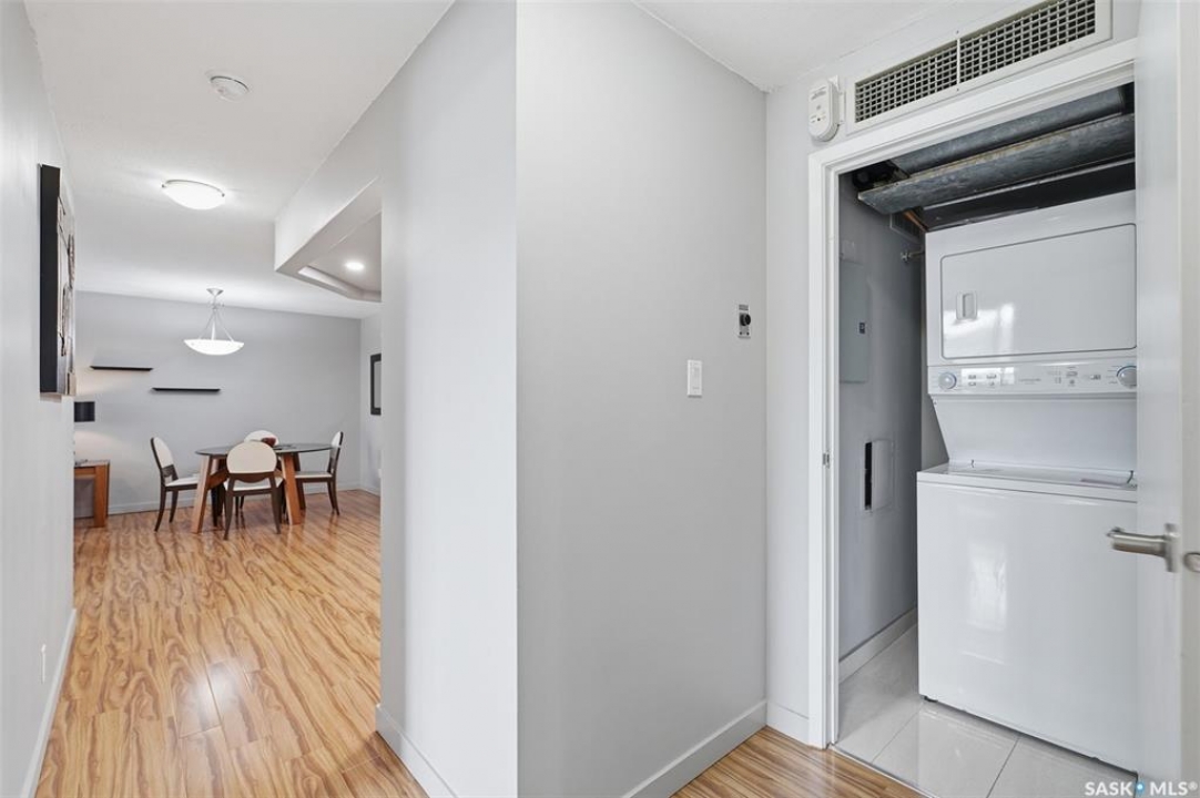 Exceptional city views with a peek of the river await from the 5th floor of Hallmark Place in the heart of Saskatoon! This well-maintained 970 sq. ft. condo offers 2 bedrooms and 1 full bathroom, all in excellent condition with a bright, open-concept layout. The kitchen overlooks the spacious living area and features a convenient breakfast bar—perfect for casual dining or entertaining. Both bedrooms are generously sized, with the spacious primary suite featuring a large walk-in closet. Freshly painted with new carpet, this move-in-ready unit also includes in-suite laundry and all appliances. Step out onto your private balcony to enjoy city skyline views along with a glimpse of the river—an ideal setting for morning coffee or relaxing evenings. Hallmark Place is a well-managed concrete building offering fantastic amenities, including an amenities room, exercise area, squash court, outdoor patio, and high-speed elevators. There's even a convenient store right at the entrance for added everyday convenience. While this unit does not include its own parking stall however the seller has secured underground rental parking if there is interest. Don't miss your opportunity to enjoy downtown living with views—call your REALTOR � today to book your private showing!