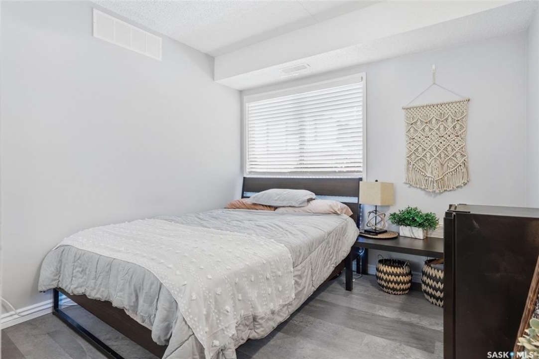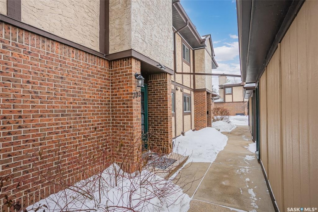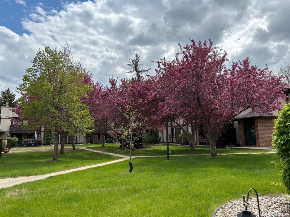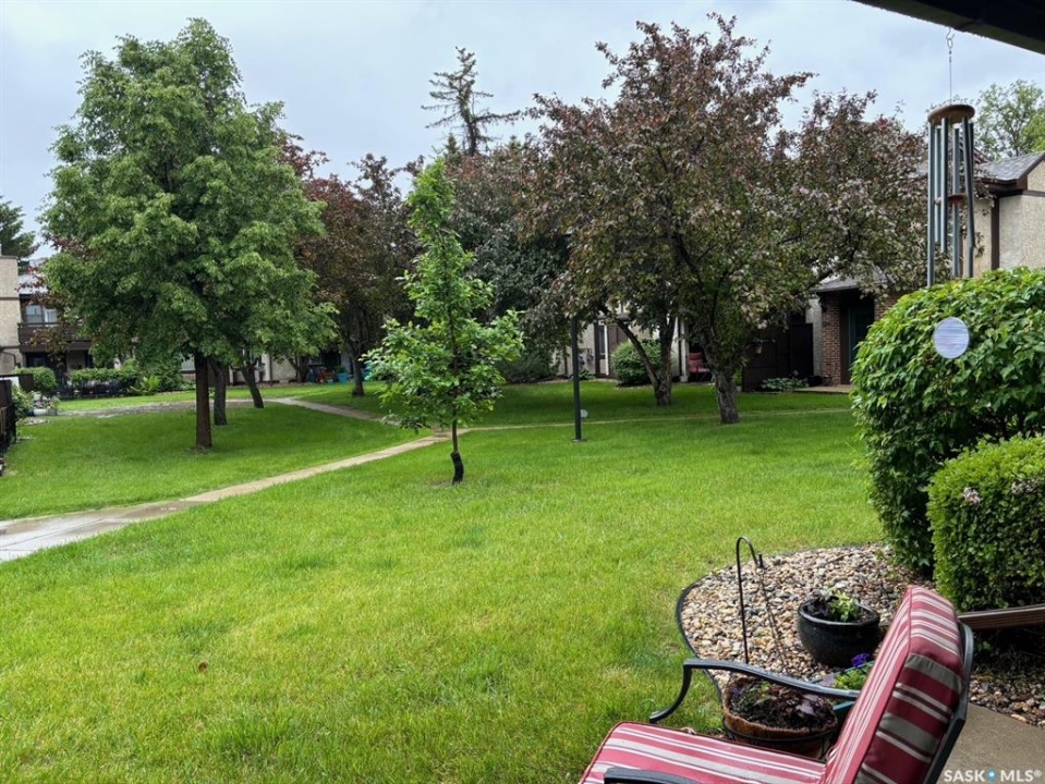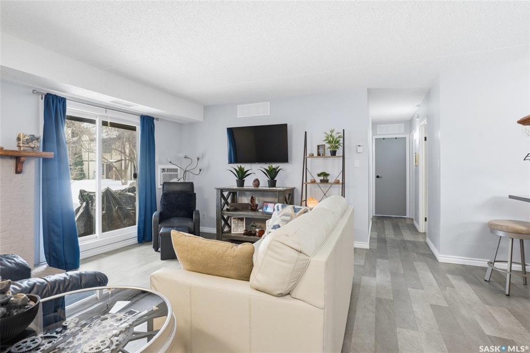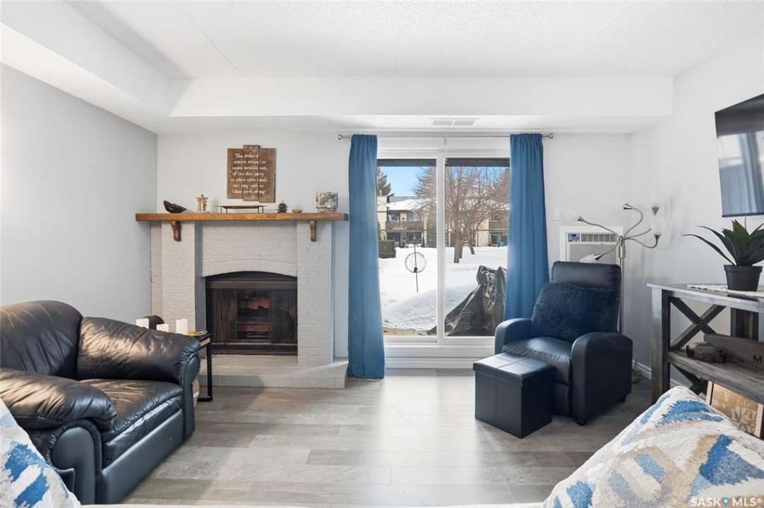 A rare opportunity awaits at River Ridge Estates — and the name truly says it all. Quietly tucked at the back of the complex, this beautifully updated main-floor condo offers the perfect blend of privacy, safety, and low-maintenance living. Even better? A detached garage sits just steps from your door — a hard-to-find feature that provides extra storage and year-round convenience. Located in a well-established community in desirable Lawson Heights, this complex is ideally positioned near schools, parks, the Meewasin Trail, shopping, the civic centre, and more. It's a setting that perfectly balances tranquility with everyday accessibility. Step outside to your private southwest-facing patio overlooking the peaceful courtyard, complete with mature trees and lush garden spaces. Inside, the modern updates shine. Upgraded flooring and fresh paint create a clean, contemporary feel throughout the open-concept layout. The kitchen is fully equipped with appliances, generous cabinetry, ample counter space, and a functional eat-up island. The dining area flows seamlessly into the bright living room, where newer patio doors and a stunning fireplace with a wood-accent mantle create a warm and welcoming focal point. An electric insert adds both comfort and ambiance. The spacious primary bedroom offers impressive square footage, a walk-in closet, and convenient access to the four-piece bathroom — a true retreat at the end of the day. An additional bedroom provides flexibility for guests, an office, or hobbies. And finally, a large storage room houses your laundry, water heater, and plenty of extra storage space. Whether you're a first-time buyer looking to step into homeownership or ready to downsize without compromise, this home checks all the boxes. The complex is pet-friendly, features a strong and established reserve fund, and offers additional parking for rent. Your search ends here — call today for more information and start packing!